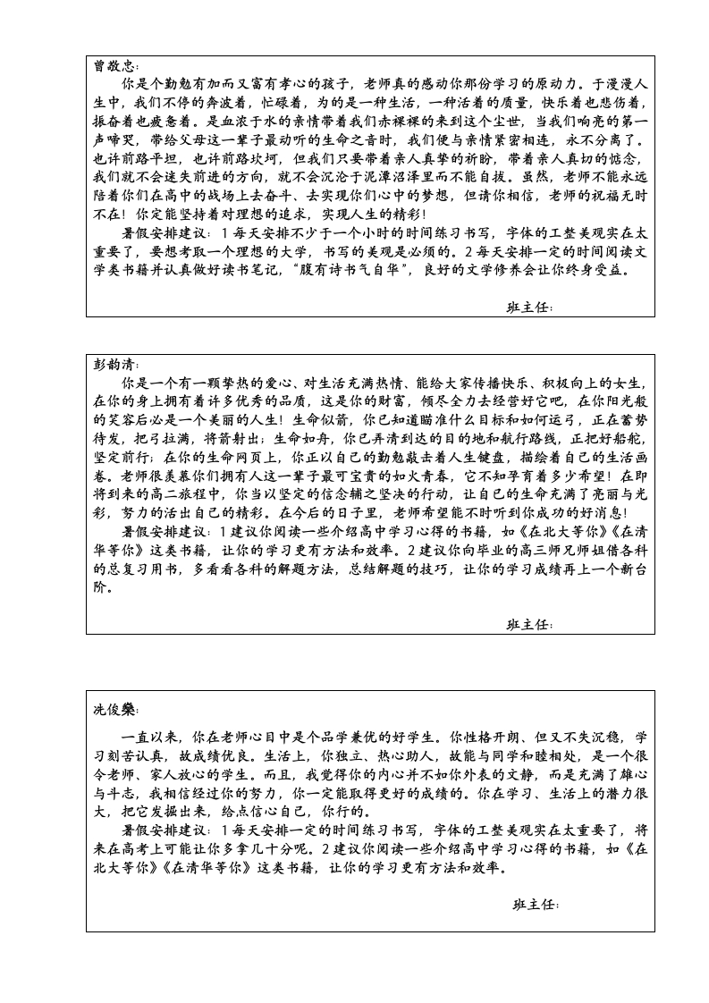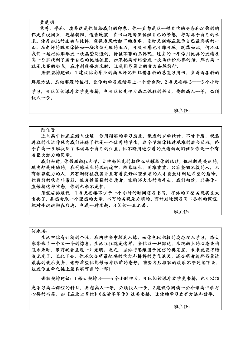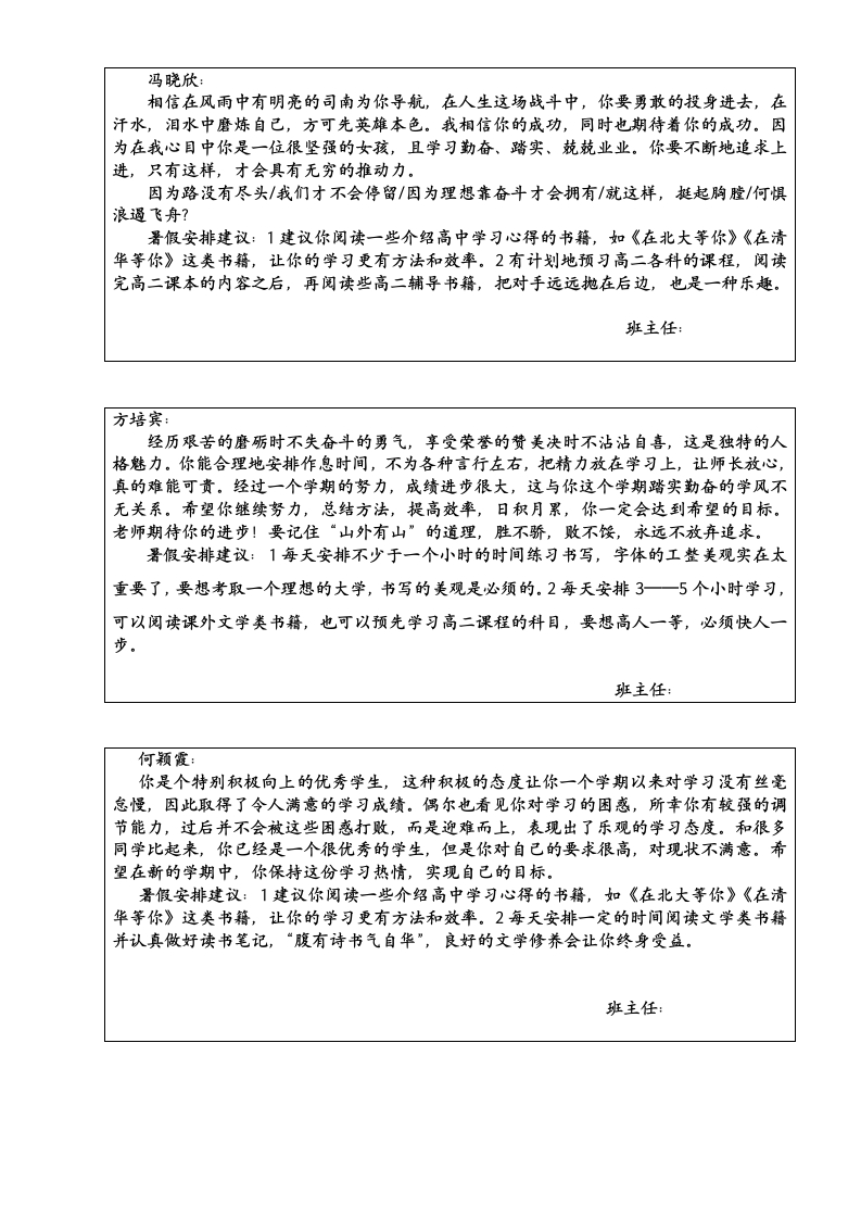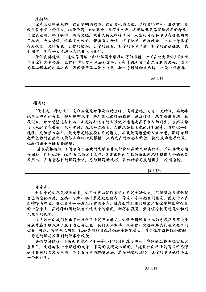 谭紫珊:有着山一般稳重的品质,与人为善,随时呈上一颗爱心,于无声处,却是默默的努力,悄然间,你已跻身于年级上游,而且还继续前行的势头,因为,在你的身上具备这种能将你推向成功的动力,它源于你对学习的信心与恒心。爱因斯坦说过:“我对于刚刚走上社会的年轻人的建议是,开始时就要有坚定的进取心和明确的目标,除非业已实现,否则绝不要轻易放弃。”进取的力量将亚伯拉罕·林肯从小木屋推向了白宫,这一成就的取得来源于坚定的进取心和明确的目标的激励。我想,如果你有足够的进取心并付之于坚韧的努力,你就一定会有个成功的人生!署假安排建议:1建议你阅读一些介绍高中学习心得的书籍,如《在北大等你》《在清华等你》这类书籍,让你的学习更有方法和效率。2有计划地预习高二各科的课程,把对手远远抛在后边,也是一种乐趣。3阅读一本文学名著。班主任:文汝良:你学习刻苦认真,踏实勤奋,坚韧是你给我最深刻的印象。与人为善,随时呈上一颗爱心,于无声处,却是默默的努力,很高兴在这个学期你有了明显的进步,这与你的努力是分不开的。古往今来,大凡出名的人都离不开“勤奋”二字,爱因斯坦曹说过,天才出于百分之九十九的汗水加百分之一的天赋,可见,成功的喜悦是用辛勤的汗水浇灌出来的,而懒惰的人大多一事无成。记住,习惯,是人类的第二个上帝,它主宰人类后天的命运。加油,你的潜力无穷,在学习上再加把劲,争取做最好的你!暑假安排建议:1建议你阅读一些介绍高中学习心得的书籍,如《在北大等你》《在清华等你》这类书籍,让你的学习更有方法和效率。2每天安排3一5个小时学习,可以阅读课外文学类书籍,也可以预先学习高二课程的科目,要想高人一等,必须快人一步。班主任:黄蔼荻:生活中你是个性格温和、待人真诚、乐于助人的好女孩。在学习上,你认真刻苦,努力进取,给老师们留下了深刻印象,是个品学兼优的好学生。马上就要攀登“高山”了,在这里老师要送你一句话:只有启程,才会到达理想的目的地;只有拼搏,才会获得辉煌的成功;只有播种,才能有收获;只有奋斗,才能品味幸福的人生。而这些在你的身上都是最好的体现!希望你在今后的人生征途上,要更善于和老师交流学习中的认识与困惑,做到这,点,你在学习的大道上定会少走许多弯路,会更快地抵达成功的彼岸!署假安排建议:1建议你向毕业的高三师兄师组借各科的总复习用书,多看看各科的解题方法,总结解题的技巧,让你的学习成绩再上一个新台阶。2有计划地预习高二各科的课程,阅读完高二课本的内容之后,再阅读些高二辅导书籍,把对手远远抛在后边,也是一种乐趣。班主任: