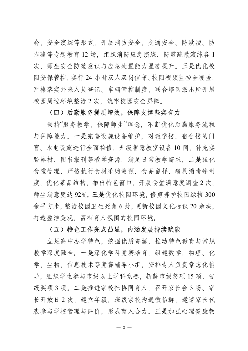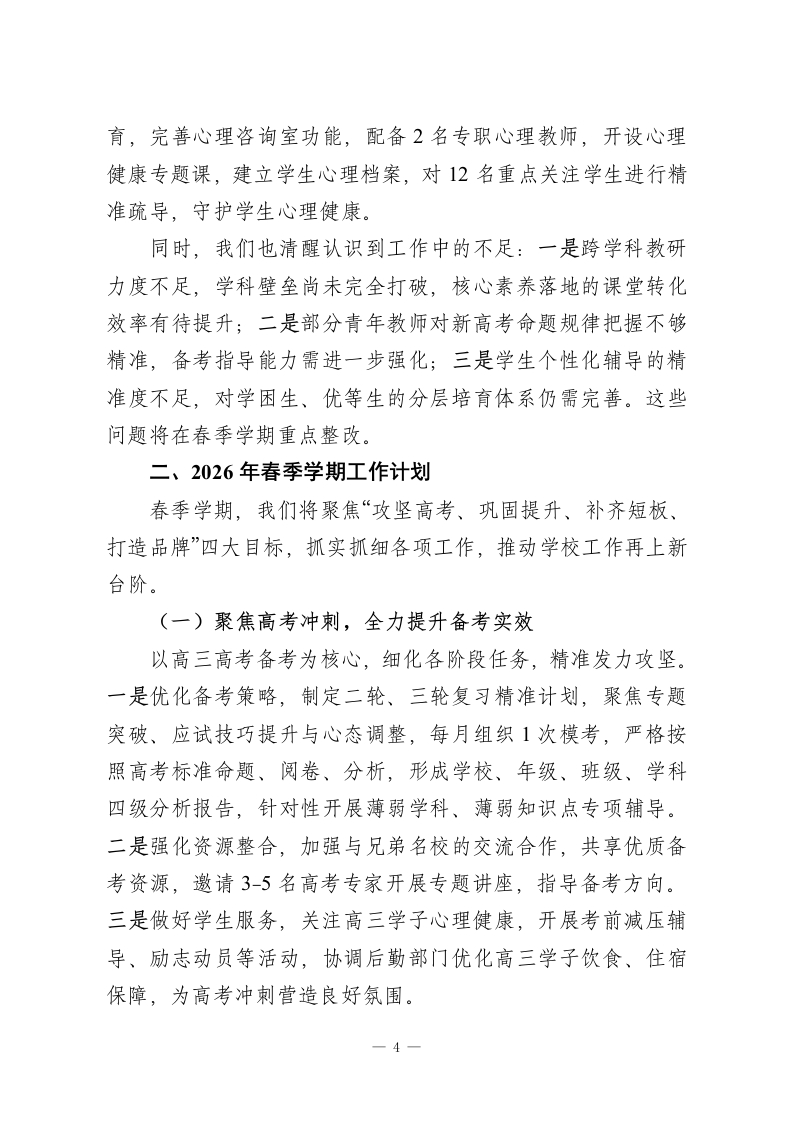 高中副校长2025年秋季学期工作复盘暨2026年春季学期工作计划各位领导、老师们:大家好!2025年秋季学期,在学校党总支的坚强领导下,全体教职工凝心聚力、真抓实干,紧扣高中教育教学核心任务,围绕“提质增效、内涵发展、守正创新”的工作主线,扎实推进各项工作落地见效,圆满完成了既定目标。2026年春季学期,是承前启后、攻坚突破的关键学期,尤其关乎高三学子高考冲刺、高一高二学情巩固提升。我们将总结过往经验、补齐发展短板,以更精准的举措、更务实的作风,推动学校教育教学事业高质量发展。现将具体情况汇报如下:一、2025年秋季学期工作复盘总结秋季学期,我们聚焦“筑牢基础、凸显特色、强化保障”三大核心,各项工作均取得阶段性成效,为全年工作闭环筑牢根基。(一)教学教研深耕细作,育人质量稳步攀升始终将教学质量作为核心生命线,以新课程、新高考改革为导向,推动教研与教学深度融合。一是规范教学常规管理,教务处牵头细化备、教、辅、改、批、测各环节标准,实行“每周抽查、每月普查、期末总评”机制,累计开展教学常规检查4次,整改教案不规范、作业批改不到位等问题18项,确保教学流程闭环。二是强化集体教研效能,推行“教研组牵头、备课组落实”的教研模式,围绕新高考命题趋势、大单元教学设计、分1