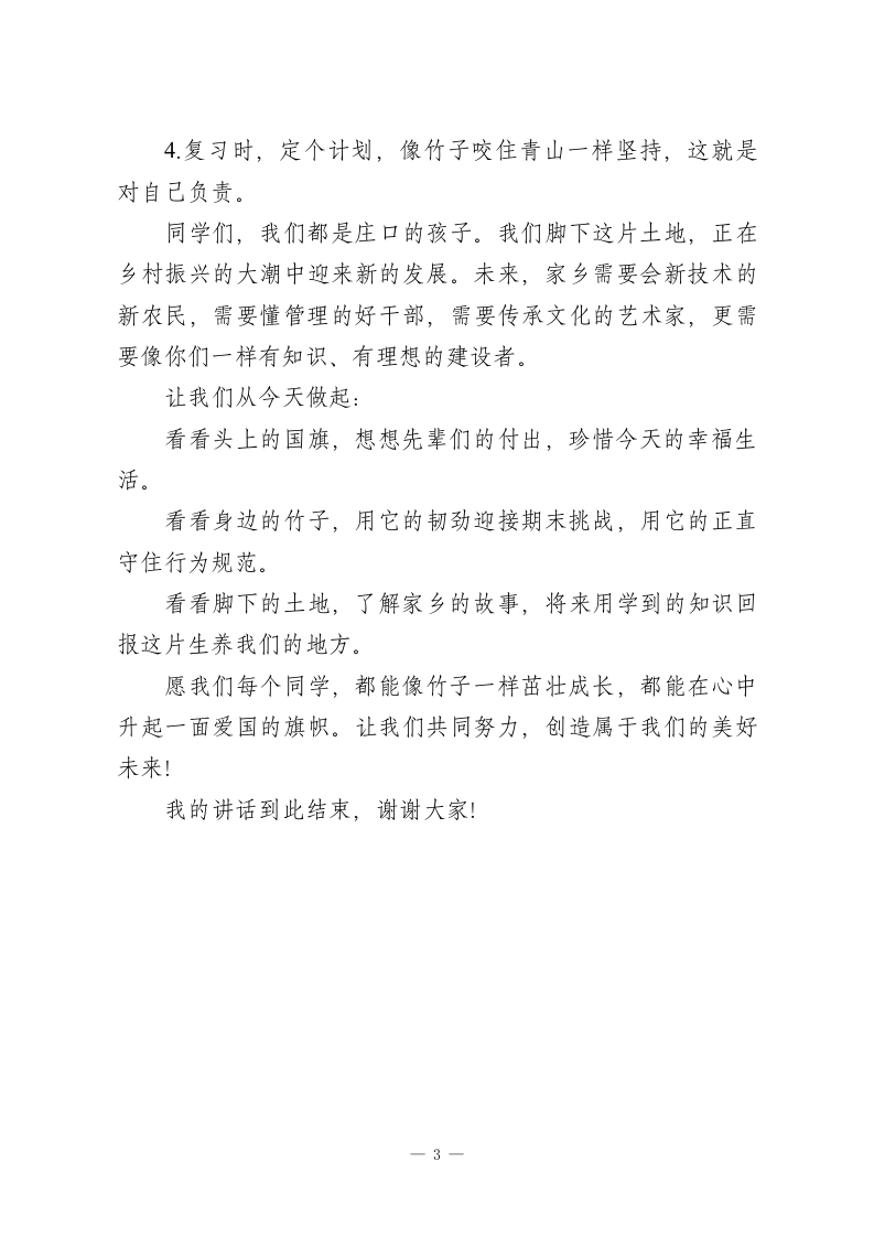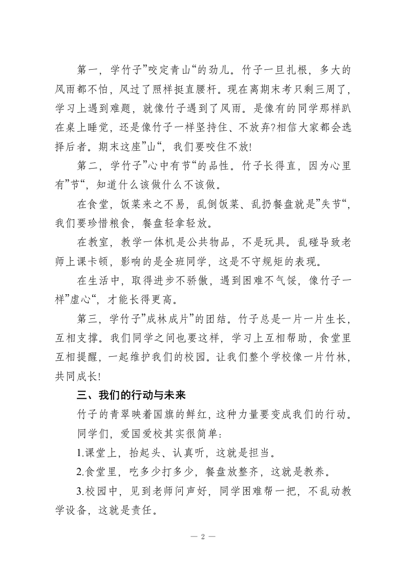 国旗下的微党课:竹影映旗守信仰,薪火相传向未来老师们,同学们:大家上午好!晨光正好,国歌嘹亮。今天,当我们仰望着这面徐徐升起的五星红旗,我想和同学们聊聊我们身边两样特别熟悉的事物一一校园里高高飘扬的五星红旗,还有我们校园随处可见的竹子。一、我们的红色记忆每天早上,当国歌响起,看着国旗升起,同学们有没有想过:为什么国旗这么红?这份红,是一百多年前,一群只比我们大十来岁的哥哥姐姐们用青春点燃的。那时的中国积贫积弱,是他们怀着一腔热血,找到了救国的真理。从井冈山到长征路,再到延安,无数先辈用生命换来我们今天的美好生活。大家可能不知道,这份红色记忆离我们特别近。我们校园的台阶旁,就刻着我们庄口自己的红色故事:”红心向党,送郎参军“”抚育红军儿子的妈妈“…还有我们庄口籍老红军赖华的革命经历。这些不是书上遥远的故事,而是发生在我们家乡的真实历史。二、学竹子,做最好的自己同学们都知道我们的校训:”胸怀大志有成竹,咬定青山不放松“。竹子看起来很普通,却有很多值得我们学习的地方。-1