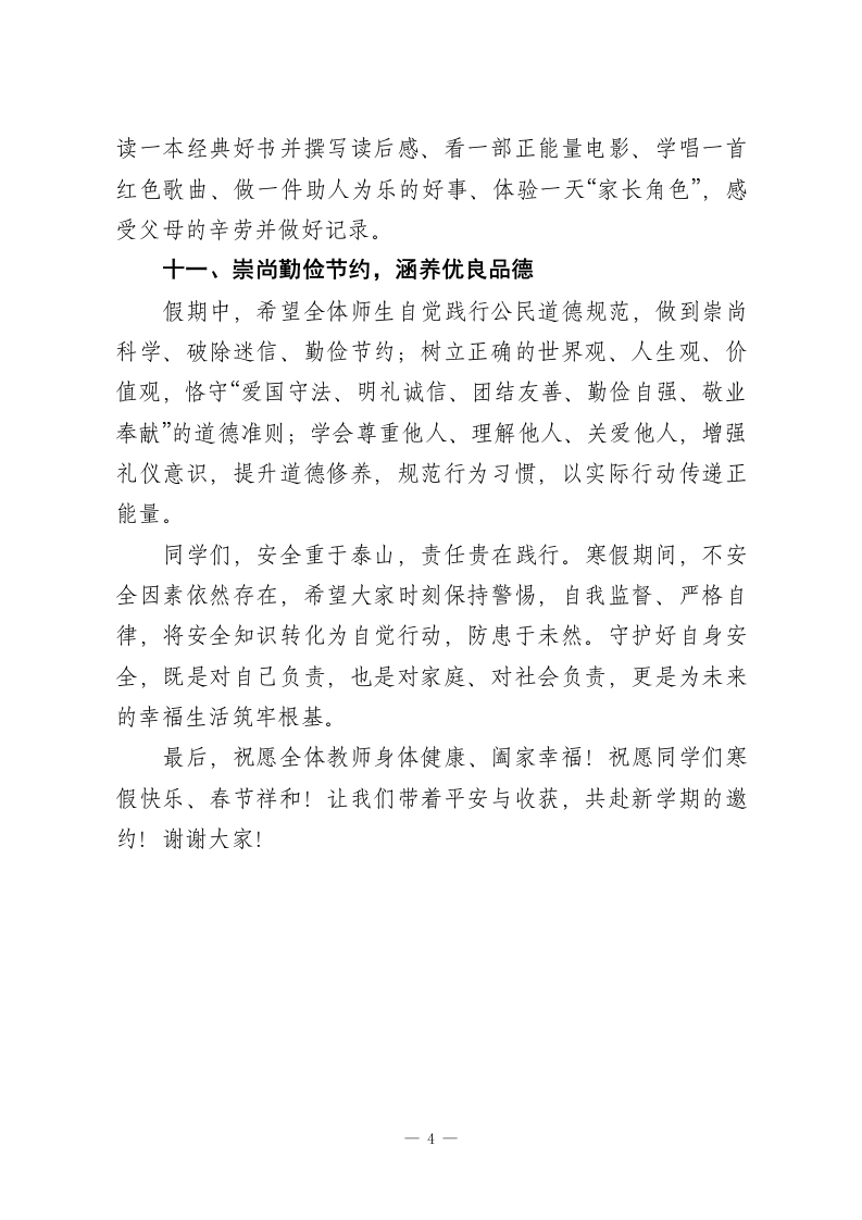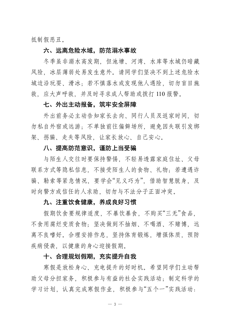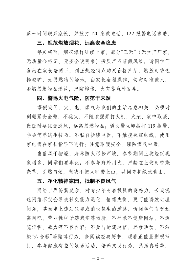 寒假春节安全教育大会,副校长讲话:守牢安全底线,畅享样和假期老师们,同学们:春节日渐临近,寒假的序幕即将拉开。为了让全体师生度过一个平安、快乐、文明、祥和的假期,今天我们齐聚于此,开展寒假前的安全教育。安全是一切美好假期的前提,关乎每一个家庭的幸福,下面我将从11个方面,与大家重温安全准则、明确假期注意事项:一、筑牢安全防线,守护生命底线老师们、家长们最牵挂的,莫过于大家的健康与安全。据统计,每年因各类意外事故,数以万计少年儿童不幸离世一这相当于每天在中国大地上,就有一个班级的孩子永远离开校园(重大自然灾害除外)。这些数字背后,是无数家庭的破碎与伤痛。因此,“安全第一”必须深植于心、外化于行:安全从自我做起,从点滴小事做起;关注安全就是关爱生命,我们要做到“我要安全、我懂安全、我守安全”,让“时时讲安全、事事讲安全、人人讲安全”成为假期的行动自觉。二、严守交通规则,平安出行相伴春节是走亲访友的高峰期,也是交通安全事故的易发期。希望同学们务必遵守交通法规:未满规定年龄严禁骑行摩托车、电动车,自行车骑行需靠右侧通行,不逆行、不载人;坚决杜绝在公路上追逐打闹、嬉戏玩耍。乘车时要擦亮双眼,不乘坐报废车、无牌无证车、超员拥挤车;若不慎遭遇交通事故,要1