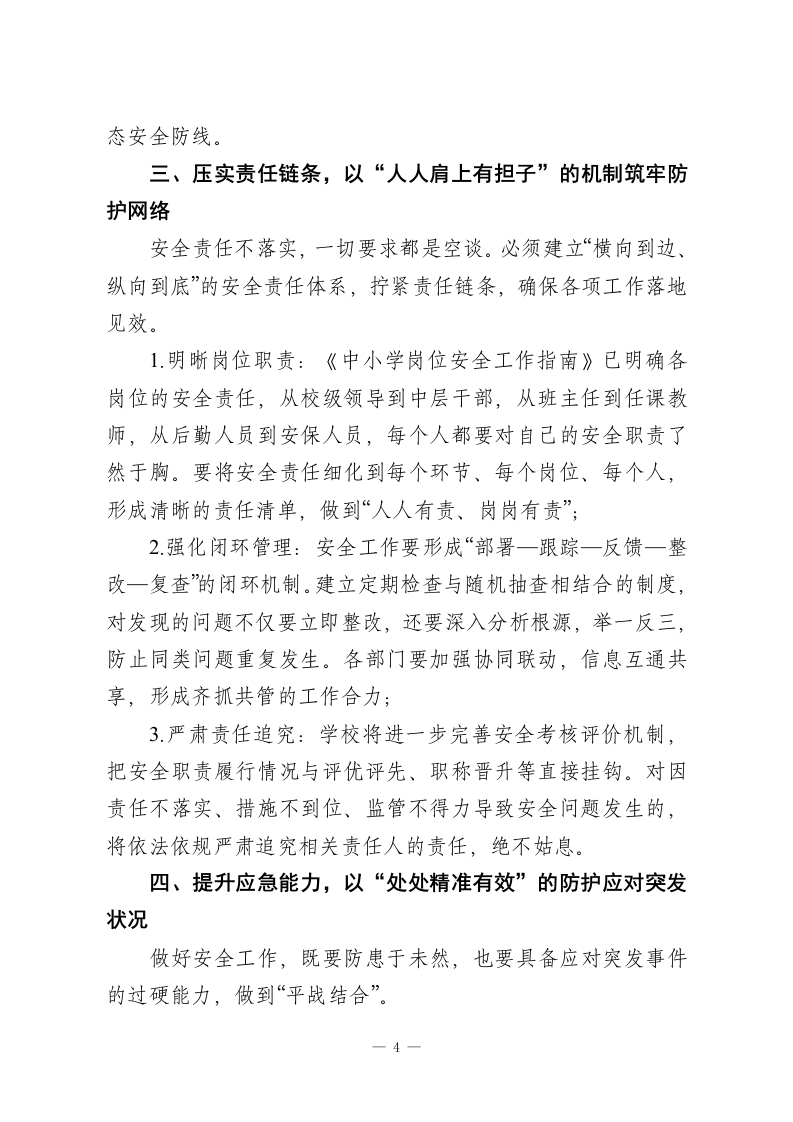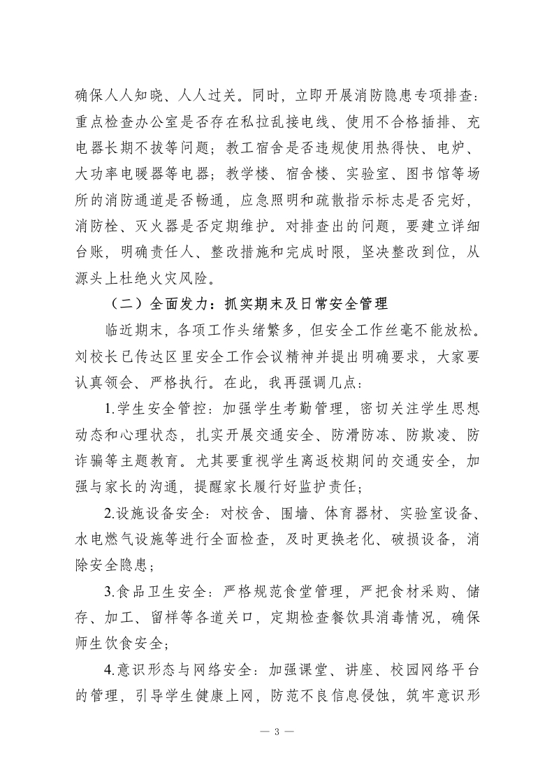 寒假前全体教职工安全培训会校长讲话:期末安全不松懈,筑牢防线护平安各位老师、同志们:大家好!今天我们专门召开全体教职工安全培训会,这既是常规的工作部署会,更是一次关乎校园稳定、师生平安的警示反思会与能力提升会。安全是学校发展的生命线,是教育教学工作正常开展的前提,直接关系到每一位学生的健康成长、每一个家庭的幸福安宁,更影响着社会的和谐稳定。因此,我们必须始终将校园安全置于首要位置,时刻保持警醒。本次会议的核心目的,就是通过系统学习、深入反思和明确要求,进一步强化全体教职工的安全责任意识,提升应急处置能力,共同筑牢校园安全的坚固防线。下面,我结合当前形势和学校实际,讲四个方面的内容。一、汲取惨痛教训,以“时时放心不下”的责任感绷紧安全之弦近期,全国多地发生的校园安全事故,尤其是河南方城英才学校的火灾事故,以极其惨痛的代价给我们敲响了警钟。这些事故暴露出的核心问题,在于思想麻痹、责任悬空、措施不实。这警示我们,安全隐患从不会因“校园是育人之地”就主动远离,风险可能潜伏在每一个细节中一一一根私拉的电线、一个违规使用的电器、一次疏忽的安全检查、一个模糊的逃生指示牌,都可能成为安全事故的导火索。1
