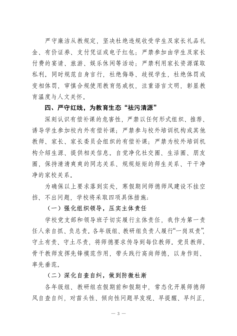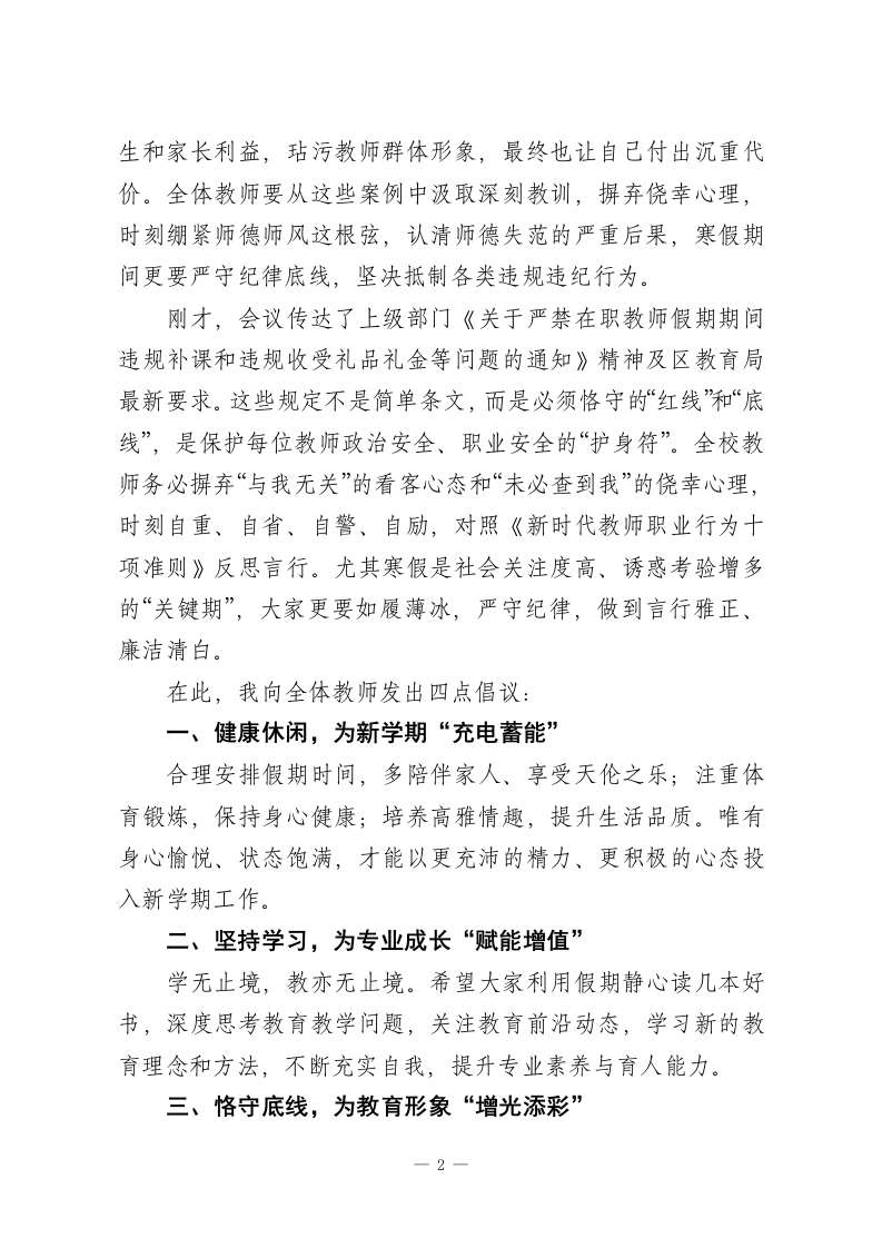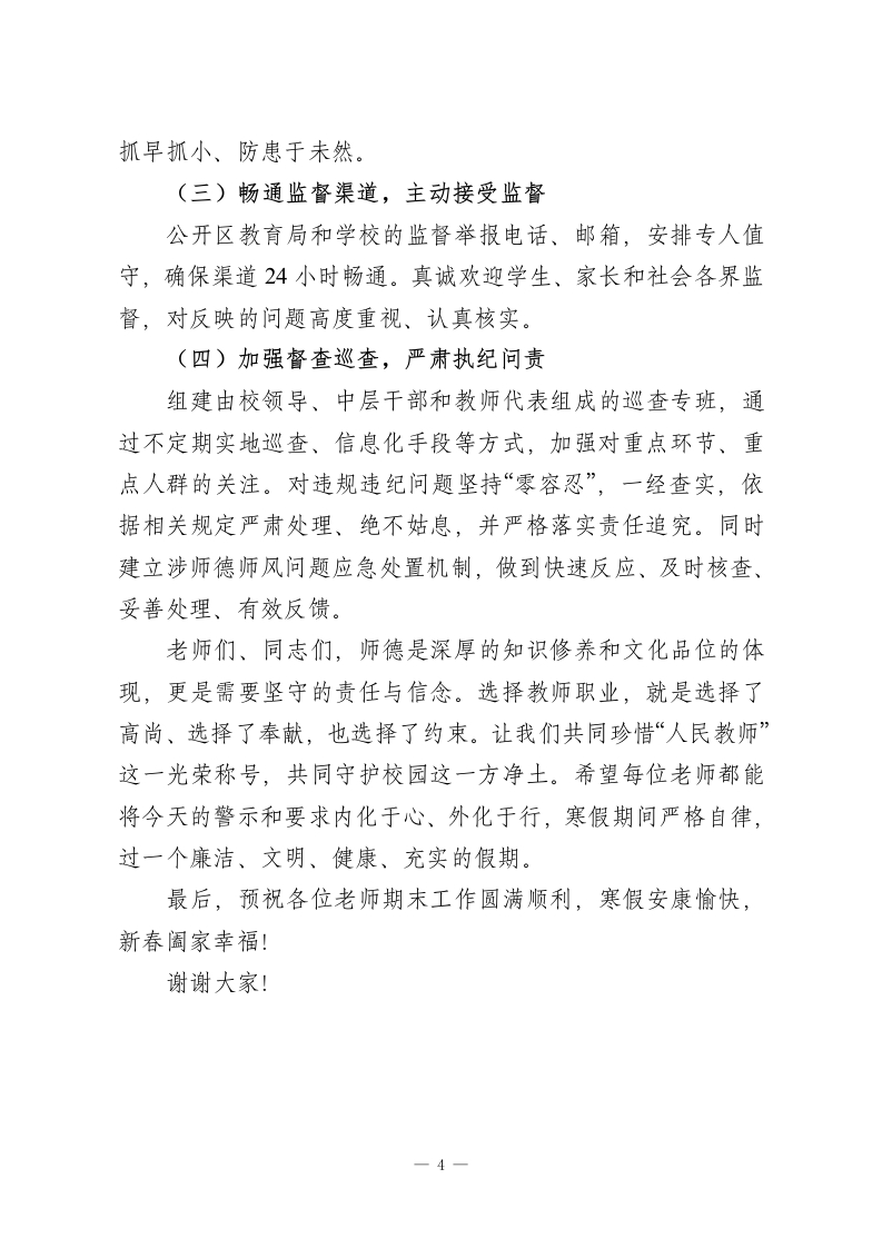 寒假师德师风警示教育会:守住底线不越界,清廉过好假期尊敬的各位老师、同志们:大家好!寒假将至,为持续加强教师队伍建设,筑牢全体教职工的思想道德与纪律防线,营造风清气正的育人环境,今天我们召开全体教师师德师风专题学习暨警示教育大会。这既是寒假工作部署会,更是纪律提醒会、灵魂警醒会。核心目的只有一个:为大家坚守的师德底线敲响警钟,为校园净土筑牢堤坝,确保每位老师都能过一个安心、舒心、清正的假期,以饱满精神面貌和纯粹育人初心迎接新学期。教育的根本任务是立德树人,教师是立教之本、兴教之源。师德师风是评价教师队伍素质的第一标准,关系到每个孩子的健康成长、千万家庭的幸福福祉,更关乎社会风气与未来。我校历来高度重视师德师风建设,广大教师爱岗敬业、廉洁从教,赢得了学生、家长和社会的广泛赞誉,这是我们最宝贵的财富和底气。但我们必须清醒认识到,师德建设永远在路上,容不得丝毫松懈。近年来,各级教育主管部门三令五申强调师德师风的极端重要性,持续加大整治力度。近期教育领域通报的典型案例,触目惊心、发人深省。个别教师理想信念动摇、规矩意识淡薄,违规组织有偿补课、收受礼品礼金、接受家长宴请,或出现不当教育言行,这些行为严重背离教师职业操守,损害学1