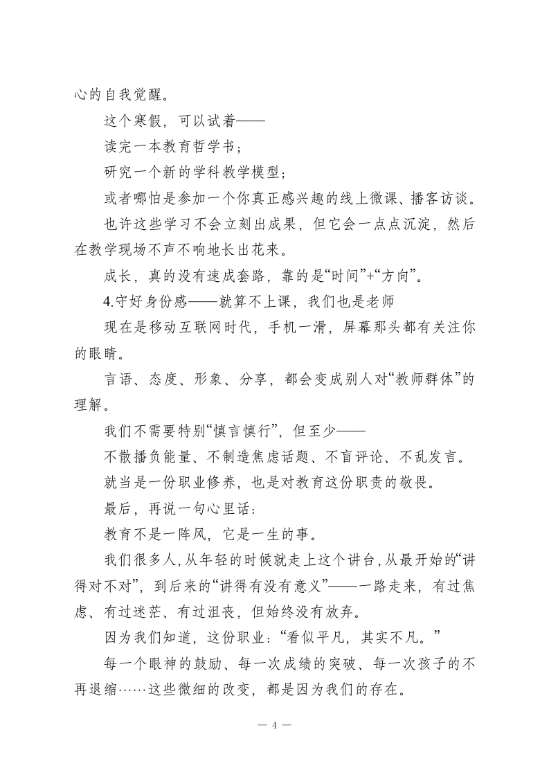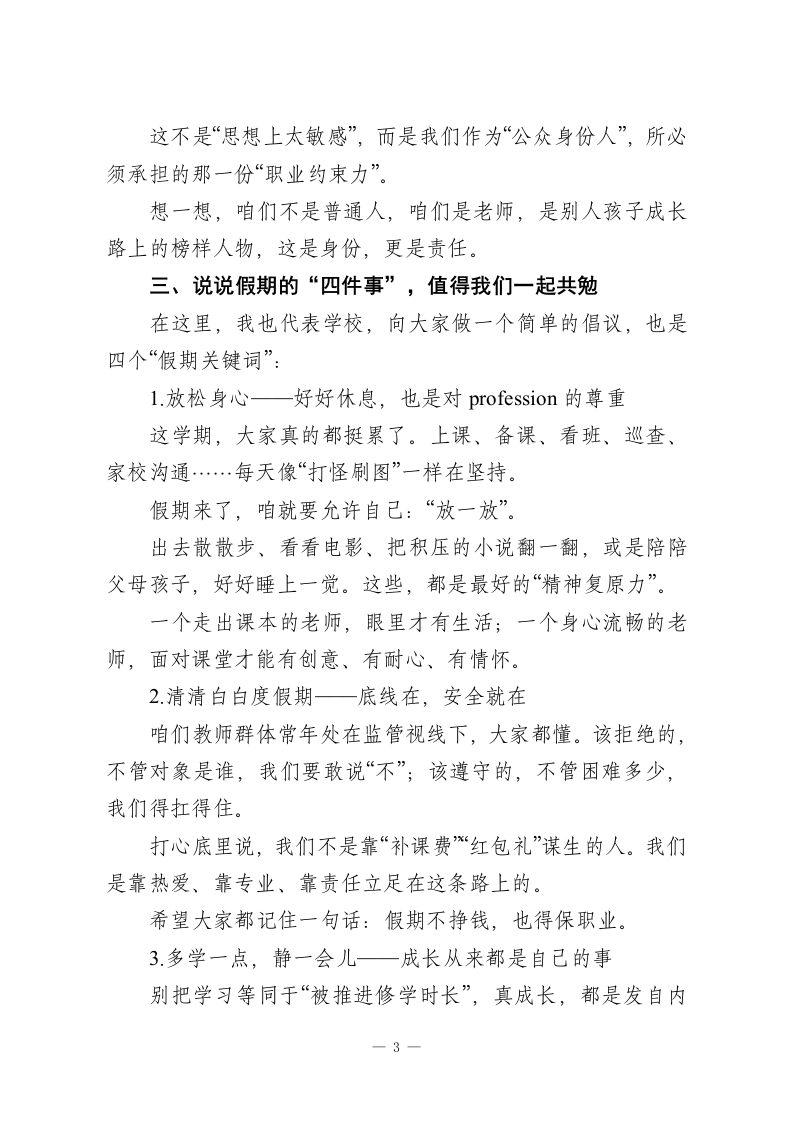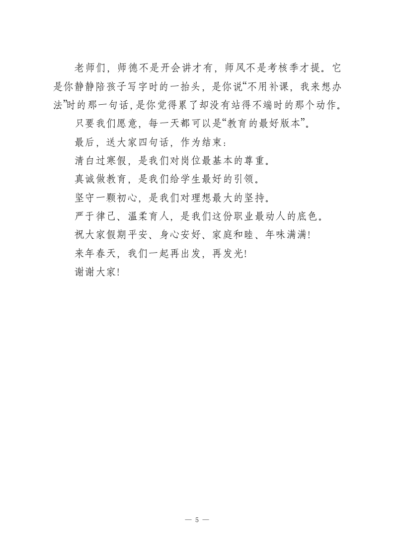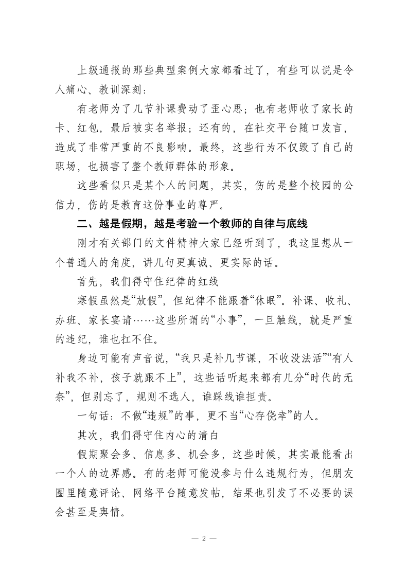 寒假师德师风警示教育会:筑牢师德防线,清廉护航寒假!尊敬的各位老师,亲爱的同仁们:大家好!寒假马上就要到了,在放假之前,我们临时部队还能聚一聚,今天这场会不是单纯地安排工作,更是一次提醒,一次叮嘱,也是一次心与心之间的沟通。今天的会议主题很明确:“师德师风专题学习+警示教育”。乍一听有些严肃,但其实说到底,我们要做的,就是再次给自己提个醒一一守好底线、稳住初心、照亮岗位。学校之所以开这样一场会,说到底是希望大家都可以过一个安心的假期、一个干净的假期,也为来年蓄好力、鼓好劲。一、这一年,值得肯定,也值得警醒教育的真正使命是立德树人,而老师,是这个使命的第一承载者。师德是什么?不是写在墙上的话,不是考核表格的内容,而是一个教师每天言行举止中展现出来的温度与底线、责任与分寸。我们学校历来非常重视师德师风建设,这些年,大家的表现也确实给力。我们看到越来越多的“用心教学”、越来越多的“学生点赞”、也有越来越多的家长在朋友圈夸老师,这些,都是沉甸甸的认可。但我们也要清楚,“师德师风”这四个字,永远不是说一说就好、听一听就够的事。它必须一直被提醒、时常被反思。一1