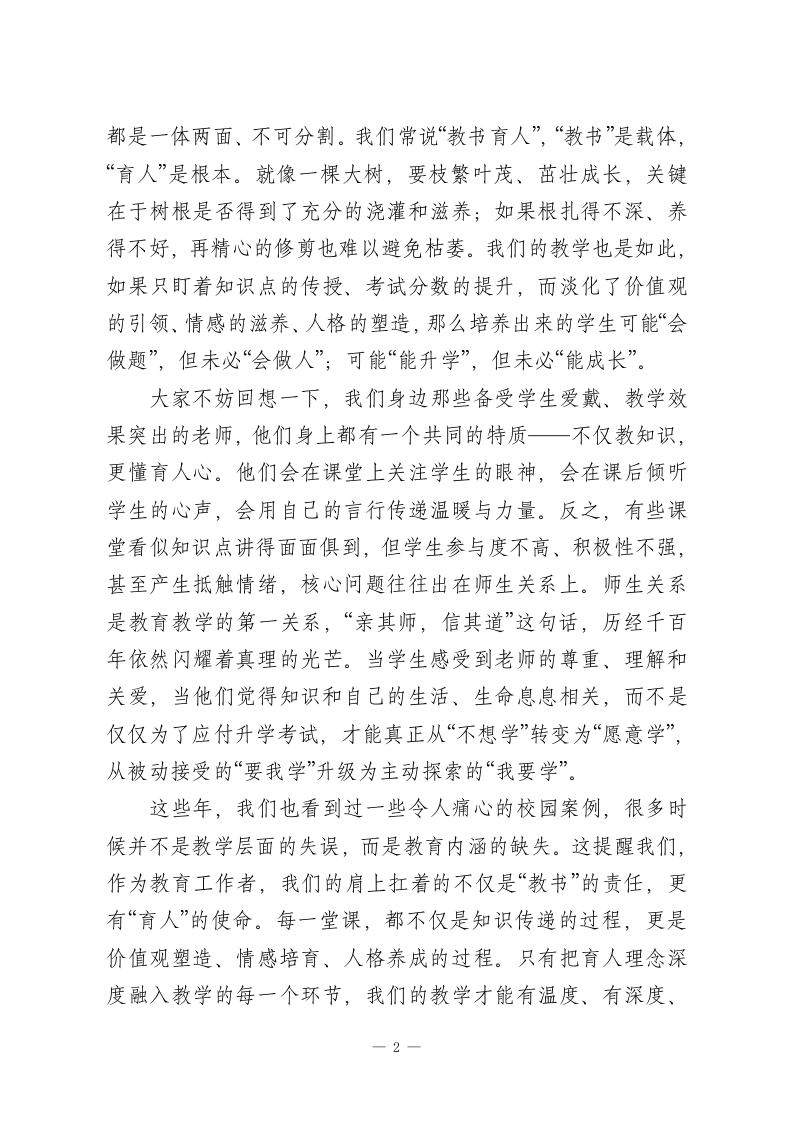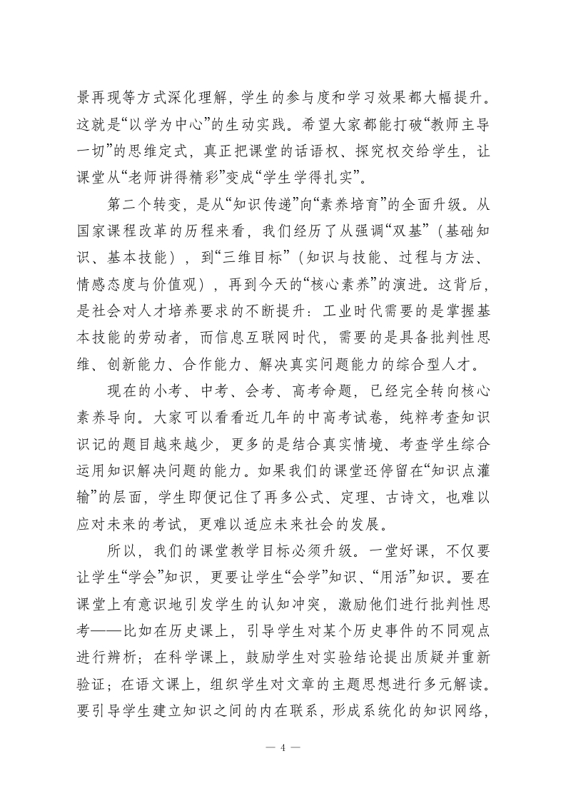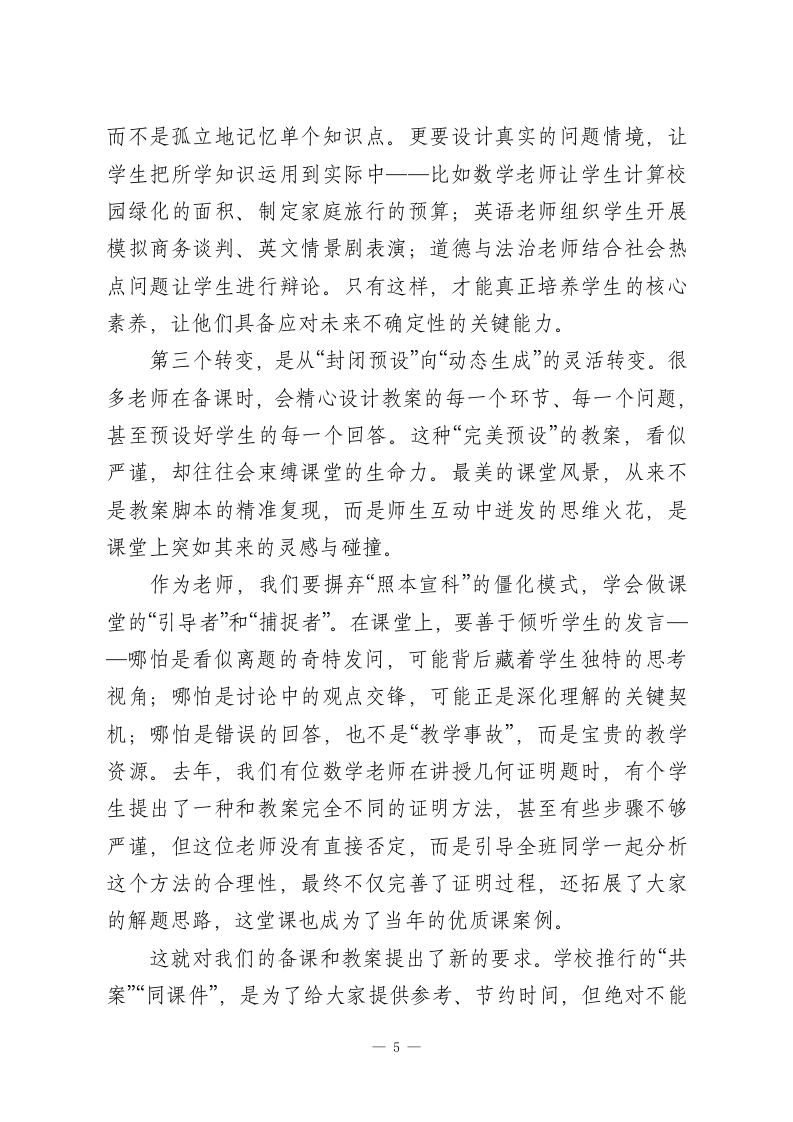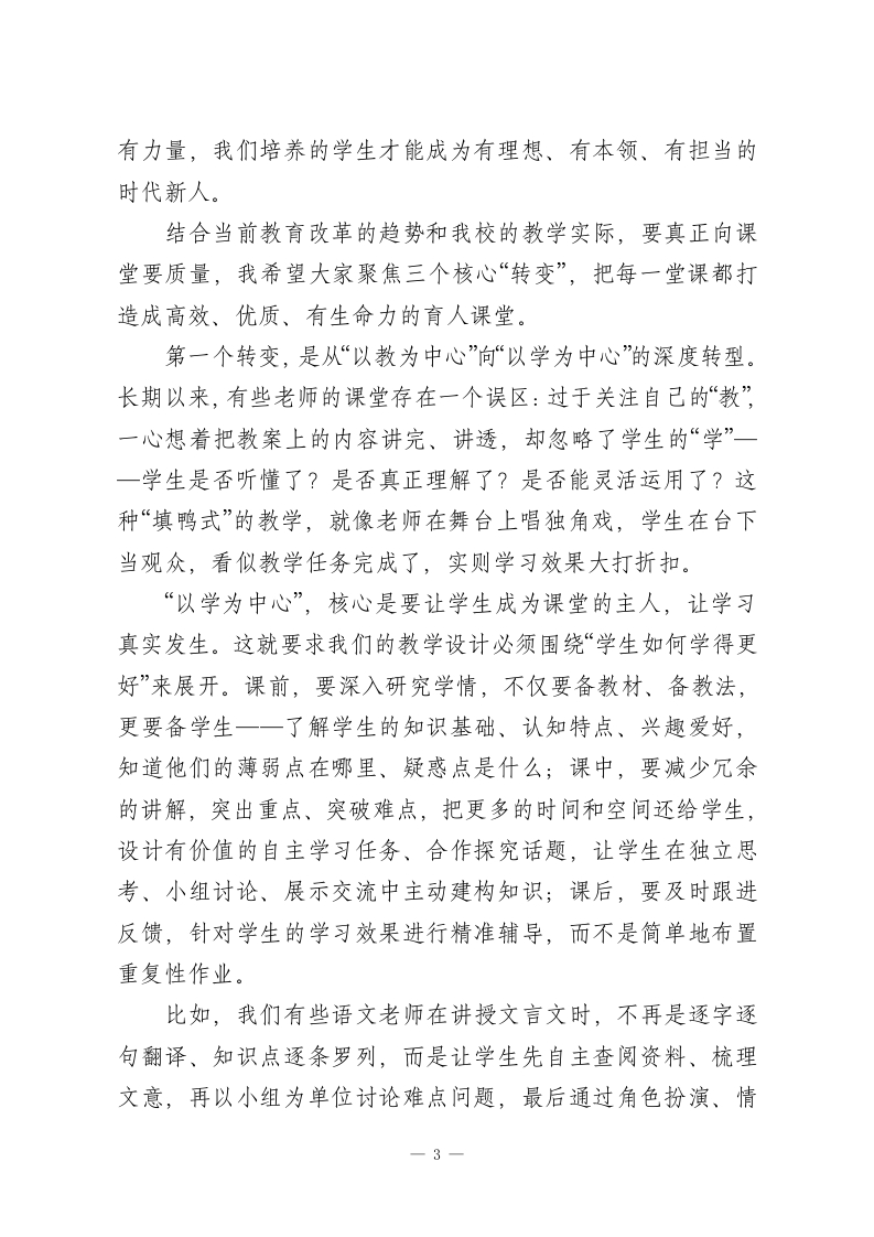 教学副校长在全体教师会上的讲话:提升教学质量关键在课堂各位老师:大家下午好!今天我们齐聚一堂,核心议题只有一个一一深耕课堂主阵地,全面提升教学质量。教育是国之大计、党之大计,而教学质量,是我们学校的立校之本、发展之魂。这些年来,学校始终把提升教学质量放在核心位置,我们一起在师资队伍建设上发力,组织了各类校内外培训、教研交流,不少老师在专业成长的道路上取得了显著进步;我们持续更新教学设施,从多煤体教室到智慧教学设备,从图书资源到实践器材,都在为大家的教学提供更坚实的保障;我们也在评价体系改革、课程资源开发、后勤服务保障等方面不断探索优化,每一项举措,每一份投入,都凝聚着大家的心血,也承载着学校对教育高质量发展的追求。但我们必须清醒地认识到,所有这些努力的最终落脚点,都离不开“课堂”这两个字。课堂是教学生产的“育人”车间,是教育理念与教学实践深度碰撞的熔炉,是师生生命价值交互共生的主阵地。离开了高效优质的课堂,再完备的设施、再丰富的资源,也难以转化为学生实实在在的成长。所以今天,我想和大家深入探讨:如何让我们的课堂真正成为提升教学质量的核心引擎,如何让每一节课都充满生命力、彰显教育力。在这里,我首先要强调一个核心观点:教学与育人,从来1