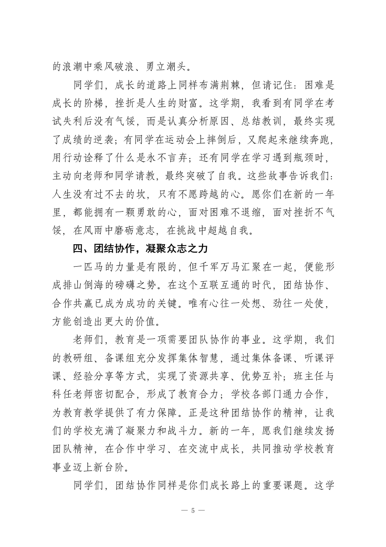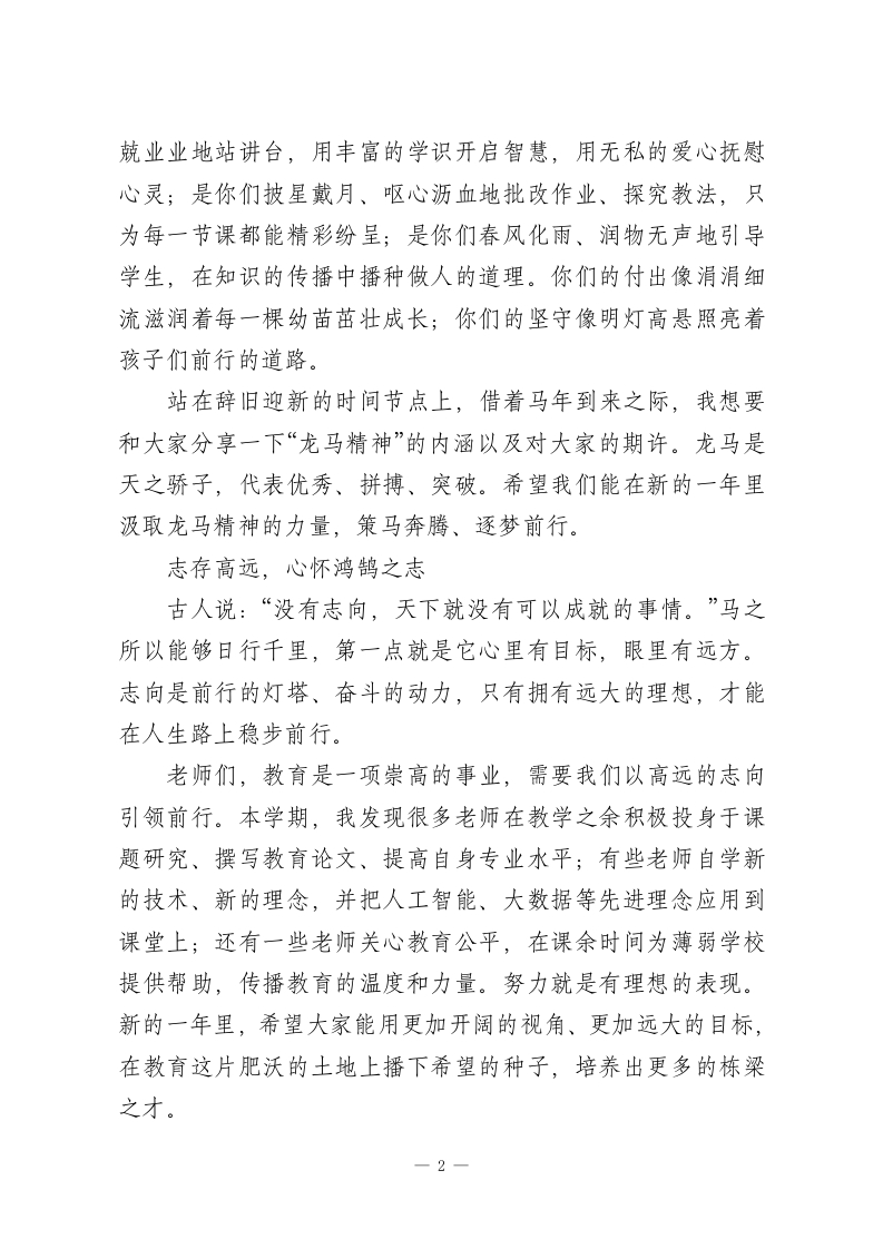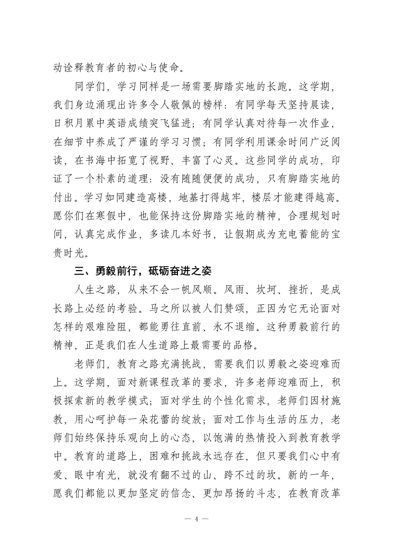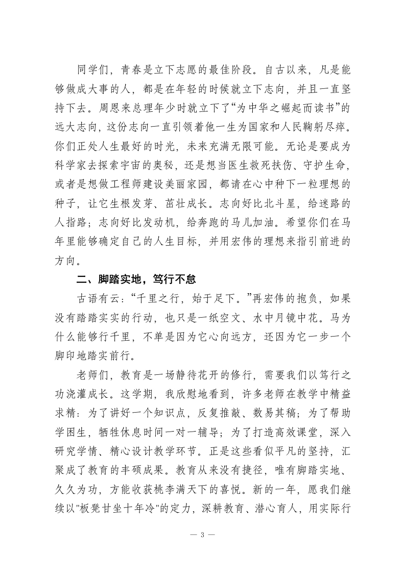 马年寒假散学典礼,校长讲话:新的一年里汲取龙马精神的力量,策马奔腾、逐梦前行!亲爱的老师、同学们:各位早上好!冬日暖阳照耀着校园,岁末的钟声悠扬。今天我们聚在一起,给这个充实而美好的学期画上一个圆满的句号,并向即将到来的马年送上最真挚的祝福。站在大家洋溢着青春和希望的脸前,我的心里充满了无限感慨和欣慰。时光飞逝,一个学期的旅程也已经走完了。一路相伴,风雨同舟,在平凡日子里书写下不平凡的故事。清晨琅琅书声唤醒了寂静的校园,课堂上思想的火花撞出了智慧的火花,操场上矫健的身影彰显出青春的活力,实验室里专注的眼神散发出探索的光芒。这些画面就好比是一帧帧珍贵的画面,永远铭记在我的共同成长的记忆中。回想起这一个学期,我们有很多值得记住的时刻。学业竞赛中,同学们奋勇向前、屡获佳绩,为学校争了光;文艺汇演中,精彩的节目体现出了大家的才智和创意;志愿服务中,温暖的身影传递着爱与责任;师生互动中,亦师亦友的情谊越来越浓。每一次的进步、每一点成长,都包含了师生们共同付出的汗水和智慧。向辛勤工作的老师们致以最高的敬意。是你们日复一日兢