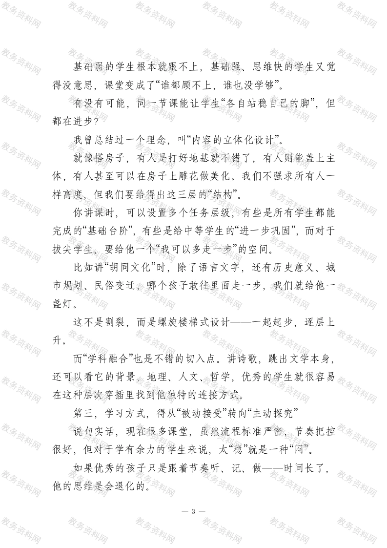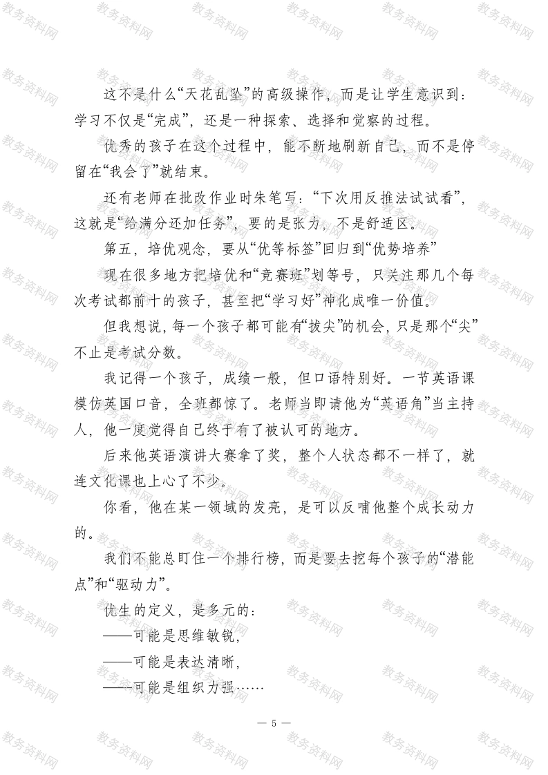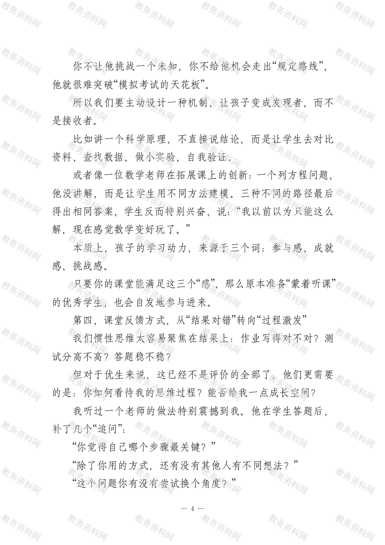 培优的真正主阵地是在课堂各位老师,大家好!一提到“培优”,很多人的第一反应可能就是两个词:“竞赛班”和“提高班”。说到具体做法呢,除了额外作业,就是加课时间。一种很自然的共识就形成了一“培优”这事儿啊,是课后的事。可是,我想提出一个有点“不合时宜”的问题:如果我们的课堂本身就没有挑战性,留不住优秀学生的注意力,那我们课后再怎么勤补、再怎么精讲,意义又有多大呢?说到底,光靠课外加油添醋,是喂不饱真正想要深度成长的孩子的。就像我们不能指望在一块瘠薄的土地上产出好庄稼一样一课堂这块土壤不肥沃,后面怎么追肥都作用有限。所以我想说,把“培优”当成课后任务,不如回过头来,把“培优”真正带回课堂。课堂,才是培优的主阵地。今天想借这个机会,和大家分享几点我个人关于“如何在常态课堂中实现育优”的一些思考。第一,课堂的目标,要从“传授知识”转向“启发智慧”我们一直以来的授课目标,很多时候就是“让学生听懂学会”,特别是基础要求方面一这是对的,但对那些学得快、悟性高的孩子来说,仅靠理解知识,怎么够呢?我记得特别清楚,有一次听两位历史老师讲《贞观之治》。A老师讲得滴水不漏,起因、背景、措施、成效,板书精美,学生乖乖记笔记,秩序好。一1