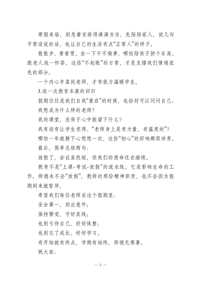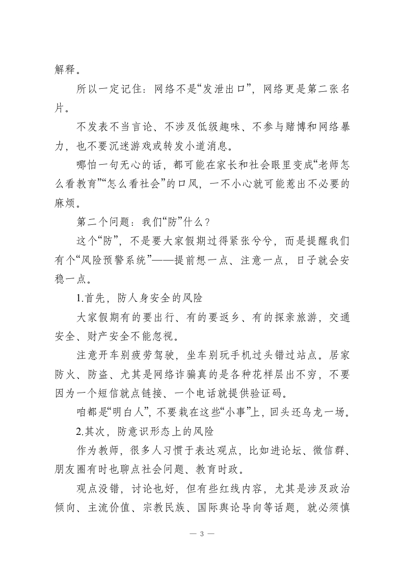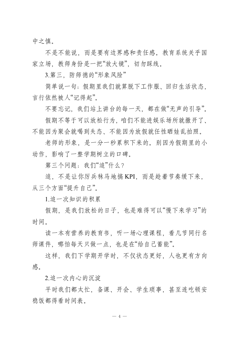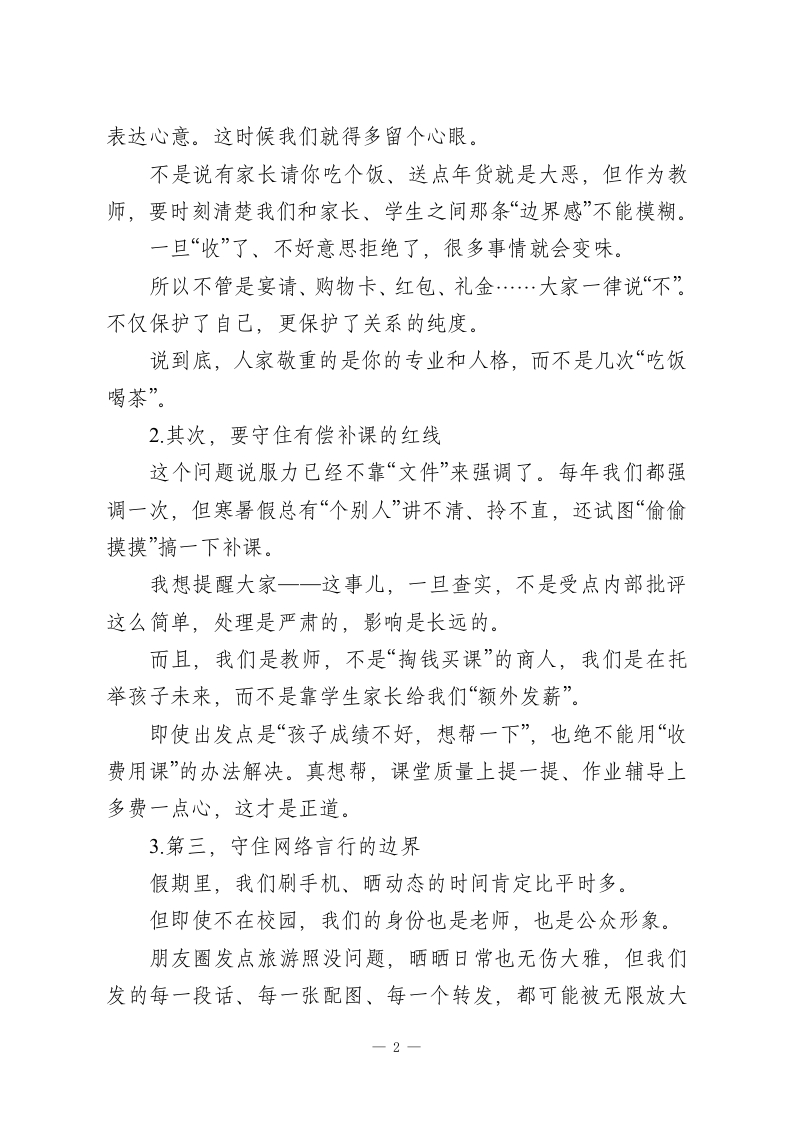期末师德师风专题大会,校长讲话:这“三问”太犀利了!很多老师沉默了各位老师、各位同仁:大家好,下午好!转眼间,我们已经走到了2025-2026学年第一学期的尾声,忙了一整学期,大家确实也该缓一缓。寒假的脚步已经悄悄临近,我知道大家心里都有点盼着放松一下、调整一下。不过,在放假之前,我们还是抽出这段时间聚一聚,开一个师德师风专题会议,既是对这一学期师德工作的一个小结,也是在提醒我们,即使是假期,教师的那份修养和责任,也不能随之“休眠”。今天我想和大家换一种方式聊聊:从三个问题展开一一我们守什么?防什么?追什么?我不是来“上纲上线”,而是想从一个教育同行的角度,和大家一起做一次思考和共勉。第一个问题:我们“守”什么?这个“守”,不是说要你拧着劲地“死守”,不是固步自封的老守法,而是一种来自内心的坚持一一是主动的、清醒的、有温度也有原则的守。更直接一点说,我们要守住三条线:底线、红线、生活线。1.首先,是廉洁的底线一到春节前后,人情往来多了,各种“礼尚往来”也多了。其实很多老师并非是故意收礼吃请,但架不住“对方”绕着弯来一1