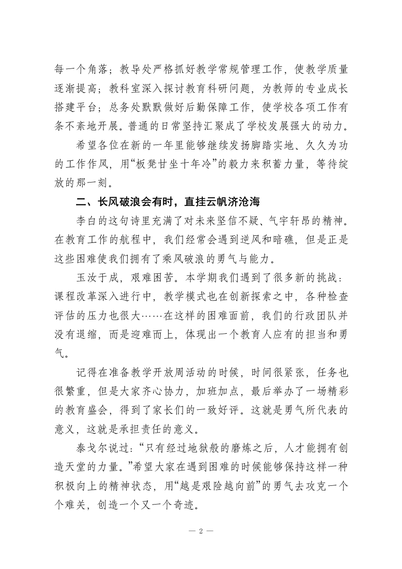 期末最后一次(中层领导)行政班子会,校长发言:5点感悟!别说废话!各位行政干部:桃李不语,自有蹊。司马迁的《史记》中有一句话很好地体现了教育者用德行、实干来感染人的美好的境界。当我们怀着真诚之心投身于教育事业,用无声的行动去实现教育理想的时候,就会发现影响和改变正在悄然发生。回想起这一个学期,我们一起度过了很多个日日夜夜,从晨曦初现到华灯初上,从春寒料峭到暑往寒来。能和各位同仁一起并肩作战,是件很荣幸的事情。今天在本学期最后一次行政会议上,我想和大家分享五点感悟,当作一个总结,也希望未来能够继续努力。一、广泛地观察和吸取,厚实地积蓄而后慢慢释放苏轼讲出了学习、成长的根本。广泛地去观察、去取材,认真地去吸收精华;深深地去积累、去沉淀,适当地去展示自己的才华。这就是我们教育工作者应该具有的治学态度,也是我们行政团队应该持有的工作理念。不积累一步半步,就无法达到千里之遥;不积累细流,也无法形成江海。学校每一点的进步都是来源于日常工作中一点一滴的积累。我们每次认真的教研活动、用心组织的校园文化活动、认真撰写的每一个工作方案,都是为学校的建设添砖加瓦。本学期,各个部门在工作当中都表现出厚积薄发的精神风貌。德育处一直在德育品牌建设方面努力,让校园文化渗透到1