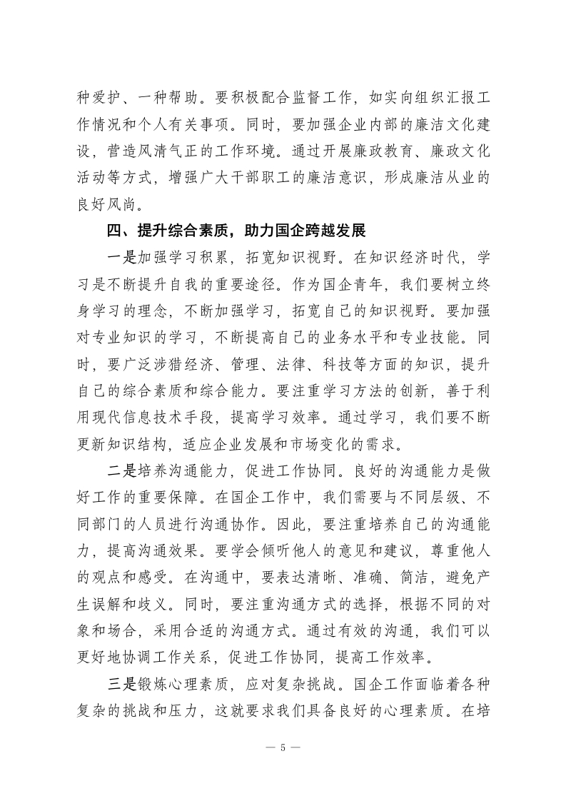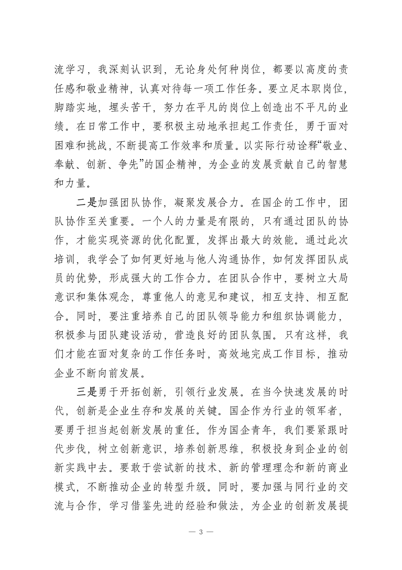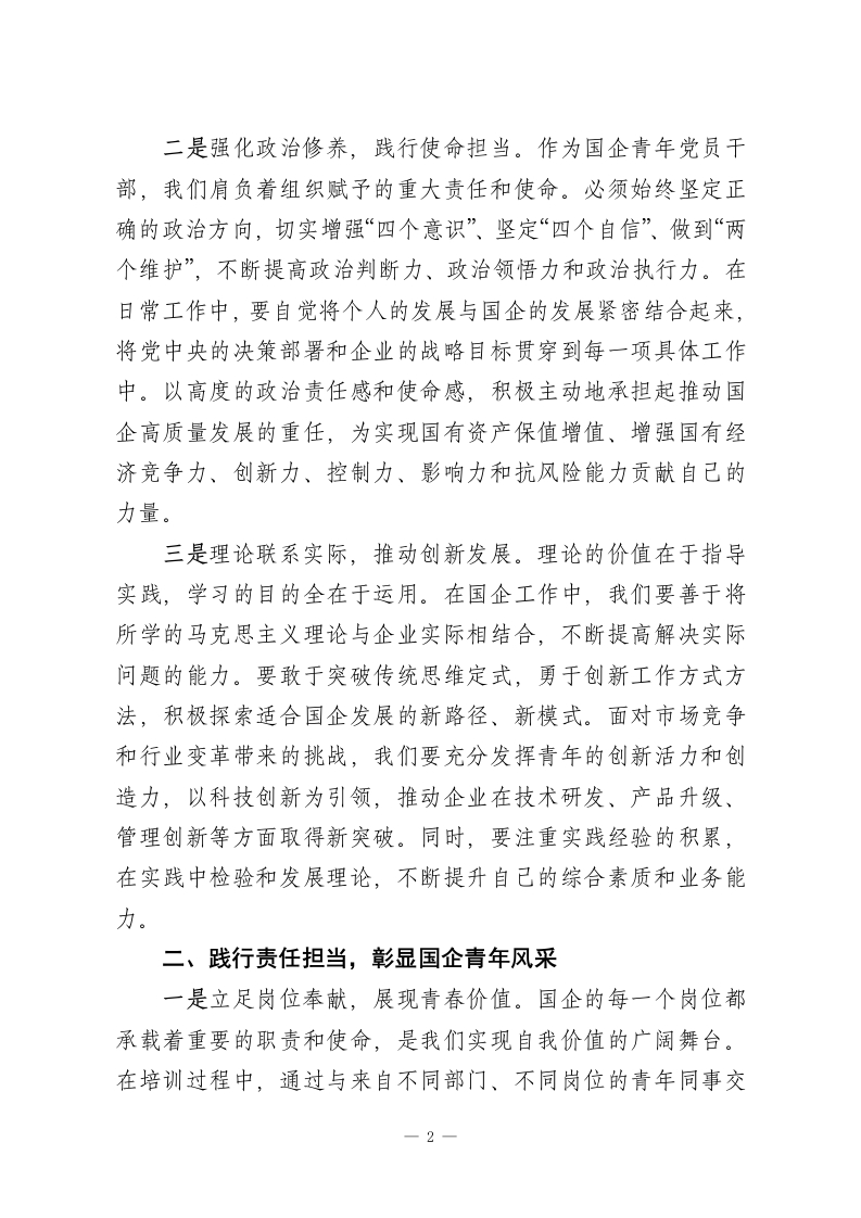 青马工程培训心得:奋进新征程中书写青春华章站在历史的关键节点,新时代国企青年肩负着传承过往、开创未来的神圣使命。“青马工程”作为青年思想政治教育的重要举措,在国企人才培养进程中发挥着不可替代的作用。有幸参与此次国企青年马克思主义者培训班,这无疑是我人生与职业发展道路上极其珍贵的机遇,让我在自我提升、自我完善的征途上迈出了坚实步伐。整个培训经历,如同一幅生动的画卷,记录着我成长的点点滴滴,成为我个人发展历程中不可或缺的重要篇章。以下,我将详细汇报分享此次培训的收获和心得体会。一、筑牢信仰根基,勇挑国企发展重担一是深化理论学习,坚定理想信念。在培训期间,我系统且深入地学习了马克思主义基本理论,深刻领会其在中国特色社会主义建设,尤其是在国企发展历程中的重要意义。授课老师们以深入浅出、旁征博引的方式,结合一个个鲜活生动的实际案例,让我对马克思主义的科学内涵、精神实质和时代价值有了更为清晰和深刻的认识。国企作为国民经济的重要支柱,其发展离不开科学理论的指引。马克思主义所蕴含的辩证唯物主义和历史唯物主义,为我们在复杂多变的市场环境中把握发展规律、制定科学决策提供了强大的思想武器。通过学习,我更加坚定了对马克思主义的信仰,对中国特色社会主义的信念,以及对实现中华民族伟大复兴中国梦的信心。—1