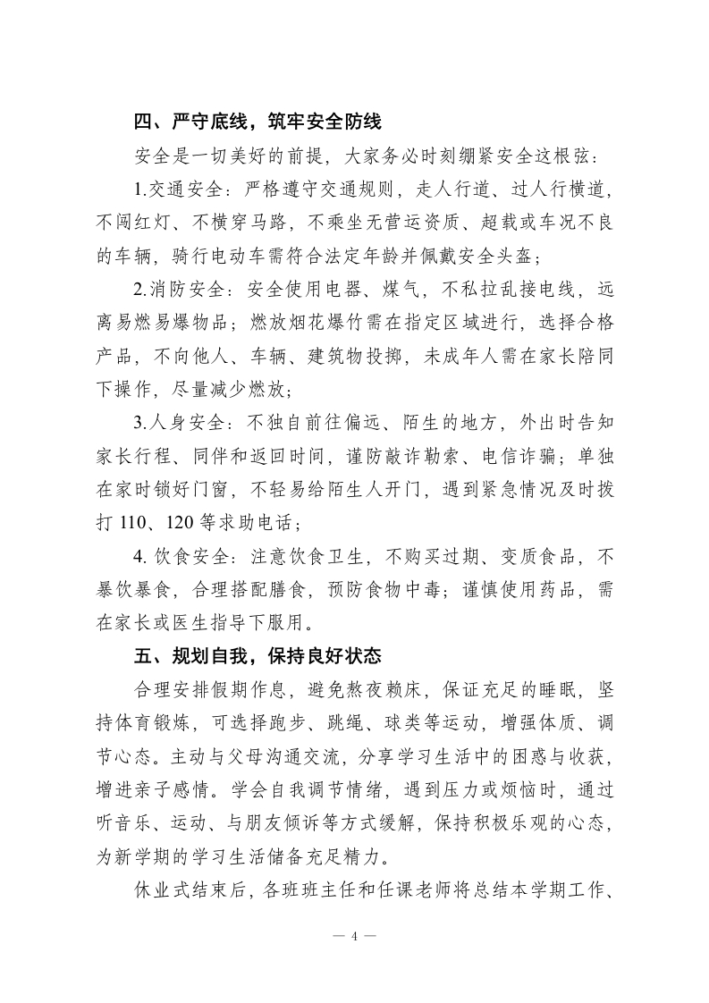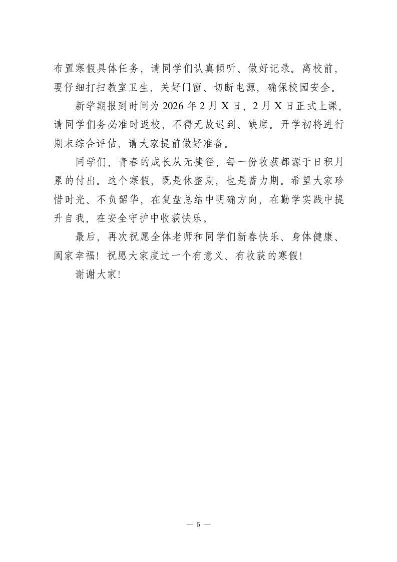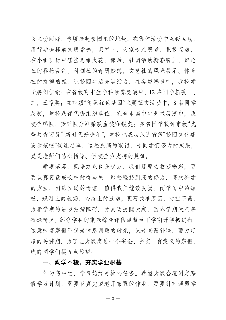 秋季第一学期休业式高中校长讲话:总结得失,规划寒假老师们、同学们:大家好!当冬日的寒风掠过校园,当教学楼里的琅琅书声暂歇,我们并肩走过了本学期的充实旅程,即将迎来期待已久的寒假,也将迎接中华民族最重要的传统佳节一一春节。在此,我代表学校全体教职工,向辛勤耕耘的老师们致以诚挚的感谢,向奋力拼搏的同学们送上节日的祝福,祝愿大家新春喜乐、万事顺意!“凡事预则立,不预则废”。回望这一学期,我们在耕耘中积累,在奋进中成长,每一份收获都凝聚着师生的共同努力。高一年级的同学们从懵懂青涩到渐入佳境,不仅适应了高中的学习节奏,更在军训、班级文化建设、新生辩论赛等活动中褪去稚气,学会了自主规划、团结协作,在探索中明确了成长方向;高二年级的同学们站稳了学业“分水岭”,在文理分科后的深耕细作中夯实基础,在学科竞赛、研学实践中拓宽视野,不少同学已成为班级的中坚力量,用责任与担当为学弟学妹树立了榜样;高三年级的学长学姐们则以“时不我待”的紧迫感冲刺高考,早自习的灯光、晚自习的身影、模拟考后的复盘,都见证着你们为梦想拼搏的坚韧,这份执着与坚守,值得每一个人敬佩。这一学期,校园里处处涌动着向上的力量:同学们见到师-1-
