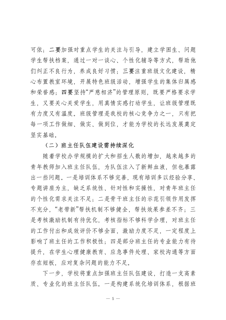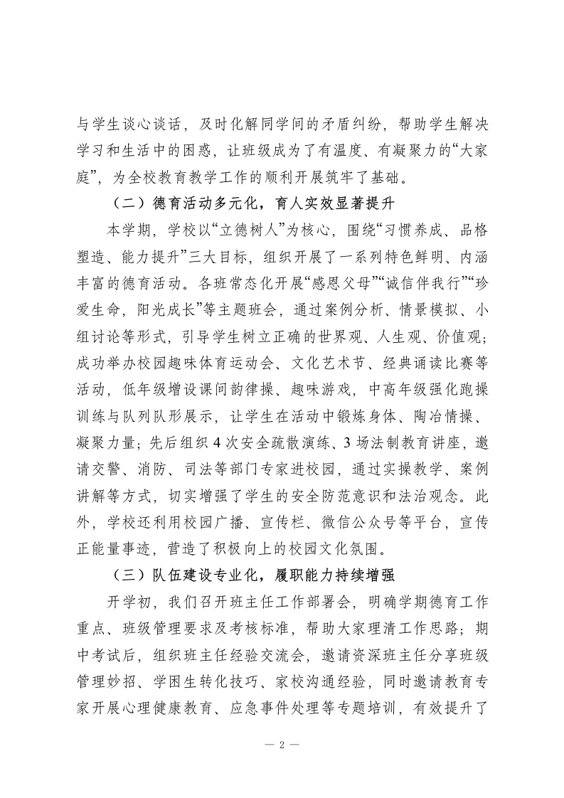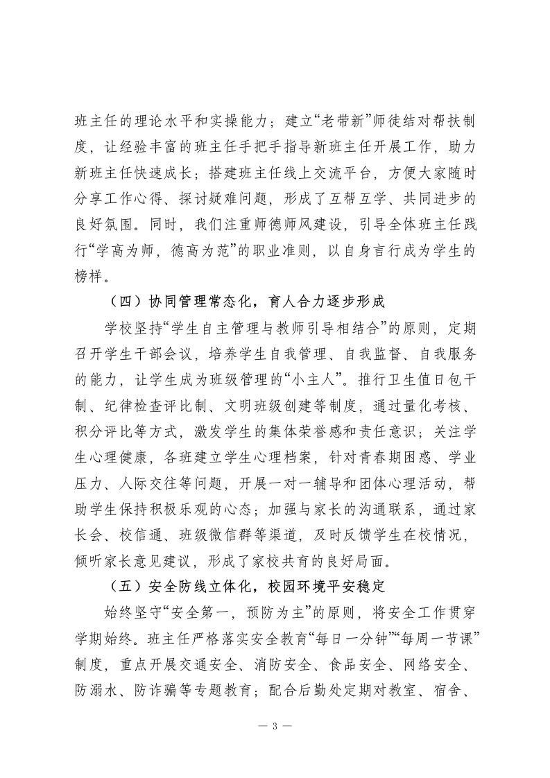 秋季学期班主任工作会校长讲话:复盘沉淀明方向,凝心聚力再出发尊敬的各位班主任老师:大家下午好!岁末冬深,学期收官。今天我们齐聚一堂,召开本学期班主任工作专题会议,既是对过去一学期德育工作与班级管理的全面复盘,也是为了找准问题、补齐短板,为新学期工作谋好篇、布好局。班主任是学校德育工作的灵魂人物,是连接学校、家庭、社会的桥梁纽带,更是学生成长路上的引路人、守护者。一学期来,大家早出晚归、默默耕耘,在三尺讲台之外扛起了班级管理的重任,用爱心浇灌成长,用责任守护初心,学校的每一点发展、学生的每一次进步,都离不开各位的辛勤付出。在此,我代表学校领导班子,向全体班主任致以最诚挚的感谢和最崇高的敬意!一、秋季学期班主任工作亮点回顾(一)常规管理精细化,班级建设稳扎稳打各班严格对标学校学生管理考评细则,将行为规范教育融入日常点滴。各位班主任坚持“早到岗、晚离校、勤巡查、多沟通”,深入教室、宿舍、食堂、操场,全方位关注学生的学习状态、生活细节和思想动态。从课堂纪律的严抓严管,到环境卫生的常态化整治;从考勤制度的严格执行,到仪容仪表的规范引导,每一项工作都做得扎实细致。很多班主任利用课余时间1