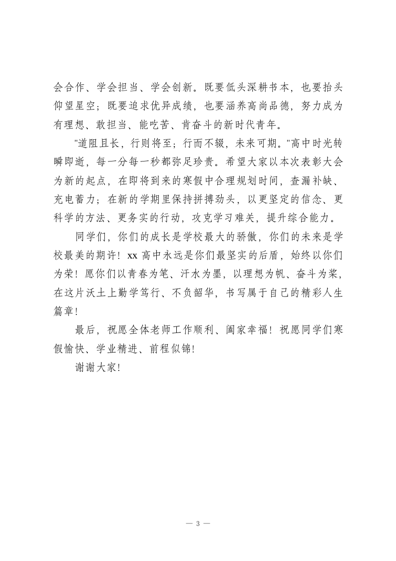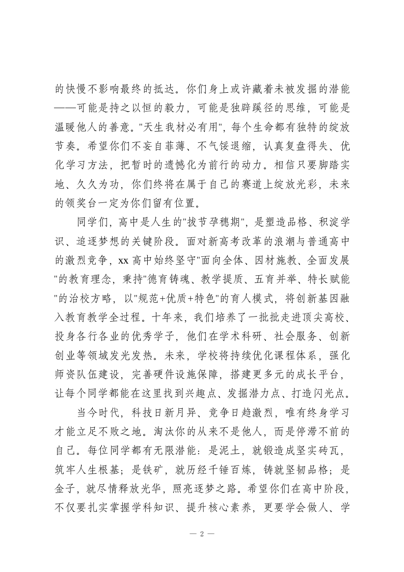秋季学期期末表彰大会高中校长发言稿:考好的保持,没考好的努力,都要逐梦前行老师们、同学们大家下午好!岁聿其莫,华章日新。本学期的收官之际,我们怀着喜悦与自豪齐聚一堂,隆重表彰在期未考试中脱颖而出的年级翘楚、班级标兵与进步先锋。这不仅是对同学们一学期勤学苦读的嘉奖,更是xx高中践行"立德树人"初心、深耕高中教育的生动见证,是全体师生同心致远的荣耀时刻。首先,我谨代表学校领导班子,向所有受表彰的同学致以最热烈的祝贺!这份荣誉勋章,镌刻着你们晨光中的诵读、深夜里的演算,凝结着你们面对难题时的坚韧、遭遇瓶颈后的突破。课堂上你们专注思辨的眼神,课后追着老师答疑的身影,与同窗探讨时的热忱,都诠释着青年学子应有的奋进姿态。但请铭记,表彰不是终点而是起点,高中生涯如登山涉海,一时的登顶不代表全程的顺遂。愿你们以荣誉为序章,戒骄戒躁、保持清醒,既要有"直挂云帆济沧海"的豪情,更要有"虚怀若谷求真知"的谦逊,在新的征程中找准差距、持续精进,用更卓越的成绩回报父母的期盼、母校的培育与时代的召唤。同时,我想对暂未获奖的同学们说:一次考试的结果,从来不是人生的定局。高中三年是一场蓄力奔跑的马拉松,一时1
