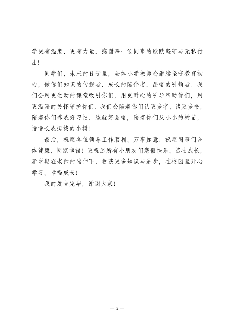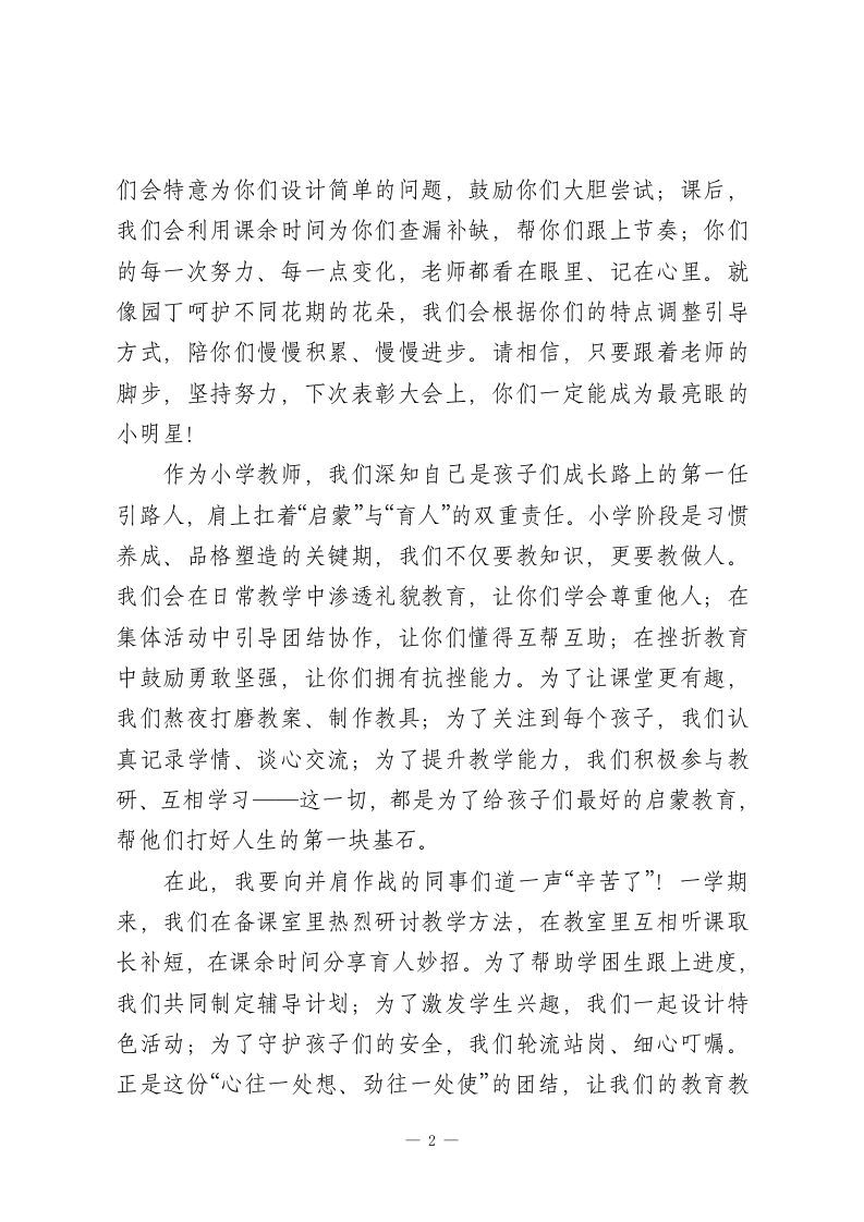 秋季学期期末表彰大会小学教师代表发言:老师的辛勤付出,换来你们的茁壮成长尊敬的各位领导、亲爱的同学们、同事们:大家好!我是来自小学x年级Xx班的教师Xxx,今天能作为教师代表站在这里发言,内心满是欣慰与使命感。在本学期的尾声,我们欢聚一堂见证孩子们的成长硕果,而这份收获的背后,正是每一位小学教师用爱心、耐心与责任心筑牢的成长根基。首先,请允许我代表全体小学教师,向所有受表彰的“学习小标兵”“成长小明星”们致以最热烈的祝贺!这份荣誉,离不开你们自身的努力,但更藏着老师们日复一日的陪伴与引导。课堂上,是我们把抽象的拼音变成朗朗儿歌,把枯燥的算数变成趣味游戏,帮你们叩开知识的大门;课后,是我们逐字批改作业、耐心解答疑问,把错题变成进步的阶梯;遇到困难时,是我们蹲下身倾听、竖起大拇指鼓励,帮你们找回自信、勇敢前行。我们见证着你们从握不稳笔到写出工整字迹,从不敢发言到主动举手,从懵懂无知到明辨是非一一你们的每一点进步,都是我们用心浇灌的成果。希望你们带着这份荣誉继续前行,也永远记得,背后有一群老师始终为你们保驾护航。同时,我想对暂时未受表彰的小朋友们说:请不要灰心!你们的成长路上,同样离不开老师的牵挂与付出。课堂上,我1