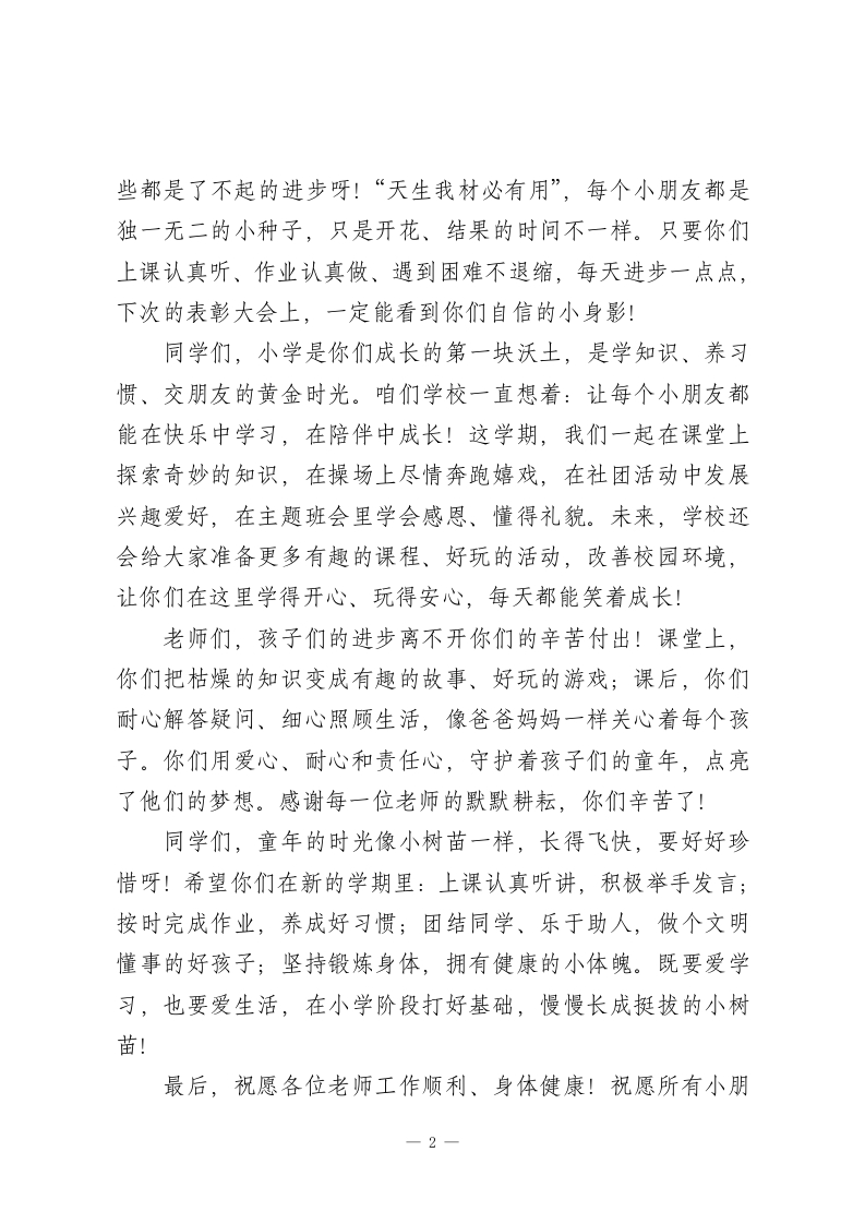 秋季学期期末表彰大会小学校长发言稿:努力就有收获,我们一起开心成长老师们、同学们:大家好!岁末暖冬,喜报频传!今天,我们怀着满满的喜悦齐聚校园,隆重表彰秋季学期期末考试中表现优秀的“学习小标兵”、进步飞快的“成长小明星”,还有在品德、纪律、活动中闪闪发光的“文明小使者“活力小健将”们!这既是对同学们一学期努力的肯定,也是咱们学校“快乐学习、全面成长”的美好见证,更是全体师生共同的喜事!首先,我要给所有受表彰的小朋友们送上最热烈的掌声!这份荣誉,藏着你们课堂上专注听讲的小眼神,藏着作业本上工工整整的字迹,藏着遇到难题时不放弃的小韧劲,还藏着帮助同学、尊敬老师的好习惯。你们用行动告诉大家:努力就有收获,坚持就能进步!但要记得呀,荣誉就像小奖状上的贴纸,是对过去的鼓励,不是终点哦。希望你们带着这份骄傲,不骄傲、不偷懒,继续做同学们的好榜样,在新的学期学到更多本领、收获更多快乐!同时,我也要对暂时没拿到表彰的小朋友们说:别着急、别难过!一次考试、一份评比,从来不能代表你们的全部!你们可能画画特别棒、唱歌特别好听,可能乐于助人、团结同学,可能这学期比上学期多认识了好多字、多会算了好多题一一这一1