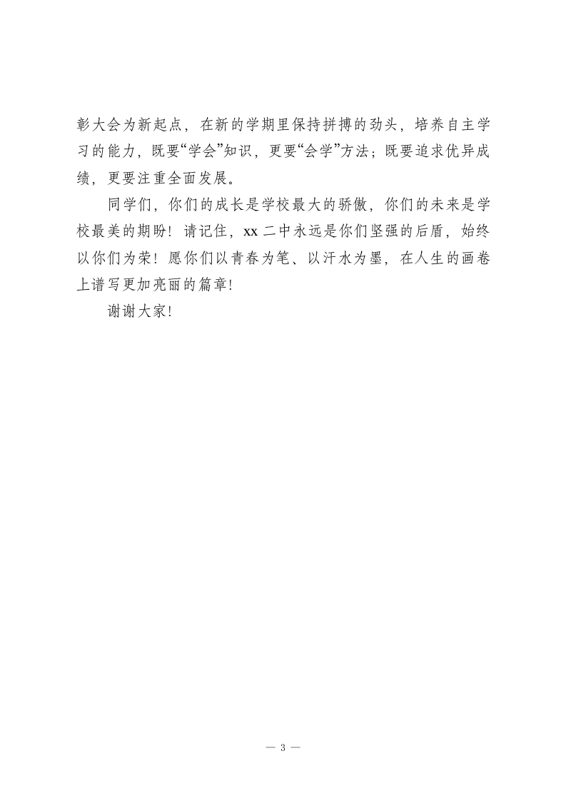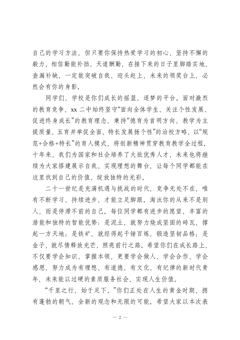 秋季学期期末考试表彰大会初中校长讲话:各展其才绽光彩,笃行不怠向未来老师们、同学们:大家好!岁末年初,硕果盈枝。今天,我们欢聚一堂,隆重召开期末考试表彰大会,为在本次考试中脱颖而出的优秀学子、进步之星喝彩鼓劲。这既是对同学们一学期辛勤付出的肯定,也是学校深化教育教学改革、提升育人质量的生动见证,更是全体二中人携手奋进的一件盛事、喜事。首先,我代表学校领导班子和全体教师,向受到表彰的同学们致以最热烈的祝贺!站在领奖台上的你们,志存高远、勤奋刻苦,课堂上专注思考、课后中勤学好问;你们尊师爱友、团结协作,在互助中共同进步;你们善于总结、持之以恒,哪怕遇到困难也从未停下前行的脚步。这份荣誉,是你们用汗水浇灌的果实,是你们用意志书写的答卷。但请记住,成功只属于过去,未来仍需开拓。希望你们戒骄戒躁、再接再厉,既要有“会当凌绝顶”的豪情,更要有“不待扬鞭自奋蹄”的清醒,主动查找不足、补齐短板,以更饱满的热情、更扎实的行动,回报母校的培育、父母的期盼和自己的青春。同时,我也想对暂时未受到表彰的同学们说:请不要气馁,更不要妄自菲薄!“天生我才必有用”,每个人都有独特的潜能和闪光点。也许你此刻的进步尚未显现,也许你还在寻找适合1