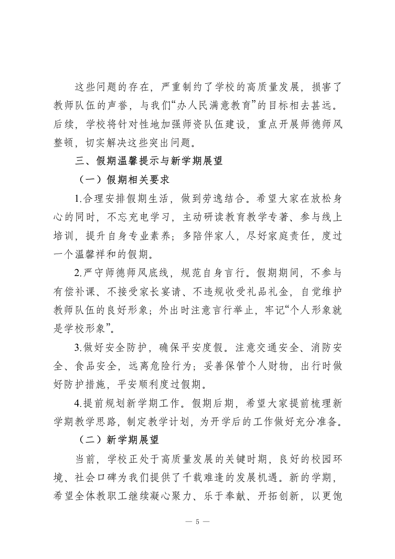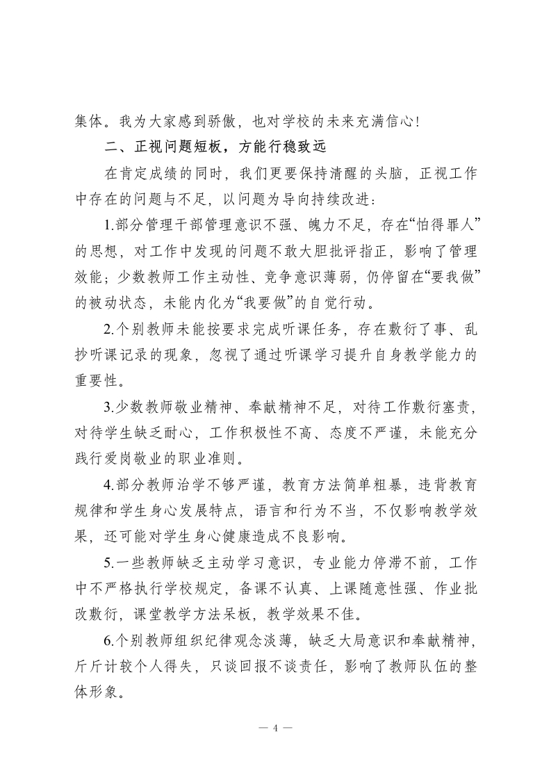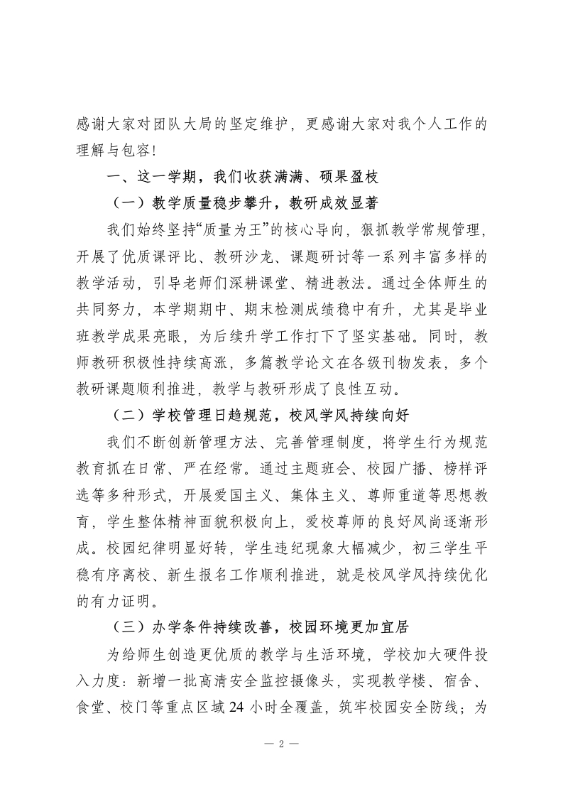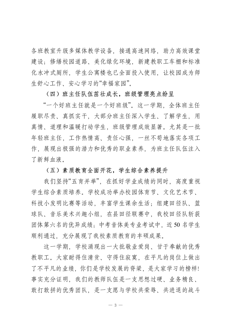 秋季学期期末散学教师会议校长讲话:总结经验补短板,假期充能待新篇尊敬的各位老师们:大家下午好!随着期末考试的圆满落幕,本学期也即将画上句号。今天我们齐聚一堂,既是对这一学期工作的全面复盘,也是为了总结经验、正视不足,在放假前凝聚共识、蓄力再发。这一学期,我们全体同仁并肩作战、负重拼搏,凭着对教育事业的热爱、对学生的责任、对学校的担当,圆满完成了各项既定目标,甚至在多个领域实现了超额突破,不仅提升了学校的办学品质和社会口碑,更向家长、向社会交出了一份沉甸甸的满意答卷。回顾这一学期的点点滴滴,我心中满是感动与自豪。大家的辛苦与付出,我看在眼里、记在心里:年轻老师忍痛放下生病的孩子,坚守教学岗位;中年老师兼顾家庭与工作,悉心照料年迈父母的同时,从未耽误一节课;还有不少老师带病坚持工作,用沙哑的嗓音依然讲好每一个知识点。大家没有怨言、任劳任怨,在完成教学核心任务的同时,积极配合学校完成各项阶段性工作和上级下达的目标任务,用实际行动诠释了“学高为师,德高为范”的深刻内涵。所有成绩的取得,都不是某一个人的功劳,而是我们这个团队凝心聚力、集体奋斗的结果。在此,我代表学校领导班子,向每一位辛勤付出的老师致以最衷心的感谢和最崇高的敬意!感谢大家对学校工作的全力支持,1