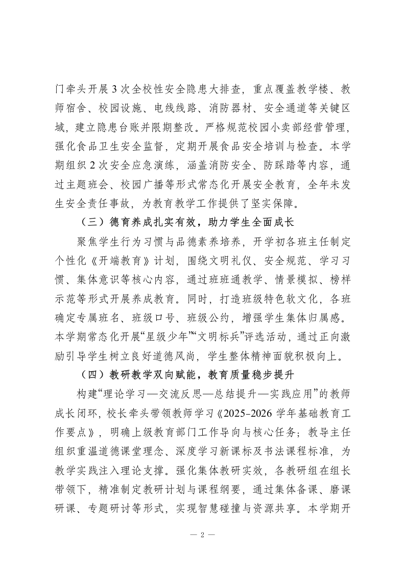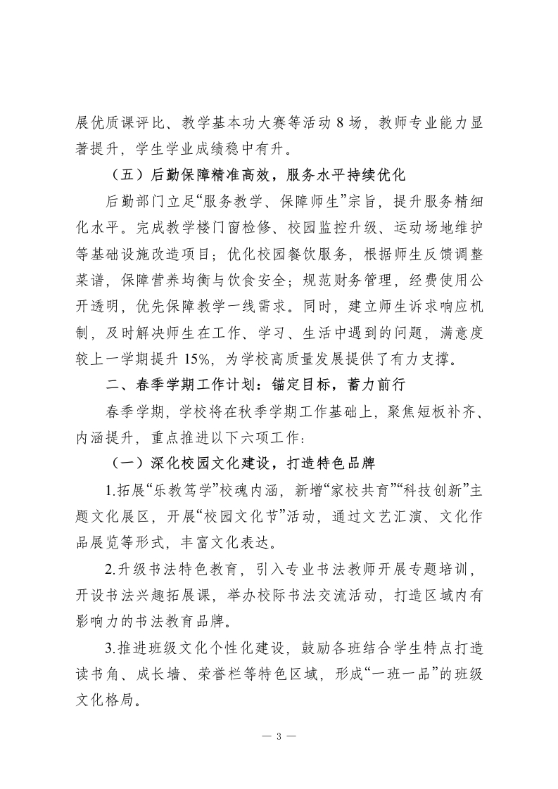 秋季学期校长工作总结暨春季学期工作计划:盘点秋季好做法,春季重点抓这几件事各位领导、老师们:大家好!本学期已圆满落幕,在全体师生的共同努力下,学校围绕“均衡普惠、优质特色、人民满意”的教育目标,紧扣“遵循教育规律,促内涵式发展”的工作思路,各项工作扎实推进、亮点纷呈。现将秋季学期工作总结如下,并对2026年春季学期工作进行规划部署。一、秋季学期工作总结:深耕细作,硕果盈枝(一)校园文化提质升级,精神内核凝聚人心以“乐教笃学”为核心校魂,深化师生文化认同,让每一位教职工都成为学校发展的主人翁。本学期新增校园走廊文化版画12块、教育教学主题标语8幅,更新处室标识牌15个,对校园花坛进行绿植补栽与景观优化,全体教师共同参与校园环境大扫除,打造出整洁美观、富有教育氛围的校园空间。同时,围绕“翰墨承文化,特色孕人生”理念,升级特色文化建设,将教师书法练习从硬笔拓展至软笔,加大学生书法训练力度,成功举办3场校园书法展示大赛,让笔墨书香浸润校园,丰富师生精神文化生活。(二)安全防线筑牢守实,校园秩序平稳有序始终坚守“安全无小事,责任重如山”的底线思维,后勤部1