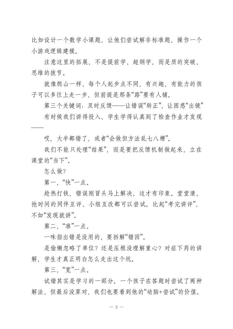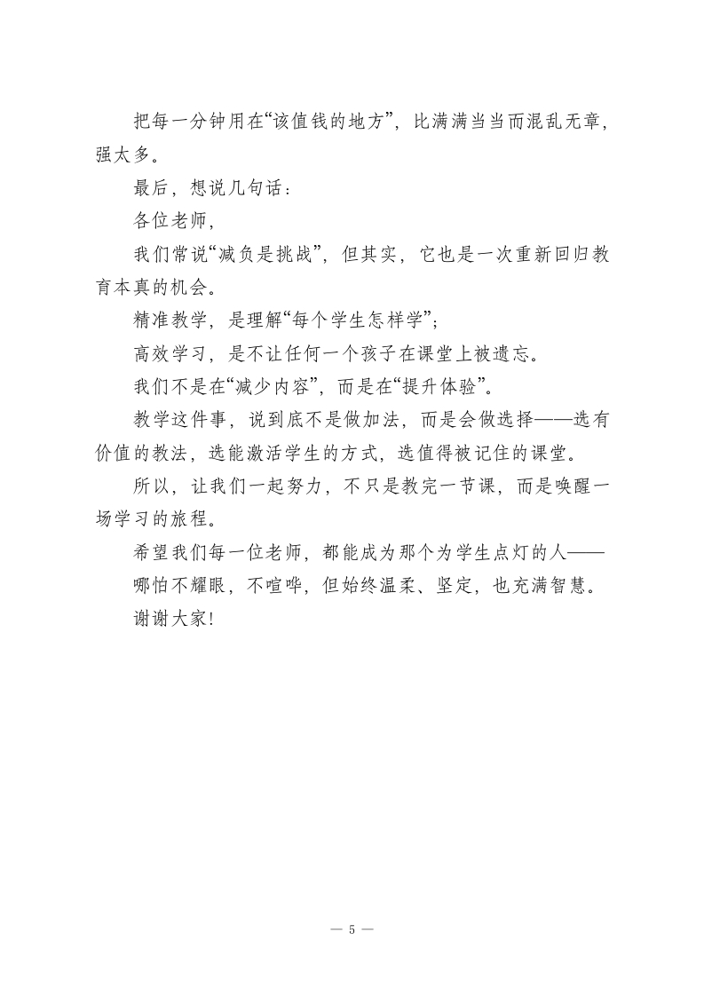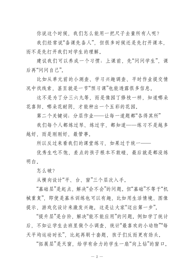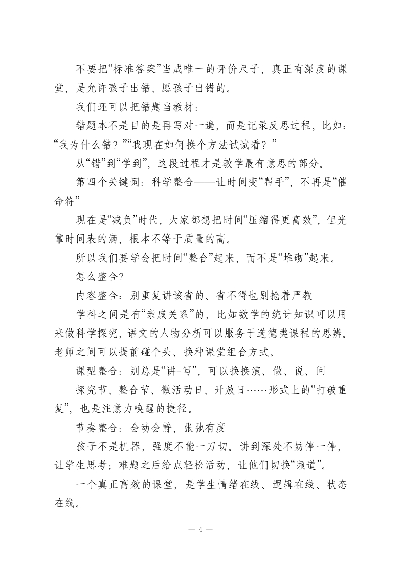 全校教研会上,教学副校长讲话:找准这4个支点,让教学“精准”发力!各位老师:大家好!今天这次交流,我想聊一个我们都很关心的问题一一到底怎样才能上好一堂真正属于学生的课?一句话总结就是:减负不减质,让学习有光,也让生命有光。很多时候我们一说“减负”,好像就是“减作业”、“减课堂容量”,实则不是。真正有质量的课堂,不是非得“节节满“知识点多”,而是要做到精准地教、高效地学。孩子是活生生的人,不是一摞一摞的数据统计。教育、从来不是知识搬运,而是一个生命接住另一个生命。今天想跟大家聊聊,我们学校这几年在教学改革中试着探索的一些做法,也可以理解成“我们还在路上的四条路径”。第一个关键词:学情精准一一教什么,先得知道学生到了哪一步如果说教学是一场旅程,那学情诊断就是导航仪。去哪儿不重要,先看看,孩子现在在哪儿。有人已经准备好启程了,有人还不知道要去哪儿。有人已经翻开地图了,有人还没系好安全带。讲得直白点,有的孩子还没掌握基础概念,有的早就会做课本之外的题了。