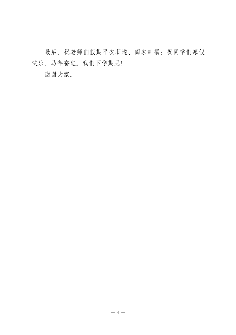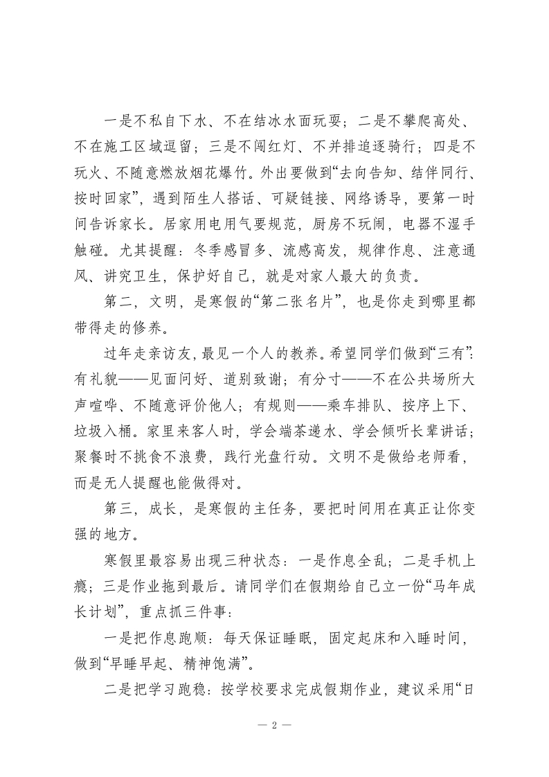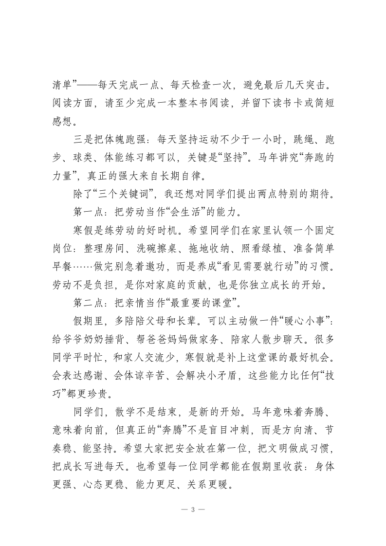 散学不散志,马年更奋蹄一—2026马年寒假散学典礼德育主任发言稿各位老师、亲爱的同学们:大家好!今天,我们在这里举行2025年秋季学期散学典礼。一个学期的学习与生活即将画上句号,首先,我代表学校德育处向辛勤付出的老师们表示感谢,向努力成长的同学们表示祝贺。寒假将至,新的一年是马年。马象征着自强不息、奋勇向前,也提醒我们:假期不是“松一口气”,而是“换一条跑道”继续积蓄力量、调整节奏、养成习惯、把自己照顾好、把生活过得更有方向。回望这一学期,我们最欣慰的,不只是成绩单上的数字,更是同学们在规则意识、文明礼仪、劳动习惯、集体荣誉感上的点滴进步:能主动问好、会自觉排队、懂得礼让同伴;愿意参与班级事务、认真完成值日;在活动中学会合作、在困难面前学会坚持。这些看似细小的改变,正是德育最重要的成果一一把正确的选择做成习惯,把善意与担当做成日常。接下来,我想用“三个关键词”送给大家,作为马年寒假的德育提醒,也作为每位同学的假期清单。第一,安全,是寒假的第一课,也是全家人的底线。安全不是口号,是每一个动作、每一次选择。请同学们牢记“四个不”:一1