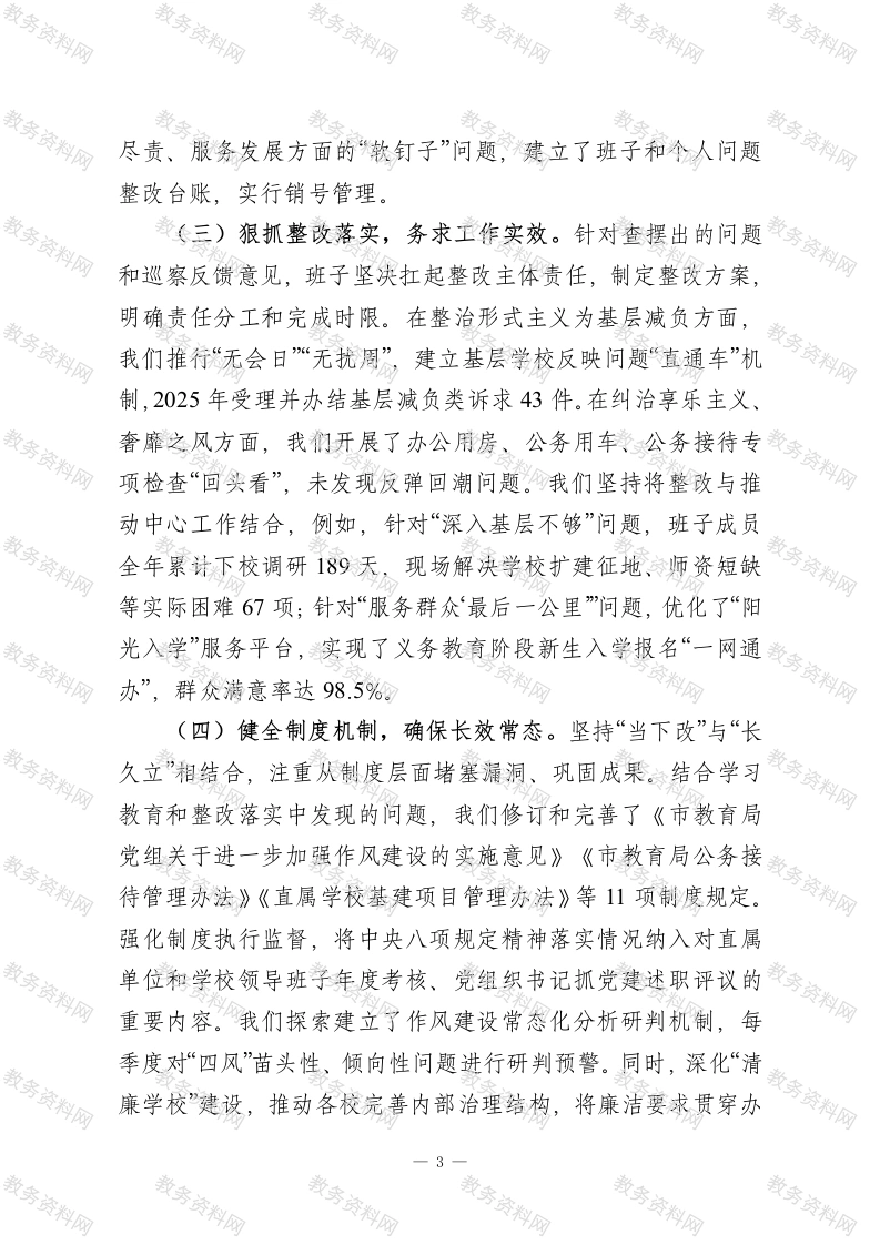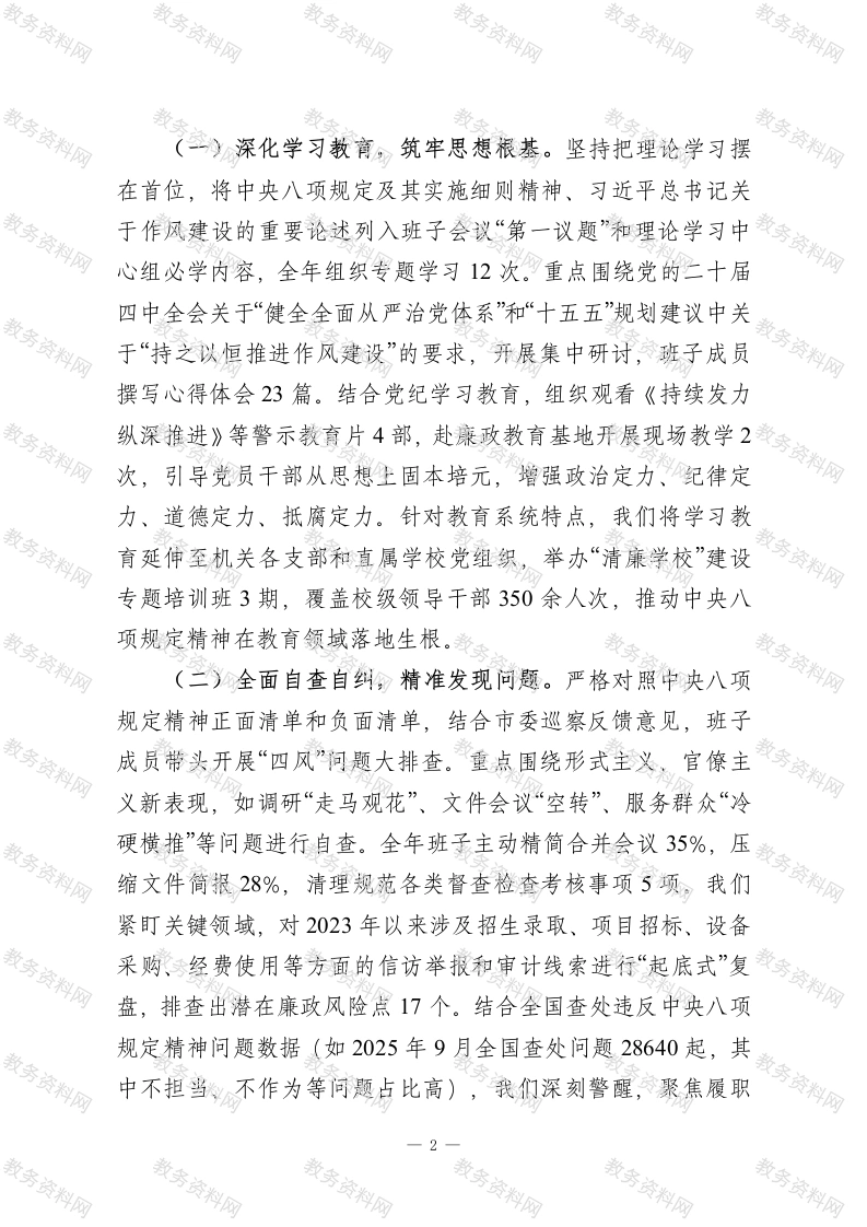 市教育局2025年度民主生活会领导班子对照检查材料根据市委统一部署和本次民主生活会主题要求,市教育局领导班子紧扣“深入学习贯彻习近平新时代中国特色社会主义思想,全面贯彻落实党的二十届四中全会精神,锲而不舍落实中央八项规定精神,推进作风建设常态化长效化”这一主题,在扎实开展学习研讨、广泛征求意见建议、深入进行谈心谈话的基础上,认真对照检查,深刻剖析反思。会前,班子通过理论学习中心组开展了3次专题学习研讨,系统学习了党的二十大、二十届三中、四中全会精神及习近平总书记关于教育、作风建设的重要论述;通过设立意见箱、召开座谈会、发放征求意见表等方式,累计收集基层学校、师生家长、社会各界意见建议127条;班子成员之间、班子成员与分管处室(单位)负责人之间开展谈心谈话58人次,为开好民主生活会奠定了坚实思想基础和工作基础。现将班子对照检查情况报告如下:一、2025年度贯彻落实中央八项规定精神情况总结本年度,局领导班子将贯彻落实中央八项规定精神作为推进全面从严治党、深化作风建设的重要抓手,通过“学、查、改、立”扎实开展“深入贯彻中央八项规定精神学习教育”,旨在贯彻落实党的二十届三中全会部署,巩固拓展学习贯彻习近平新时代中国特色社会主义思想主题教育成果,巩固深化党纪学习教育成果,锲而不舍落实中央八项规定精神,推进作风建设常态化长效化。1