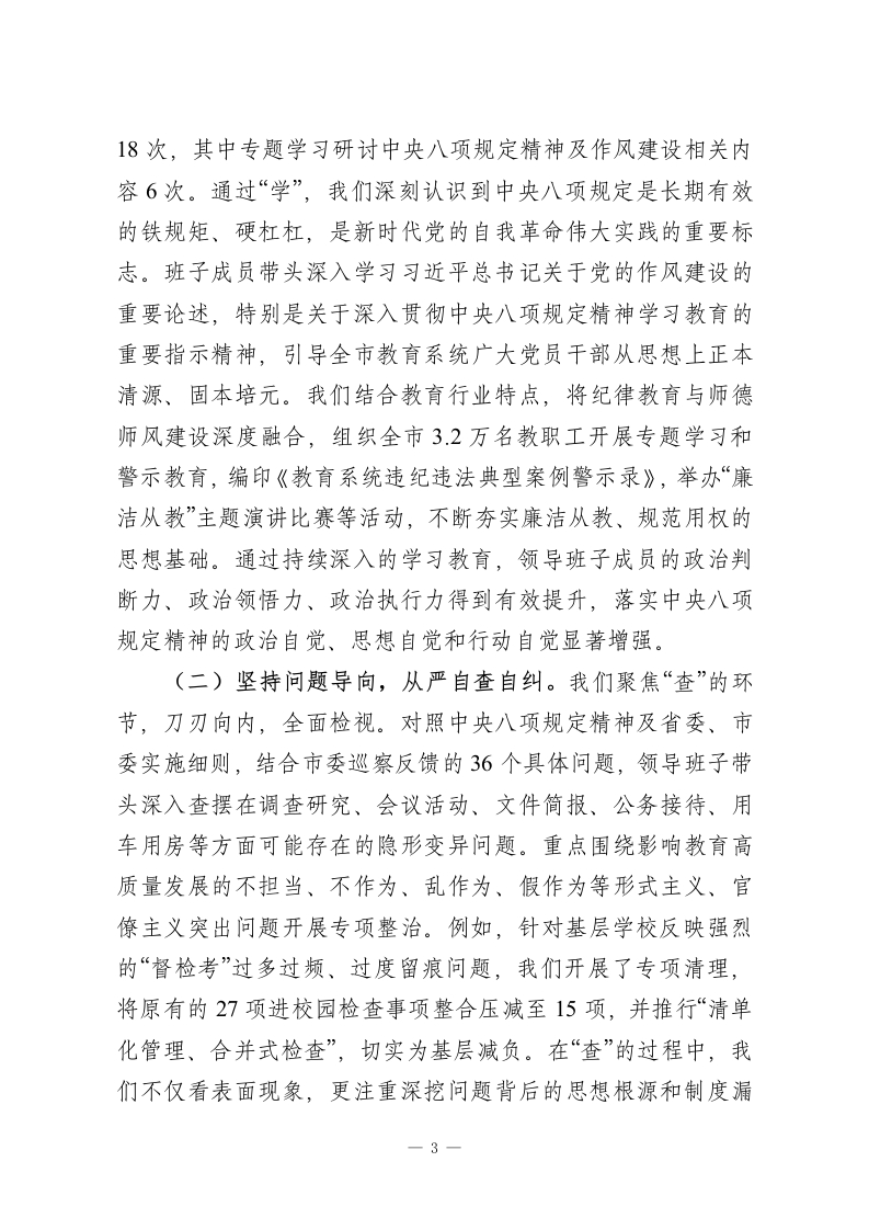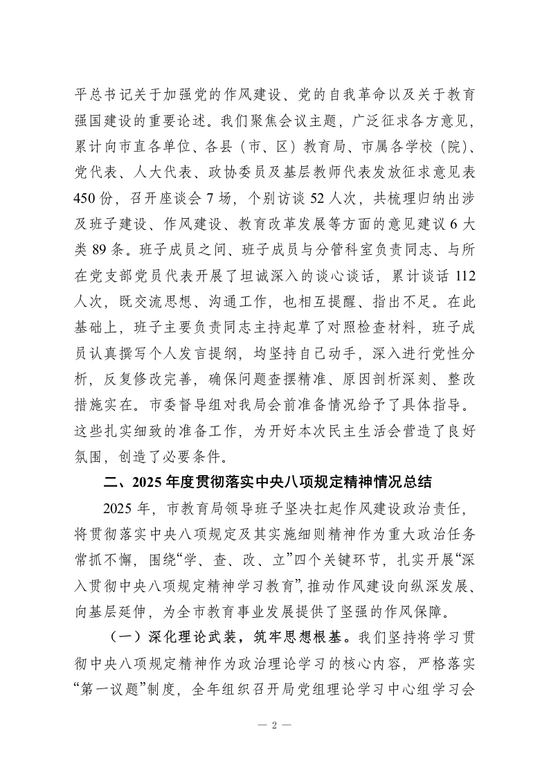 市教育局领导班子2025年度民主生活会对照检视材料(五个带头)根据中央、省委和市委关于开好2025年度党员领导千部民主生活会的统一部署,市教育局领导班子紧扣“深入学习贯彻习近平新时代中国特色社会主义思想,全面贯彻落实党的二十届四中全会精神,以打攻坚战、持久战的决心和恒心,锲而不舍落实中央八项规定精神,推进作风建设常态化长效化这一主题,在扎实做好会前准备的基础上,紧密结合全市教育工作实际,深入查摆问题,深刻剖析根源,明确整改方向。现将对照检视情况报告如下:一、会前准备情况开好2025年度民主生活会,是深入学习贯彻党的二十届四中全会精神,学习贯彻习近平总书记关于深入贯彻中央八项规定精神学习教育的重要指示精神,巩固拓展党纪学习教育成果,为实现“十五五”良好开局打牢思想基础的重要举措。局领导班子深刻认识此次民主生活会的政治意义和实践要求,将其作为一次严肃的党内政治生活历练和深刻的政治体检,高度重视,精心组织,为会议高质量召开奠定了坚实基础。会前,班子坚持把理论学习贯穿始终,通过召开理论学习中心组专题学习会、举办读书班等形式,集中5天时间,深入学习了党的二十大及二十届历次全会精神,特别是党的二十届四中全会作出的战略部署,系统研读了《中共中央关于制定国民经济和社会发展第十五个五年规划的建议》,深刻领会习近1