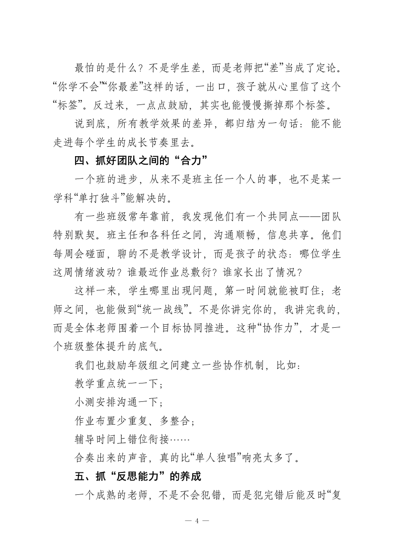 提高教学质量,教学副校长讲话:稳居第一就是一个字:抓!各位老师:大家好!每到期末总结的时候,总有老师会问这样一个问题一一为什么有些班级总是年年领先,而有的班级呢,却始终在中游徘徊?大家都很辛苦,都很用心,备课教研、加班加点没少花精力,为什么差距就是在那里?作为分管教学的副校长,我平时的工作之一,就是走教室、听课、看课,基本全校的班级我都走过一遍了,课听了上百节,和不少优秀老师也有过深入交流。说实话,那些成绩常年领先的老师,并没有什么“隐藏秘籍,但他们大多,真的做到了一“抓”这个字。抓什么?怎么抓?今天想和大家聊聊我的一些观察和感受。一、抓课堂这个“主战场”说到底,教学的核心还是课堂。能不能抓住学生的注意力,决定了一节课能不能“走心”。我走课的时候看到,有些老师在讲台上讲得声嘶力竭,但学生却像开了“静音模式”一一要玩玩、要走神走神。并不是学生故意不配合,而是老师没能把课堂“控”住。那些课程效果好的老师,一进门气场就不一样。他们会突1