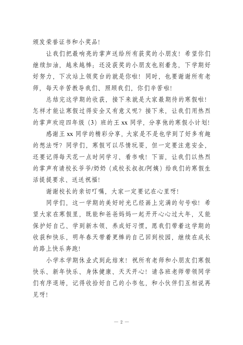 小学秋季学期寒假休业式主持词老师们、同学们:上午好呀!当校园里的桂花香气慢慢散去,当树上的叶子悄悄换上金黄衣裳,我们热热闹闹、充充实实的本学期,就要和大家说再见啦!这一学期,我们跟着老师在知识的花园里探险,在操场上尽情奔跑嬉戏,在手工课上做出奇奇怪怪又可爱的作品,还认识了好多新朋友、学会了好多新本领,每一天都过得开开心心、收获满满!今天,我们欢聚在这里,一起盘点收获、表扬优秀,然后开开心心迎接寒假和新年呀!首先,进入最让人期待的表彰环节!这些荣誉是给努力的小朋友们最好的奖励:有请德育处X老师宣布“文明小标兵”“卫生小卫士”“爱心小天使”名单一这些小朋友们讲礼貌、爱干净,还乐于助人,是大家学习的好榜样;有请教务处李老师宣读“学习小能手”“进步小明星”“阅读小达人”名单一他们上课认真听讲、作业按时完成,还特别爱看书,一步步变成了更棒的自己;有请少先队辅导员张老师揭晓“优秀少先队员*“班级小管家”名单一一他们在班里帮老师做事、帮同学分忧,是老师的好帮手、同学的好朋友;最后,让我们用最热烈的掌声欢迎校长爷爷/奶奶(或校长叔叔/阿姨)宣布本学期“三好学生”名单,并为获奖的小朋友们1