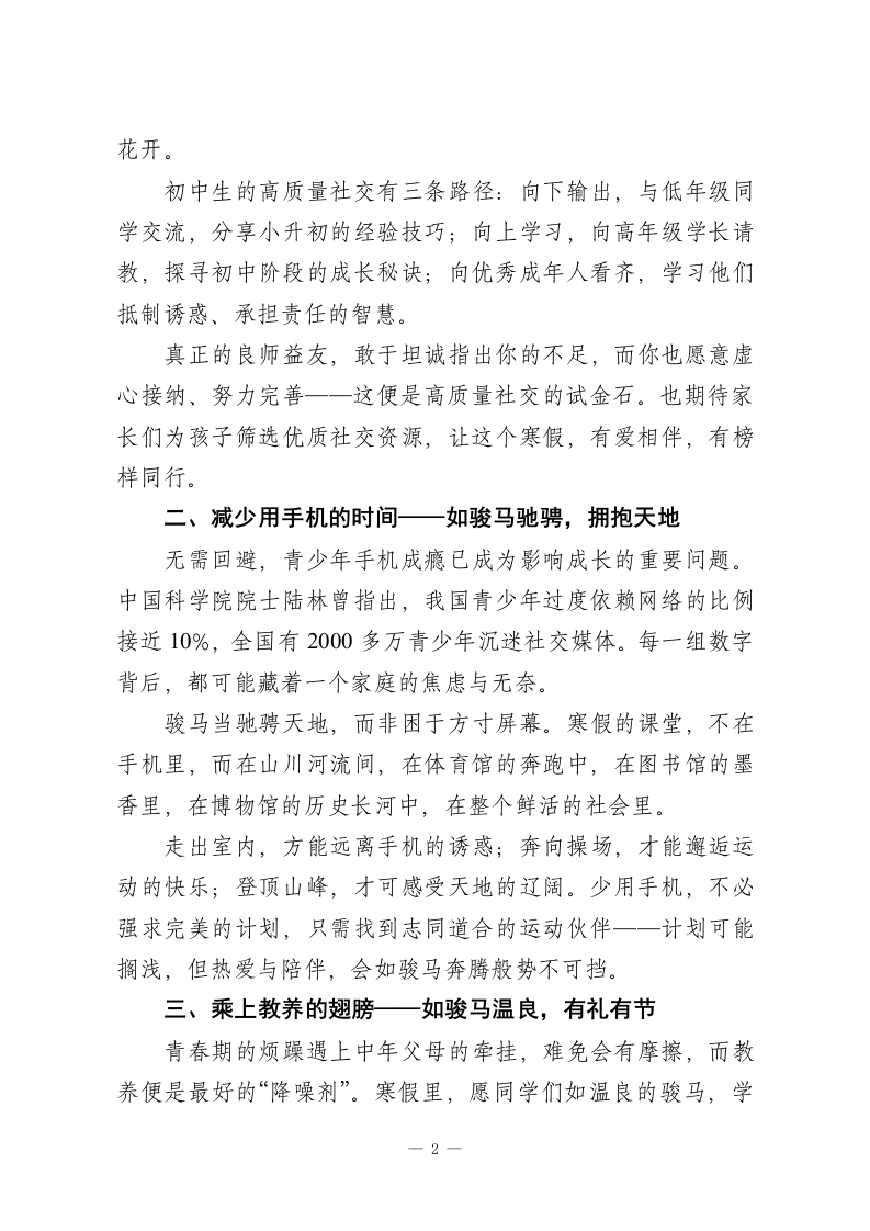 校长在2026寒假散学典礼上讲话:做好寒假的加减乘除老师们、同学们:大家好!辞旧岁灵蛇辞旧韵,迎新春骏马踏春来。紧张充实的学期已然落幕,温馨愉快的寒假正向我们招手。回望这一学期,校园里的每一天都镌刻着我们的奋斗足迹:早自习的朗朗书声如晨钟悠扬,课堂上的专注思考似星光闪耀,课间的文明嬉戏像春风和煦。全校师生同心同德、锐意进取,用实际行动书写了学校发展的崭新篇章。在此,我代表学校,向勤奋拼搏、学有所成的全体同学致以热烈的祝贺!向爱岗敬业、无私奉献的全体老师表示衷心的感谢!不讲大道理,只讲心里话。今天的散学典礼,我想和大家聊聊如何做好寒假里的“加减乘除”,让马年寒假过得有意义、有收获。一、增加高质量的社交一如骏马结伴,同行致远孩子生病了,仍坚持赴约见同学一这是温情:孩子生病了,仍坚持赴约图书馆学习一这是上进;孩子生病了,仍坚持赴约完成学习小组第20天打卡一这是励志。高质量的社交,就像骏马结伴而行,与有目标、有追求的人同行,方能走得更远、更稳。过程中或许有迷茫、有疲惫,但彼此的鼓励与支持,终将化作前行的力量,迎来人生的春暖1