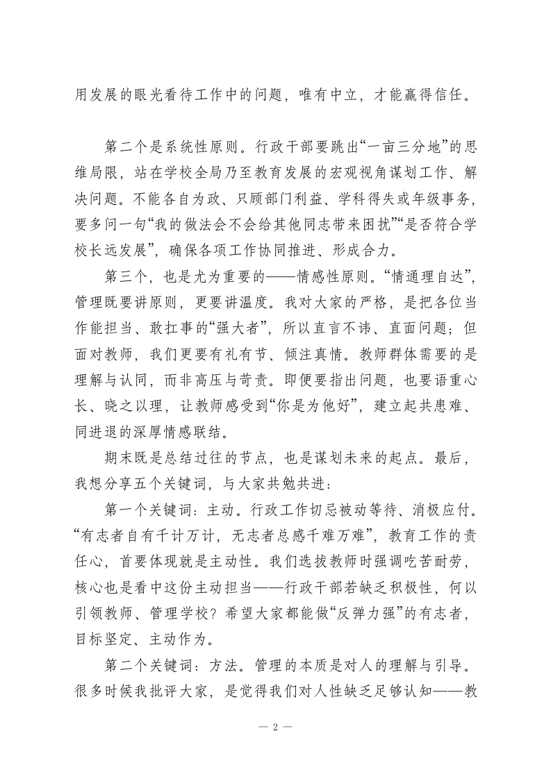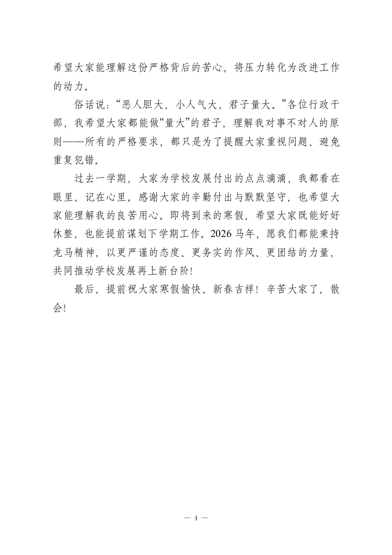 校长在期末行政会上精彩讲话:5词共勉,以龙马之姿赴新途,以实干之风强担当!各位行政干部:大家下午好!2025秋季学期已近尾声,寒假即将到来,再过不久我们就将迈入2026马年。龙马精神是中国人崇尚的品格,而这份精神,正需要我们行政班子在学校管理中率先践行。刚才静坐沉思,不禁想起陆游“早岁那知世事艰”的诗句一一我曾身为教师时,未体会过行政工作的繁杂;履职行政岗位时,也未深知校长肩头的重任。学校管理从来不是坦途,事务繁杂不可怕,最怕精神懈怠;工作有问题不可怕,最怕掉以轻心。“如履薄冰”“战战兢兢”,这是我日常的心态,也希望大家始终紧责任这根弦,以敬畏之心对待每一项工作。或许有同志会觉得我对大家要求过严,有时甚至不留情面。但我始终认为,行政干部作为学校发展的中坚力量,无需在表扬声中寻求认同一一过多的赞许反而容易让人迷失方向,浪费推进工作的时间。严管才是厚爱,这既是对学校负责,更是对每一位同志的成长负责。今天借着期末反思会的契机,我想和大家明确行政干部必须坚守的三个基本原则,这是我们开展工作的根本遵循:第一个是中立性原则。行政工作要守住“公心”底线,切勿以个人偏见给教师贴固化标签,更不能轻易下“他就是这样、无法改变”的定论。我们的职责是客观公正地看待每一位教职工,1