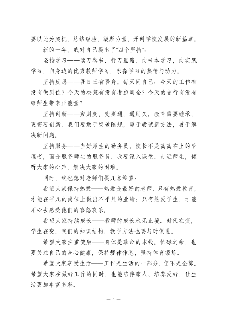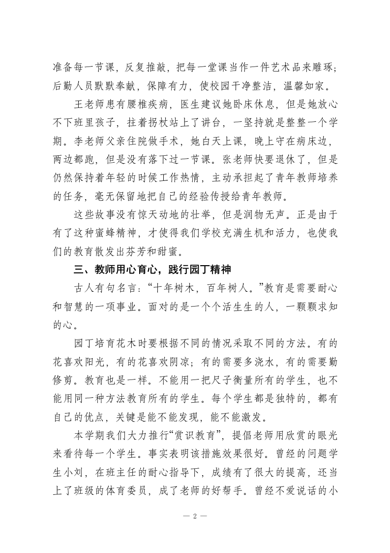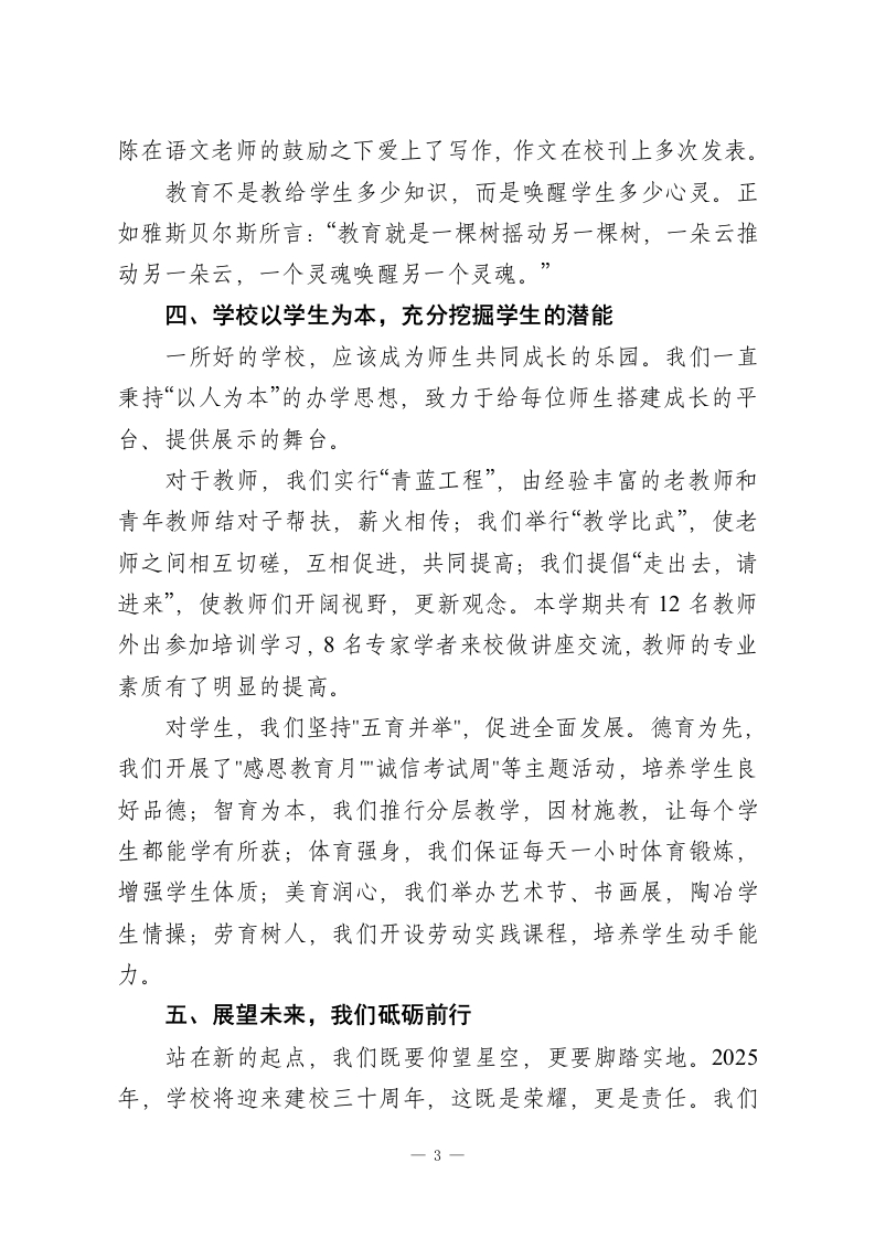 校长在期末教师总结大会上精彩讲话:教育就是一个灵魂唤醒另一个灵魂!亲爱的老师:时光流逝,岁月无痕。转眼间,2025年篇章就要合上了,2026年画卷正在徐徐展开。回望过去的一年,我们一起经历了春天的播种、夏天的劳作、秋天的收获、冬天的积累。一路汗水、泪水、欢笑、感动。站在岁未年初的时间节点上,我想和大家一起回望过去的一年,展望来年。回顾过去,我们硕果累累今年学校的发展又上了一个新的台阶。教学质量稳步提高,中考成绩位于全区前列;校园文化建设和文明校园创建取得一定成效;教师队伍不断壮大,三位教师获得省级教学能手称号:学生在各种比赛中表现优异。这些成绩的取得离不开在座各位老师辛勤付出和默默奉献。二、教师以梦为马,发扬蜜蜂精神蜜蜂是大自然中勤劳的小精灵。日复一日地采集花粉,酿造甜蜜,从不抱怨,从不懈怠。一只蜜蜂一生只能酿造一茶匙左右的蜂蜜,但是无数蜜蜂的共同努力,才造就了蜂巢里金黄的甜蜜。我们教师队伍当中,也有一群具有蜜蜂精神的人。他们勤奋、专注、无私、奉献,把一点一滴的付出汇成了一条教育的大河。班主任老师们的辛苦可见一斑,起早贪黑,勤勤恳恳,既是知识的传播者,又是学生心灵的守护人;学科教师们精心1