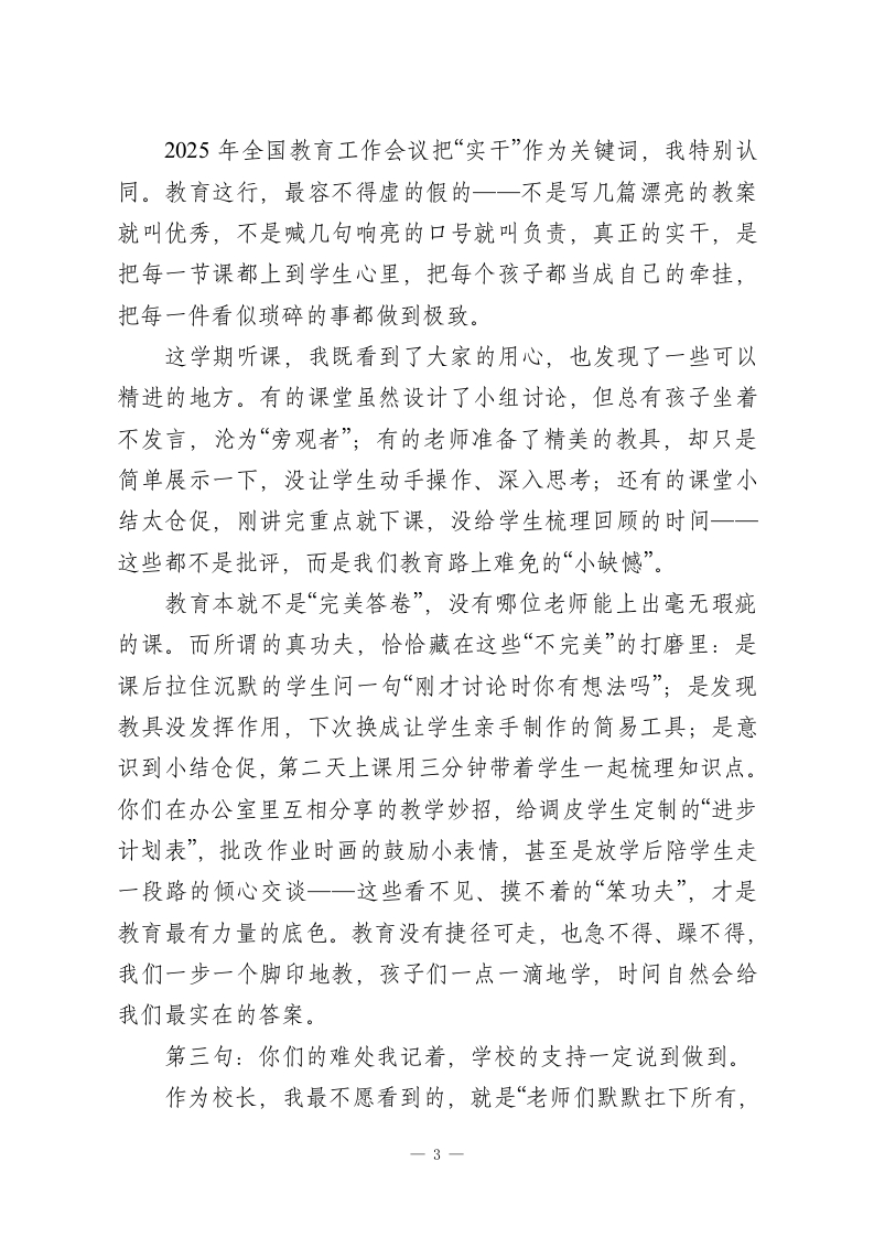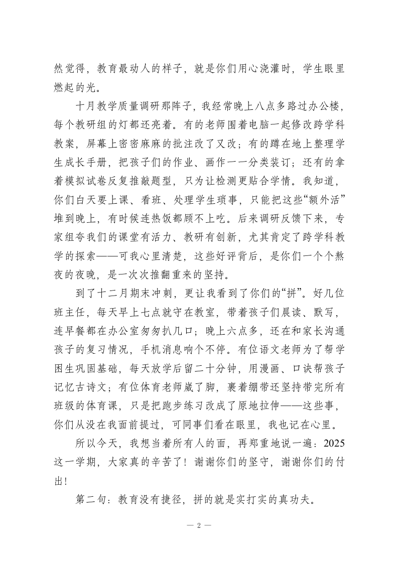 校长在期末最后一次教师大会上发言:不画饼,只走心各位老师:大家下午好!窗外的风裹着冬初的寒意,校园里的银杏叶早已化作满地金黄,枝头只剩疏朗的枝桠一转眼间,2025年秋季学期的时光就随着晨读的书声、备课的灯光,悄悄走到了尽头。这五个月里,我们一同熬过九月开学的手忙脚乱,扛过十一月期中检测的紧绷节奏,应对过一场场检查评估的细致打磨,更在日复一日的相处中,看着孩子们从懵懂生涩到逐渐懂事,从知识薄弱到慢慢精进。今天把大家聚在这里,不搞冗长的总结,不读枯燥的报表,就想和大家掏掏心窝子,说三句最实在的话。第一句:这学期,你们真的辛苦了一一这话,我藏在心里很久了。这不是逢场作戏的客套,是我亲眼所见、亲身感受的真切心疼。九月听课的时候,有两节课让我至今难忘。科学课上,老师没让学生死记硬背知识点,而是拎着几个透明水槽、几颗种子走进教室,让孩子们分组观察“种子发芽需要哪些条件”,有的记录浇水情况,有的监测光照时间,下课铃响了还围着实验台不愿走;英语课上,老师把教室布置成“校园超市”,让学生拿着自制单词卡扮演收银员和顾客,用英语讨价还价,连平时英语成绩垫底的孩子都主动举手参与一一我站在后门看着,忽1