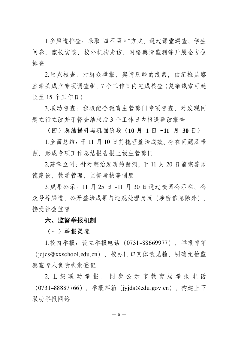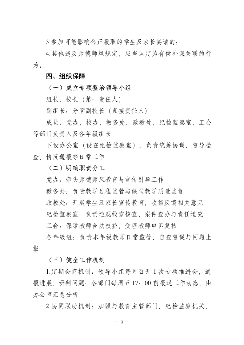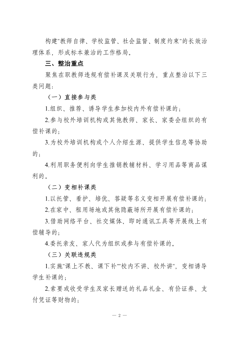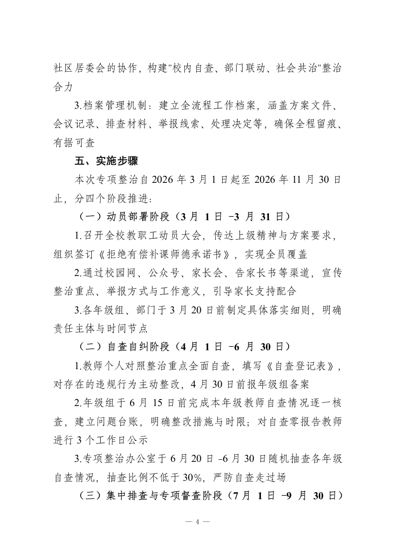学校2026年在职教师违规有偿补课专项整治实施方案(修订版)为进一步筑牢师德师风建设根基,规范教师从教行为,切实减轻学生过重课业负担与家庭经济压力,营造清正廉洁的育人环境,根据《新时代中小学教师职业行为十项准则》《中小学教师违反职业道德行为处理办法》《严禁中小学校和在职中小学教师有偿补课的规定》等文件要求,结合我校办学实际,修订完善本专项整治实施方案。一、指导思想坚持以立德树人根本任务为引领,以建设高素质专业化教师队伍为目标,以提升教师职业道德素养为核心,以规范从教行为为重点,秉持“教育与惩处并重、自律与他律结合、治标与治本兼顾“原则,健全师德师风建设长效机制,着力解决群众反映强烈的有偿补课突出问题,持续净化教育生态,办好人民满意的教育。二、工作目标通过专项整治实现"四个显著提升”:1.师德自律意识显著提升,教师抵制有偿补课的思想自觉全面增强;2.违规行为治理成效显著提升,在职教师有偿补课现象得到根本遏制;3.教育教学秩序规范度显著提升,校园育人环境持续优化;4.社会满意度显著提升,群众教育获得感不断增强。一1