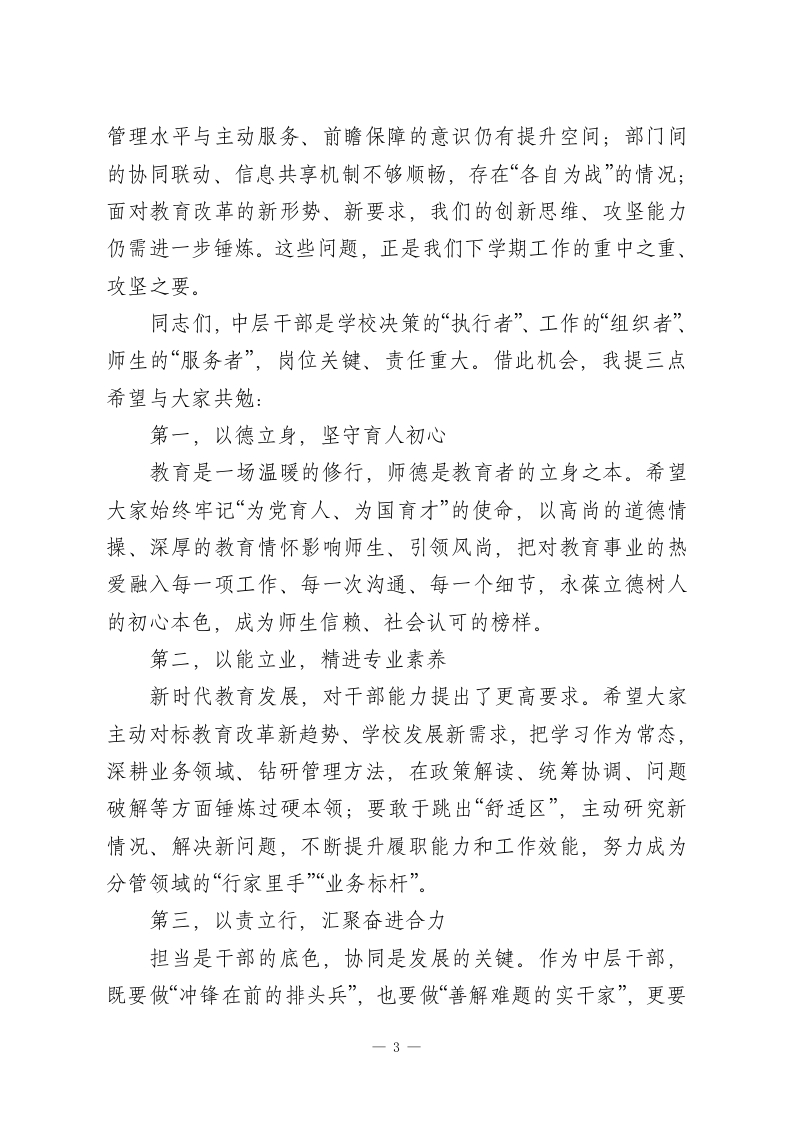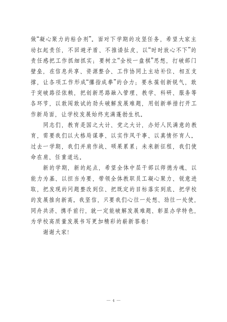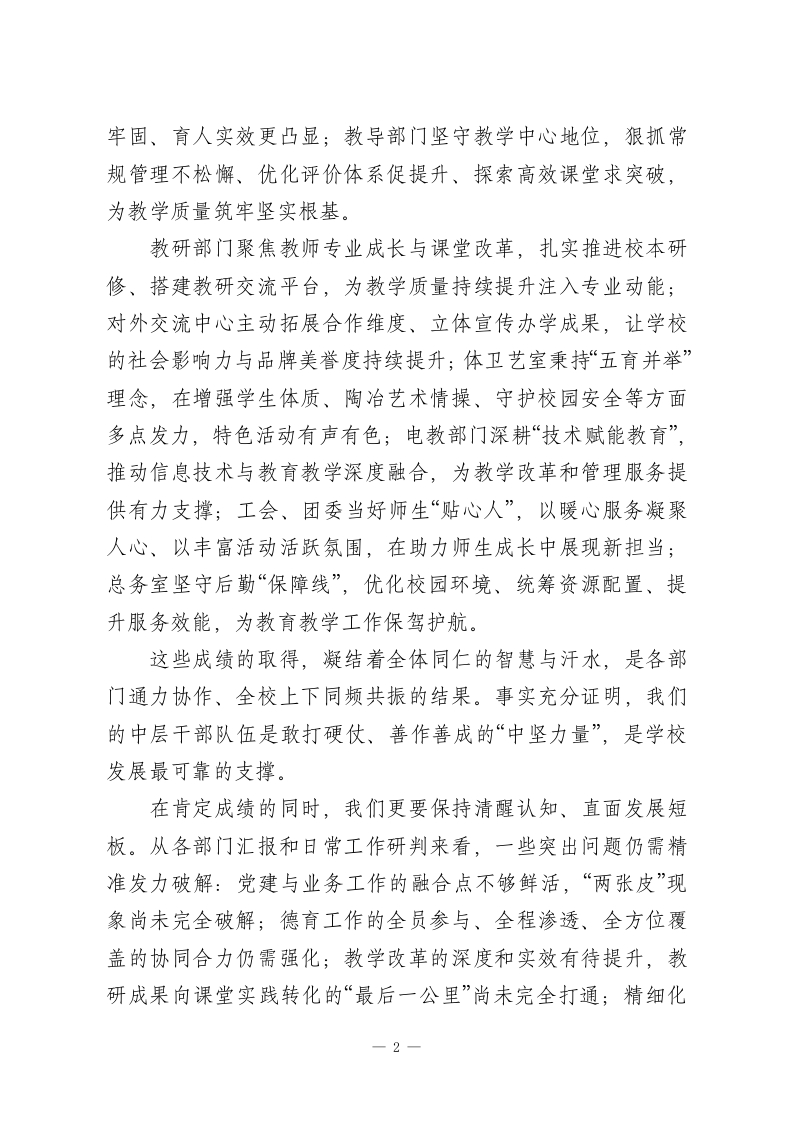 学校部门总结大会,校长总结讲话,大格局!各位同事,同志们:大家下午好!今天,我们齐聚于此,召开2025一2026学年度第一学期部门总结大会,既是对过往一学期的复盘沉淀,更是对未来发展的谋篇布局。刚才,各部门负责人的汇报全面详实、务实深刻:既客观呈现了履职尽责中的亮点成效,也坦诚剖析了工作推进中的短板不足,更清晰勾勒了后续改进的思路举措,充分展现了大家强烈的责任意识、鲜明的问题导向和务实的工作作风。在此,我代表学校党委和领导班子,向一学期来恪尽职守、勤勉付出的全体中层干部,并重通过你们,向默默耕耘在教育教学、管理服务一线的全校教职员工,致以最诚挚的感谢!回望这一学期,我们在挑战中承压奋进,在实干中收获成长。各部门紧紧围绕学校年度核心目标,各司其职、协同发力,推动学校各项事业迈出坚实步伐:党委始终锚定政治引领核心,以高质量党建赋能高质量发展,厚植理论学习沃土、筑牢组织建设根基、绷紧廉政自律之弦,为学校发展提供了坚强的政治保障和组织支撑;办公室充分发挥“中枢枢纽”作用,以制度完善提质、以流程优化提效、以服务保障提能,确保学校日常运转规范有序、重点工作落地见效;德育部门紧扣“立德树人”根本任务,深耕班级精细化管理、深化主题教育实践、严抓学生行为规范,让育人主阵地更-1