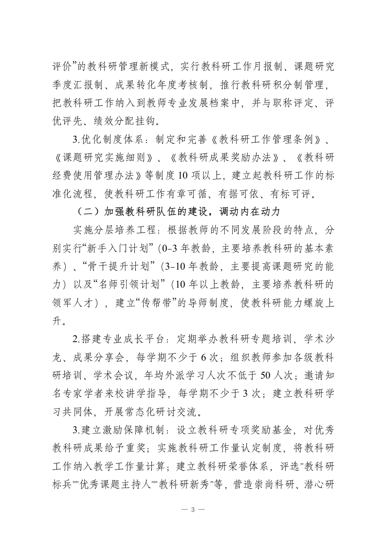 学校教科研十五五发展规划(2026-2030年)一、指导思想全面贯彻党的教育方针,深入落实立德树人根本任务,以新时代教育评价改革为指导,紧扣学校“质量立校、科研兴校、特色强校”的办学理念,以核心素养培育、教学质量提升、教师专业发展为三大重点,坚持“问题导向、需求驱动、成果转化、协同创新”的教科研工作原则,形成“纵向贯通、横向联动、内外协同”的教科研工作新局面,使教科研由经验积累转向科学研究,由个体探索转向团队合作,为学校教育教学改革发展提供智力支持和决策参考,努力创建区域教科研高地。二、发展目标(一)全局性目的到2030年,建成“理念先进、机制健全、队伍优良、成果显著、特色鲜明”的现代化教科研体系,实现教科研与教育教学深度融合、与教师发展同频共振、与学生成长紧密相连,教师教科研能力明显提升,教科研成果转化率大幅提高,形成具有示范引领作用的教科研工作模式,创建成为市级教科研示范基地,为推进学校教育现代化、办好人民满意教育提供坚强保障。(二)具体目的队伍建设计划:建立完善的教科研骨干教师梯队,培养出1-2名省级教科研名师、5-8名市级教科研带头人、15-20名区级教科研骨干、60名以上的校级教科研骨干,使教师参与教科1
