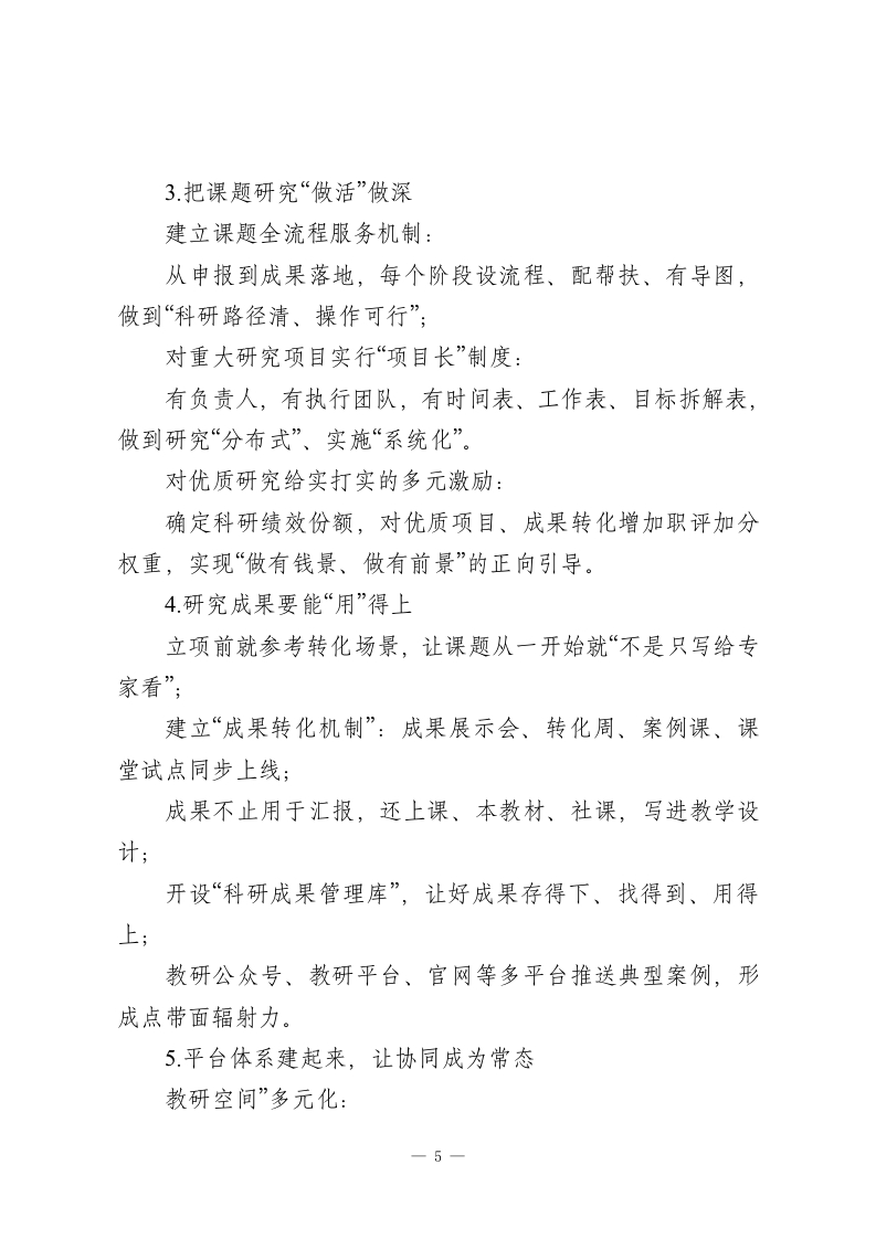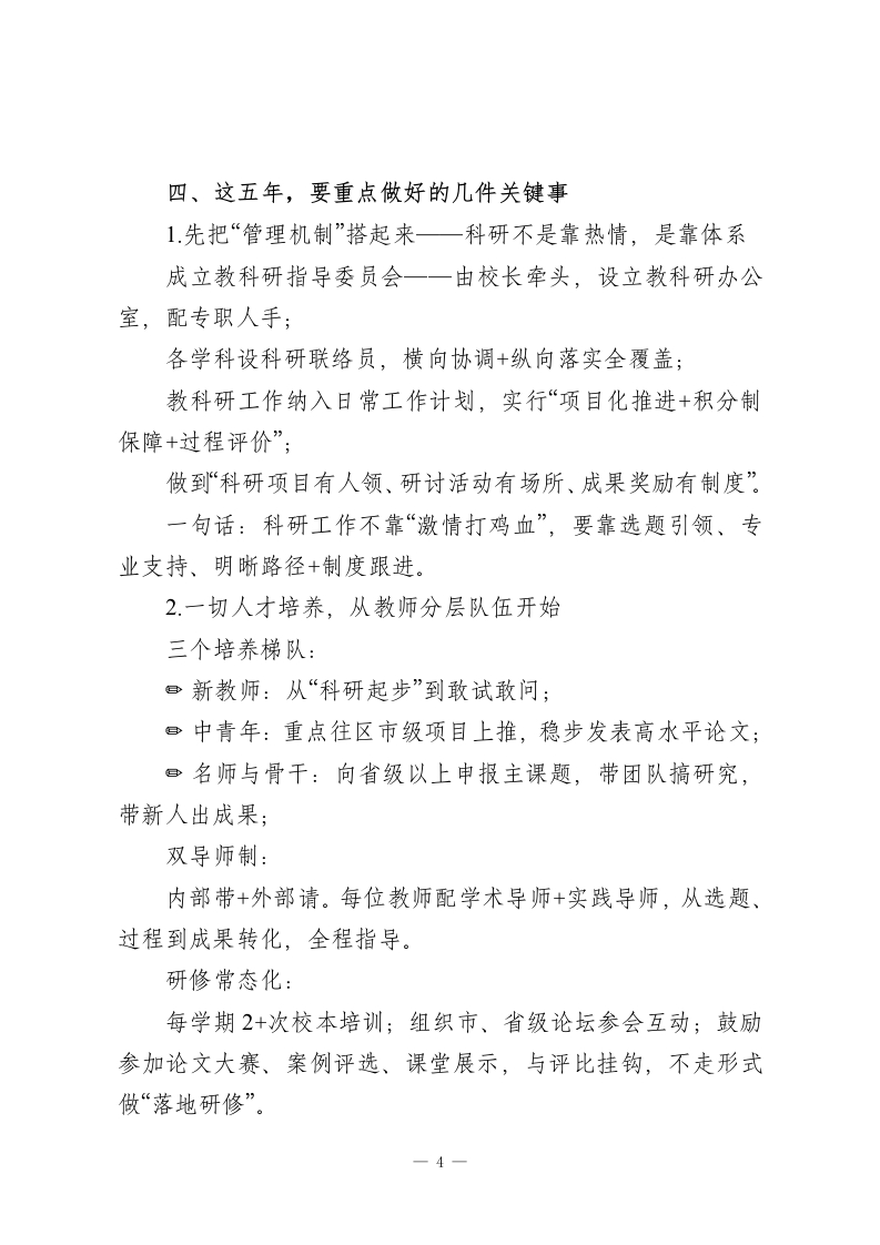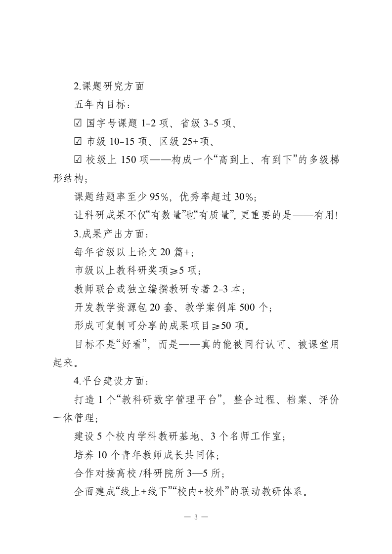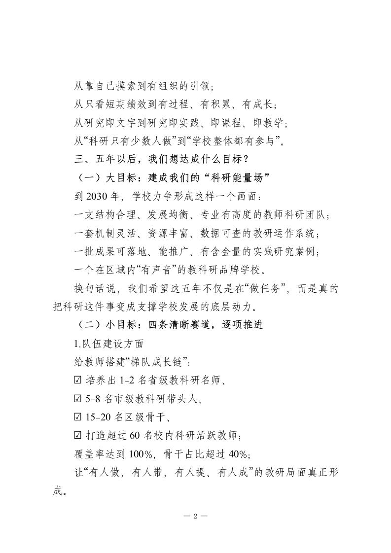 学校教科研十五五发展规划(2026-2030年)一、为什么我们要做这件事?当下,基础教育正经历一场深层次的重构。育人方式在变,课堂形态在变,教师角色在变,甚至学生的学习方式、成长需求也在悄然改变。站在“十四五”收官、“十五五”起步的重要节点上,学校发展不能再只靠经验“摸着石头过河”。我们必须依靠科学研究+团队力量+专业思维,不仅做好当下的教学,更要看清趋势、设法破局,推动教育提质升级。所以,我们打算好好做一件事一建立一个系统、高效、有温度的教科研机制,让科研真正从“可有可无的附属品”转变为“撬动教育品质的核心力”。二、我们的核心指导思想是我们将坚持党的教育方针,落实立德树人的根本任务,以新时代教育评价改革为引领,紧扣“质量立校、科研兴校、特色强校”的办学逻辑。教科研不会单打独斗。我们将站在学校整体发展的高度来看问题,把教师的专业成长、学生的真实获得、学校的内涵提升打通串联起来,构建全方位、多层次的教科研支持和推动体系。简单说,就是要做到“四个转变”:一1-
