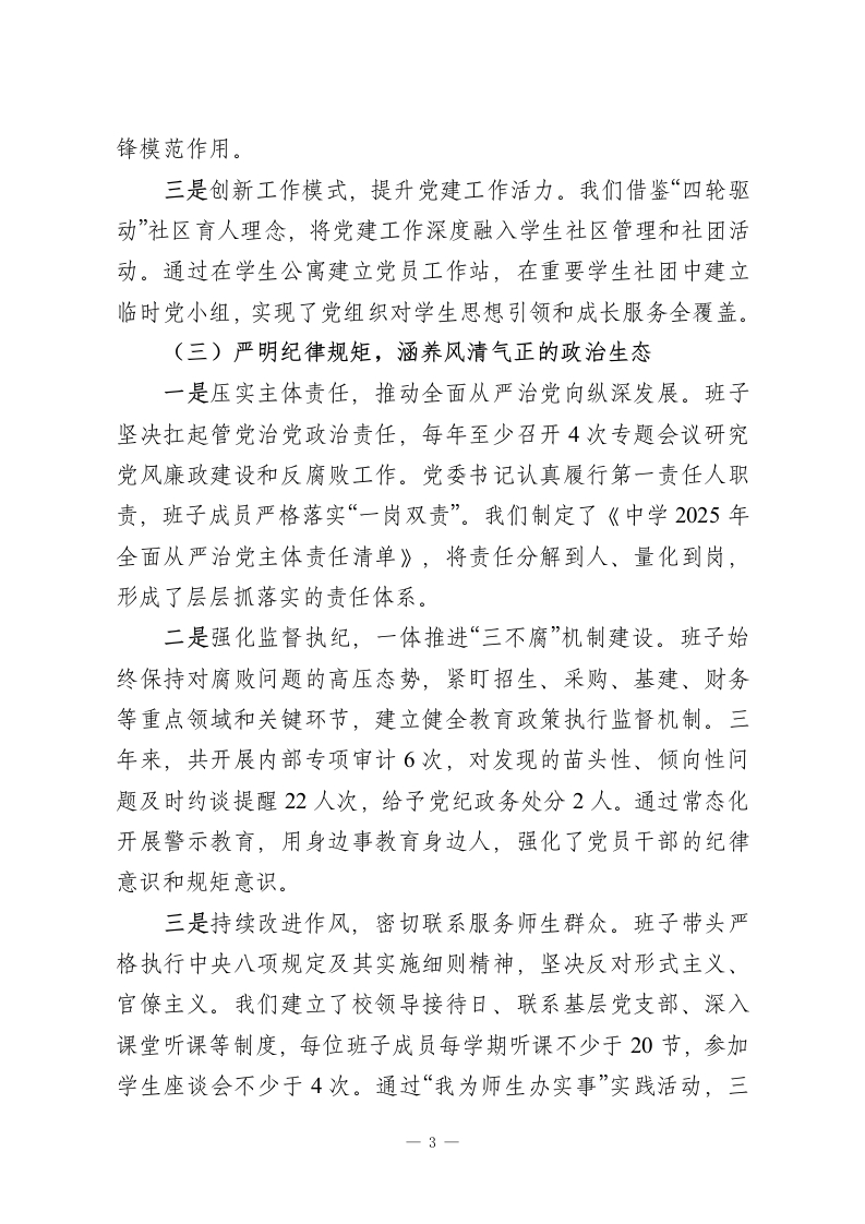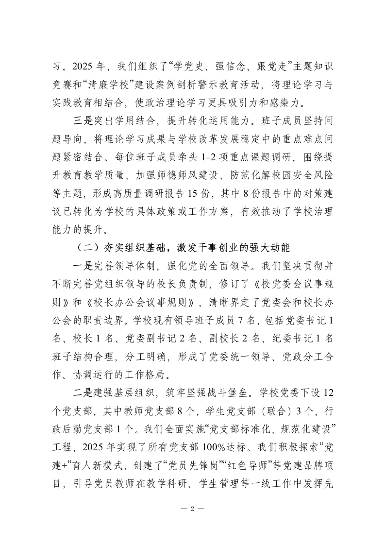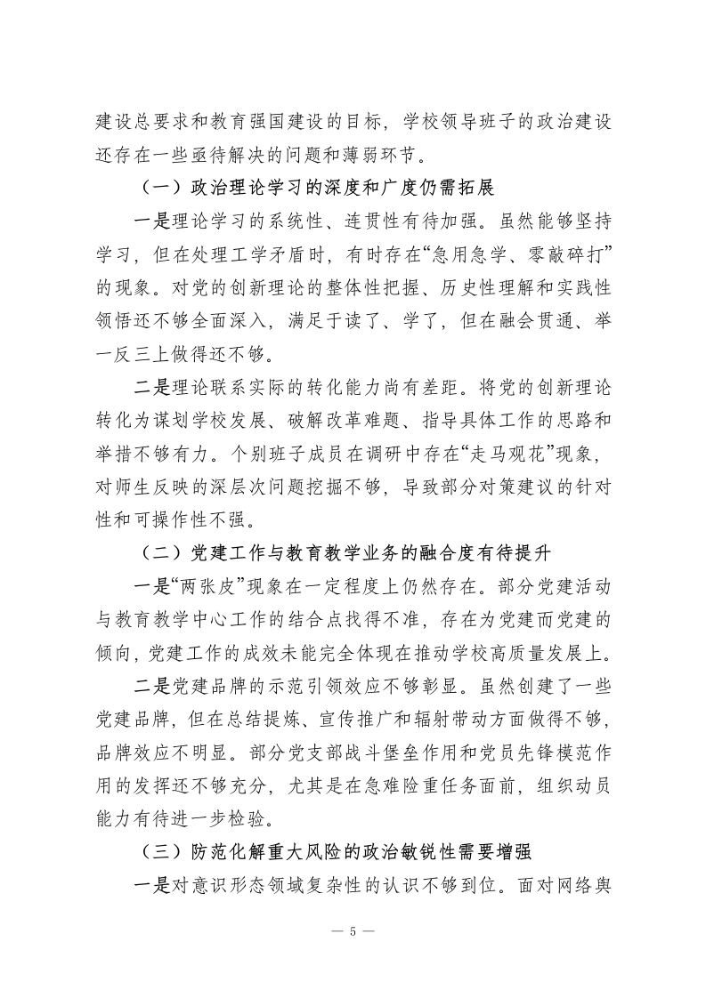 学校领导班子政治建设自查自评报告根据上级党委关于加强领导班子政治建设的统一部署和要求,中学党委领导班子对照《关于加强党的政治建设的意见》等文件精神,聚焦工作实践,进行了系统、全面、深入的自查自评。现将有关情况报告如下。一、坚持政治引领,管党治校能力建设取得新成效学校领导班子始终将党的政治建设摆在首位,坚持以习近平新时代中国特色社会主义思想为指导,深入学习贯彻党的二十大及历次全会精神,深刻领悟“两个确立”的决定性意义,增强“四个意识”、坚定“四个自信”、做到“两个维护”,不断提高政治判断力、政治领悟力、政治执行力,确保党的教育方针和上级决策部署在学校不折不扣地得到贯彻落实。(一)强化理论武装,筑牢政治忠诚的思想根基一是坚持学习为先,拧紧思想“总开关”。班子始终将理论学习作为首要政治任务,严格执行“第一议题”制度。组织党委理论学习中心组集体学习,专题研讨,内容涵盖习近平新时代中国特色社会主义思想、党的二十大精神、《教育强国建设规划纲要》等。班子成员平均每年撰写学习心得和调研报告6篇以上,在学思践悟中不断筑牢信仰之基、补足精神之钙、把稳思想之舵。二是创新学习形式,增强教育实效性。在坚持集中学习的基础上,积极探索多样化的学习模式。我们利用“智慧党建”平台,开设线上学习专栏,推动班子成员利用碎片化时间自主学1