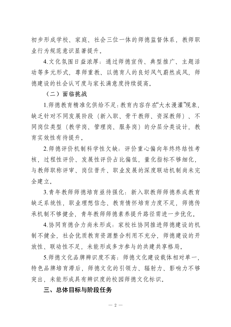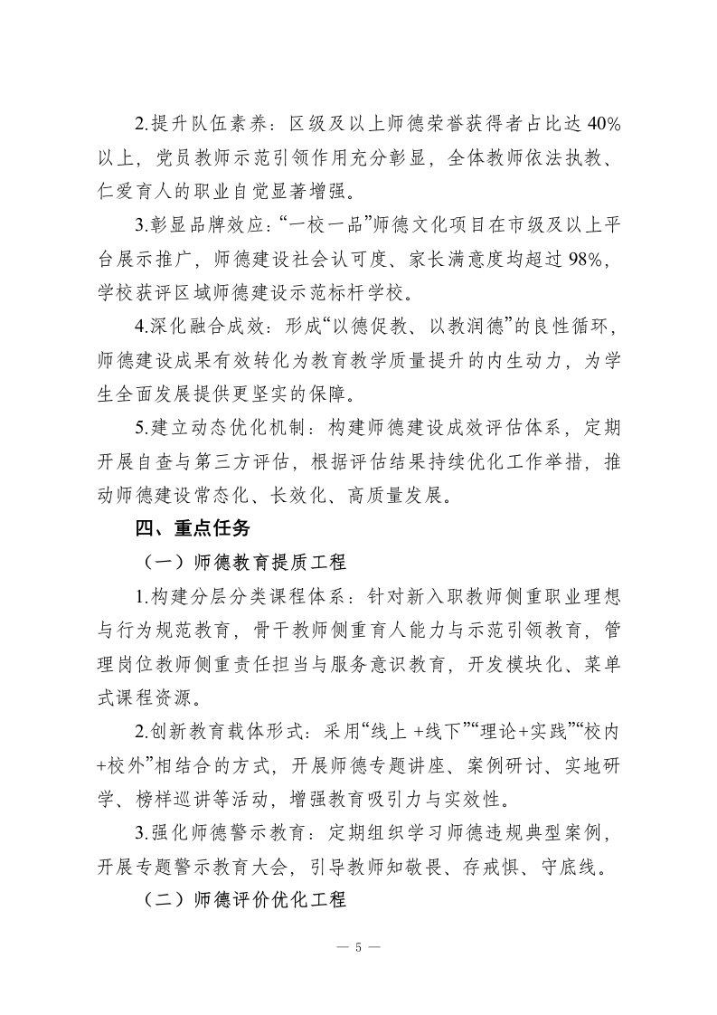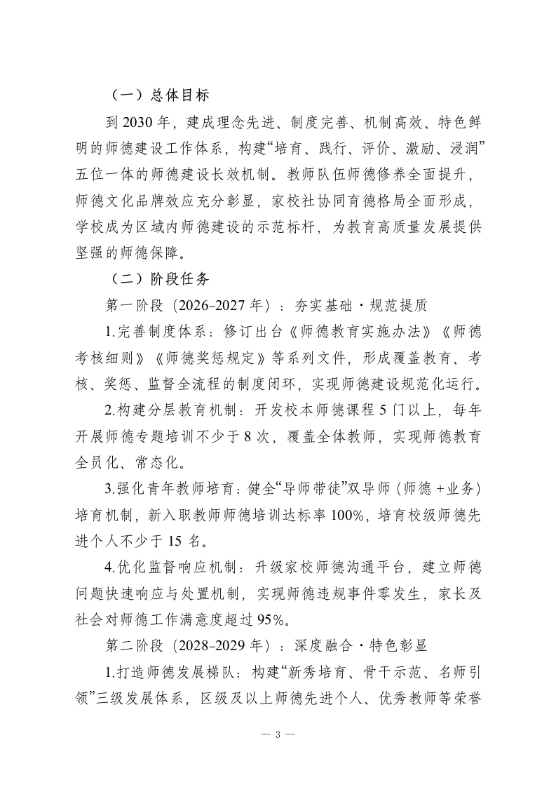 学校师德建设十五五(2026-2030年)发展规划一、指导思想以习近平新时代中国特色社会主义思想为指导,全面贯彻党的教育方针,深入落实立德树人根本任务,严格执行《新时代中小学教师职业行为十项准则》《关于加强和改进新时代师德师风建设的意见》等中央及地方相关文件要求。立足学校教育改革发展实际,紧扣教师队伍建设核心需求,坚持“师德为先、以德育德、德能并进”工作理念,推动师德建设从“制度约束”向“价值引领、文化涵养、专业赋能”三位一体转型,着力打造一支信念坚定、品德高尚、学识扎实、仁爱奉献的高素质专业化教师队伍,为学校教育事业高质量发展、学生全面健康成长筑牢师德根基。二、发展基础与形势研判(一)发展基础1.制度体系日趋完善:已构建师德师风建设长效机制,严格落实师德考核“一票否决制”,建立健全师德承诺、师德档案、师德考评等系列制度,师德管理规范化、制度化水平持续提升。2.队伍素养整体良好:通过常态化开展师德专题教育、警示教育、典型选树等活动,教师依法执教意识普遍增强,涌现出一批师德标兵、优秀班主任等先进典型,党员教师示范引领作用充分发挥。3.监督机制逐步健全:依托家校沟通平台与师德投诉渠道,一1