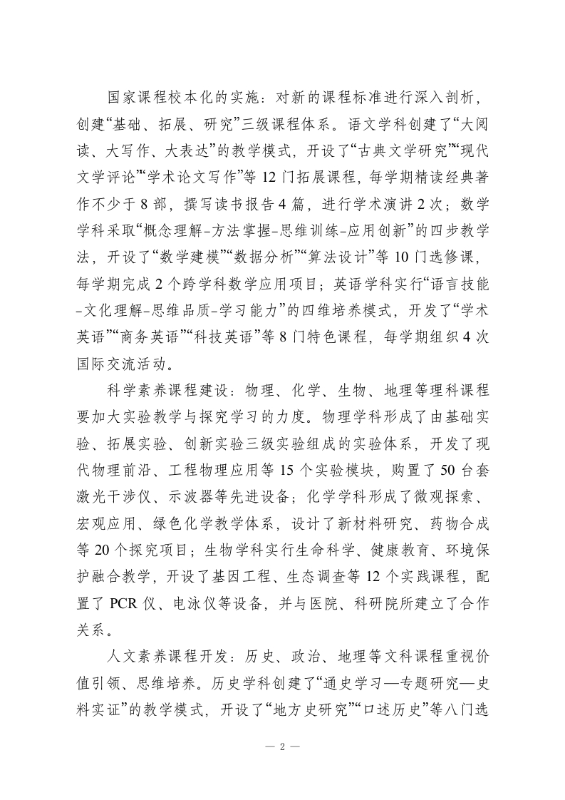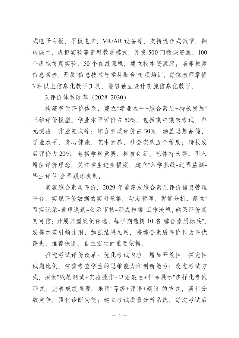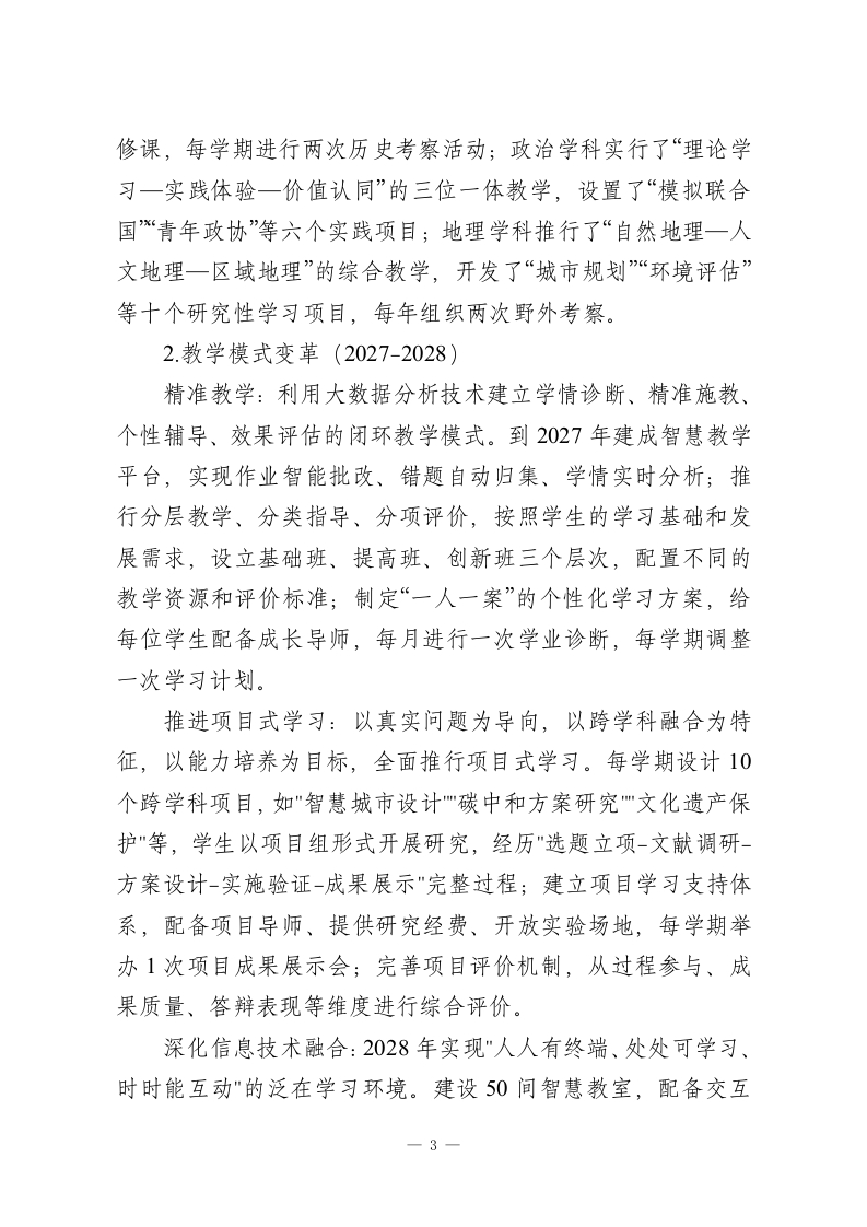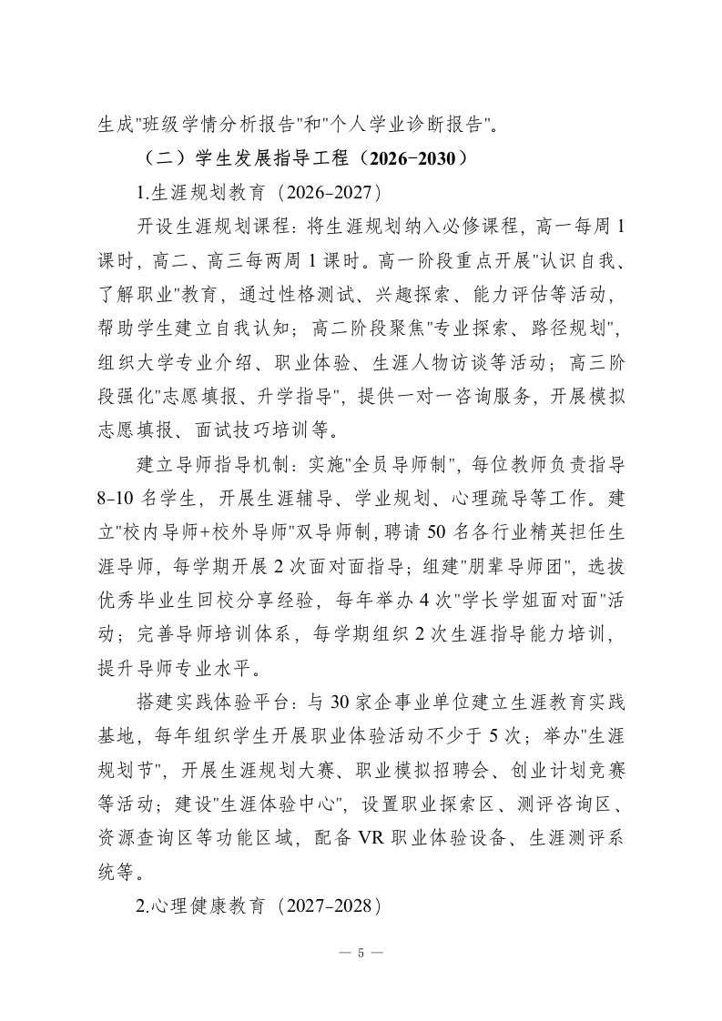 学校十五五发展规划2026-2030(高中版)一、总体目标“十五五”期间(2026-2030年),学校坚持“育人为本、质量立校、创新驱动、特色发展”的办学理念,把培养具有家国情怀、国际视野、创新精神、实践能力的时代新人作为根本任务,全面建设现代化高品质高中教育体系。通过深化课程改革、创新育人模式、优化治理结构、提高办学质量,到2030年建成理念先进、特色鲜明、质量上乘、影响广泛、区域示范性高中。具体目标是:学生综合素质评价优秀率要达到75%以上,高考一本上线率要保持在85%以上,“双一流”高校录取率要达到45%,学科竞赛省级以上获奖人数每年都要超过100人次,科技创新成果转化率要达到15%,学生体质健康合格率要保持在99%以上,心理健康测评优良率要达到95%,家长满意度和社会认可度都要超过96%。为了保证目标的实现,学校将采取“三步走”的战略:2026-2027年为打好基础阶段,主要任务是课程体系重建、教学方式革新、评价体系改革;2028-2029年为提高质量阶段,主要工作为特色项目建设、品牌学科创建、创新人才培育;2030年为塑造品牌阶段,全面形成“文理兼备、科技突出、人文深厚、全面发展”的办学特色,成为省内一流、全国闻名的高品质高中。二、重点任务与实施路径(一)课程教学创新工程(2026-2030)课程体系重构(2026-2027)1
