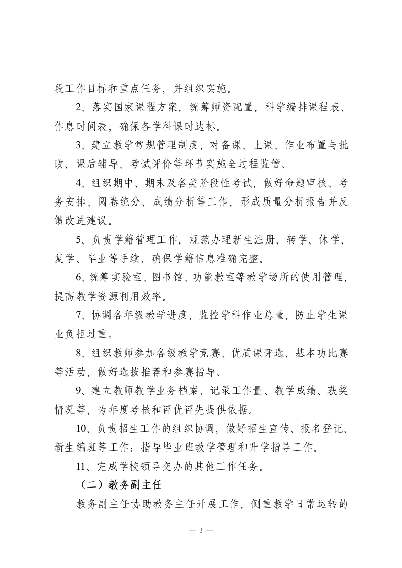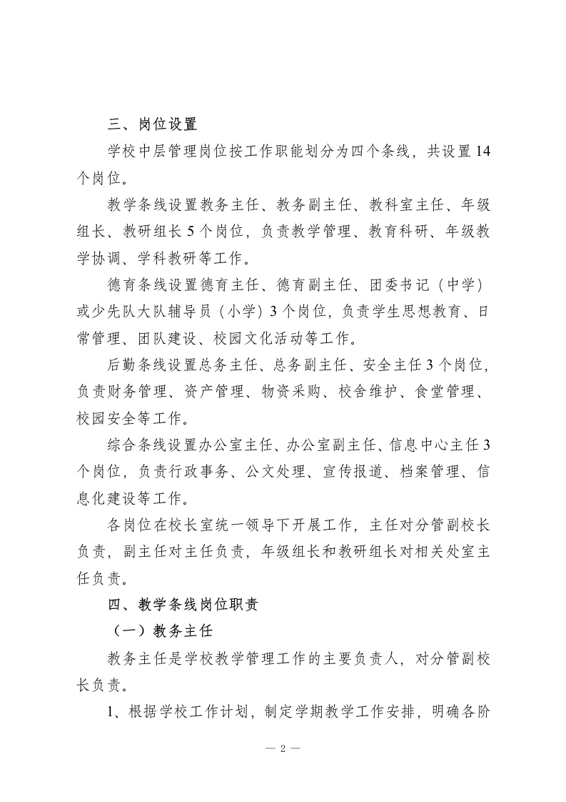 学校中层管理岗位职责及分工明细(2026年版)为进一步理顺学校内部管理体制,明确中层干部岗位职责,建立权责清晰、分工合理、协同高效的管理运行机制,根据上级有关文件精神,结合学校实际,特制定本方案。一、指导思想以习近平新时代中国特色社会主义思想为指导,全面贯彻党的教育方针,落实立德树人根本任务。坚持“精简高效、权责统一”的原则,科学设置中层管理岗位,明确职责边界,强化协同配合,充分调动中层干部的积极性和创造性,为学校高质量发展提供坚强的组织保障。二、设置原则(一)因事设岗,职责明确。根据学校管理实际需要设置岗位,做到事事有人管、件件有落实,避免职能交叉和管理盲区。(二)精干高效,合理配置。科学核定岗位数量,配强配优中层队伍,确保人岗相适、人尽其才。(三)权责对等,考核挂钩。赋予中层干部相应的管理权限,建立目标管理和绩效考核机制,做到有责必考、考用结合。(四)上下贯通,协同联动。中层干部既要对校级领导负责,又要指导基层落实,发挥好承上启下的枢纽作用,形成管理合力。1