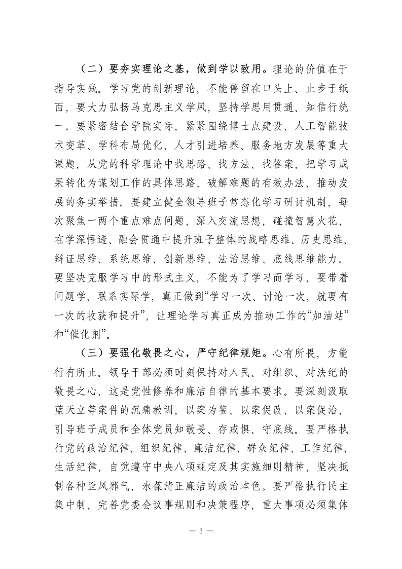 学院党委书记在2025年度党委领导班子和党员领导干部民主生活会上的表态发言同志们:刚才,我们学院党委领导班子召开了一次严肃认真、富有成效的2025年度民主生活会。会议紧紧围绕深入学习贯彻习近平新时代中国特色社会主义思想和相关重要讲话精神,全面落实党中央决策部署和上级工作要求这一主题,班子成员本着对党、对事业、对同志高度负责的态度,全面检视问题,深刻剖析根源,认真开展批评与自我批评,明确了整改方向。校党委常委、副校长X同志亲临指导,对本次民主生活会给予了充分肯定,认为会议准备充分、程序规范、查摆深入、批评坦诚、措施务实,符合上级要求,成效明显。同时,X校长也深刻指出了我们X学院当前面临的战略机遇与挑战,对学院党委进一步提高政治站位、优化政治生态、深化理论武装、狠抓整改落实、加强顶层设计、拓展学科布局、加大人才引进、强化服务担当意识,推动学院实现跨越式发展提出了明确要求和殷切期望。X校长的点评讲话,站位高远、思想深刻、语重心长,为我们做好下一步工作指明了方向。我们要认真学习领会,坚决贯彻落实。下面,我代表学院党委领导班子,就抓好本次民主生活会查摆问题的整改落实,进一步加强班子自身建设,推动学院事业高质量发展,讲几点意见。一、铸魂强基,锻造坚强领导核心1