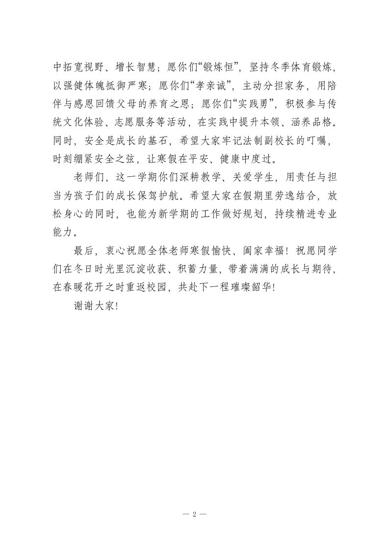 以收获为基,赴冬日韶华2025-2026学年第一学期散学典礼上的致辞亲爱的老师们、同学们:大家上午好!岁序更替,华章日新。今天,我们齐聚篮球场,以庄重的仪式盘点这一学期的耕耘与收获,为2025-2026学年第一学期画上圆满句号。从九月金风里的初见欢颜,到一月寒冬日的硕果盈枝,实小学子用勤奋与坚守,在校园的每一处留下了成长的足迹。回望这一学期,我们共同见证了太多精彩与感动。教学提质路上,课堂焕发勃勃生机,同学们在知识的海洋中探求真知;校园文化节上,大家用歌声、画笔、舞姿展现多才多艺的青春风采;秋季运动会上,运动健儿们奋勇争先,诠释着“更快、更高、更强”的体育精神;研学实践中,大家走出课堂,在实地探访里触摸历史、感知自然,将书本知识转化为实践能力。每一项成果的取得,都离不开老师们的悉心教诲与无私奉献,也凝聚着同学们的不懈努力与执着追求。在此,我谨代表学校,向辛勤耕耘的全体教职工致以最诚挚的感谢,向茁壮成长的每一位同学表示最热烈的祝贺!同学们,寒假是休憩调整的时光,更是蓄力成长的契机。在此,我向大家提出四点期望:愿你们“读书勤”,在书香浸润