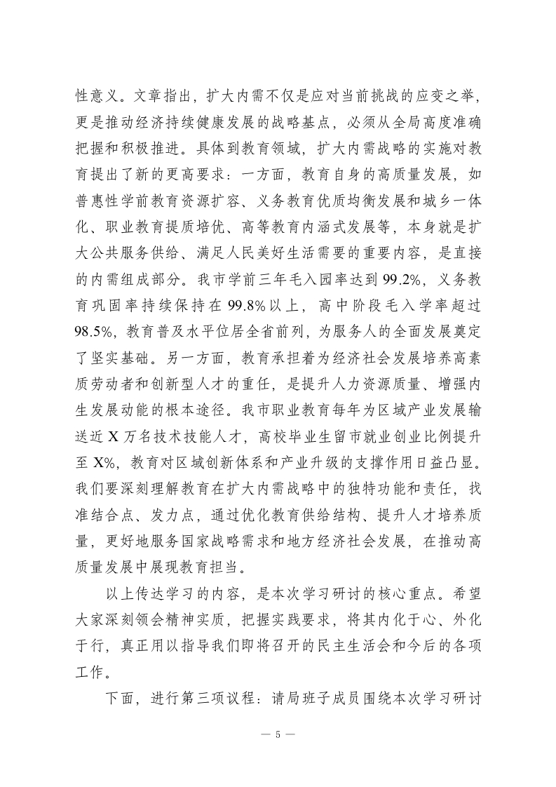 在市教育局班子2025年度民主生活会会前学习研讨会上的讲话同志们:现在开会。根据中央、省委和市委的统一部署要求,为高质量开好市教育局班子2025年度民主生活会,今天我们召开局理论学习中心组集体学习暨民主生活会会前学习研讨会。这次会议的主要任务是:聚焦民主生活会主题,持续深化理论学习,统一思想、深化认识,打牢开好民主生活会的思想基础和政治基础。会议旨在通过深入学习领会党的创新理论,特别是习近平总书记关于党的建设的重要思想、关于党的自我革命的重要思想,以及近期一系列重要讲话和指示批示精神,进一步深刻领悟“两个确立”的决定性意义,增强“四个意识”、坚定“四个自信”、做到“两个维护”,切实把思想和行动统一到党中央决策部署上来,以高度的政治自觉、思想自觉和行动自觉,为接下来严肃认真开好年度民主生活会做好充分准备。根据安排,本次学习研讨会共有四项议程。下面,进行第一项议程:通报自学情况。根据方案安排,会前,局班子成员及理论学习中心组成员围绕民主生活会主题,认真开展了个人自学。重点学习了习近平总书记关于党的建设的重要思想、关于党的自我革命的重要思想,以及关于加强党的纪律建设、作风建设的重要论述;学习了习近平总书记在二十届中央政治局第二十一次集体学习时1