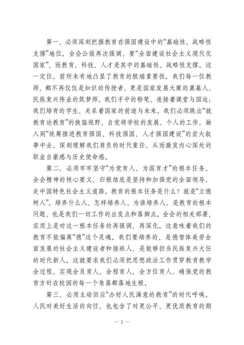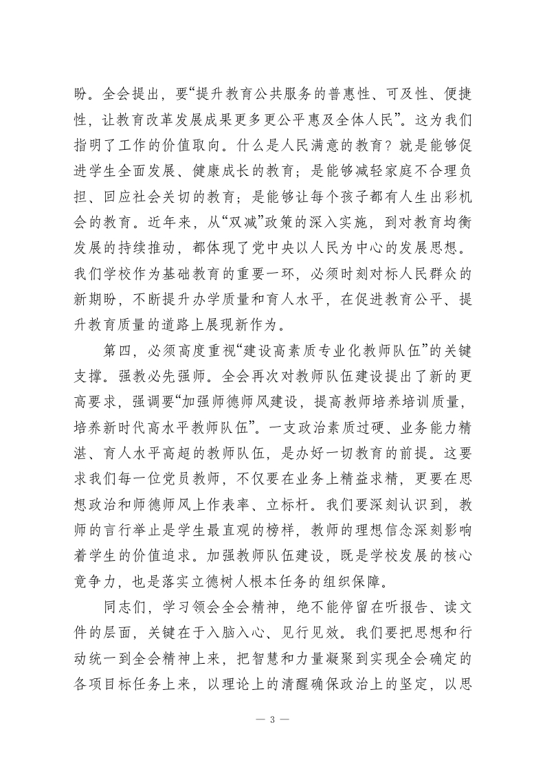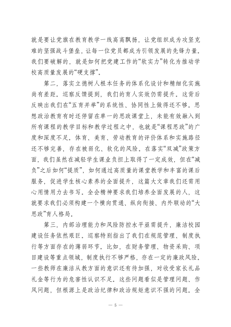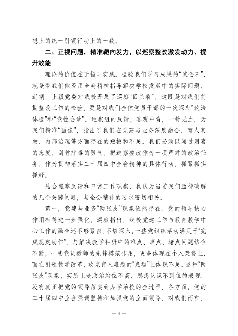 专题党课:以全会精神为指引奋力开创学校高质量发展新局面同志们:大家好!在全校上下深入学习贯彻党的二十大精神,奋力冲刺年度目标任务的关键节点,我们齐聚一堂,召开专题党课。今天的党课,既是一次凝心铸魂的政治理论学习,也是一次正视问题、砥砺前行的工作部署会。主要任务是,深入学习领会党的二十届四中全会精神,紧密结合近期巡察回头看反馈的意见,深刻剖析我校在党建引领教育教学高质量发展中面临的挑战与机遇,动员全体党员教师进一步统一思想、提高站位、强化担当,以更加昂扬的斗志、更加务实的作风,奋力谱写学校事业发展的新篇章。下面,我将围绕深学全会精神、把握育人使命、强化实践担当这条主线,讲三个方面的意见。一、深刻领会,把握核心要义,以全会精神统一思想、凝聚共识党的二十届四中全会,是在中华人民共和国成立76周年、即将开启十五五规划新征程的历史时刻,召开的一次具有全局性、历史性意义的重要会议。全会审议通过的中共中央关于制定国民经济和社会发展第十五个五年规划的建议,为我们擘画了未来五年乃至更长时期国家发展的宏伟蓝图。作为教育工作者,我们必须深刻认识到,全会精神博大精深、内涵丰富,尤其是其中关于教育事业的系列新论断、新部署、新要求,为我们办好人民满意的教育提供了根本遵循和行动指南。1