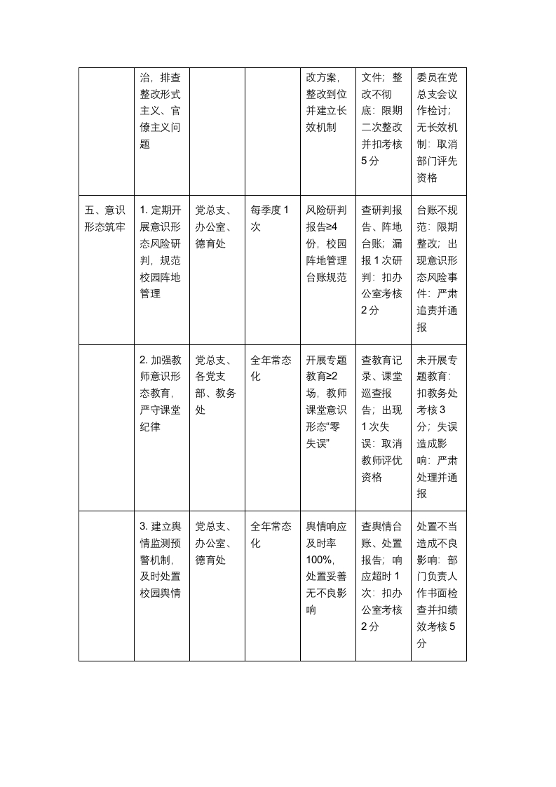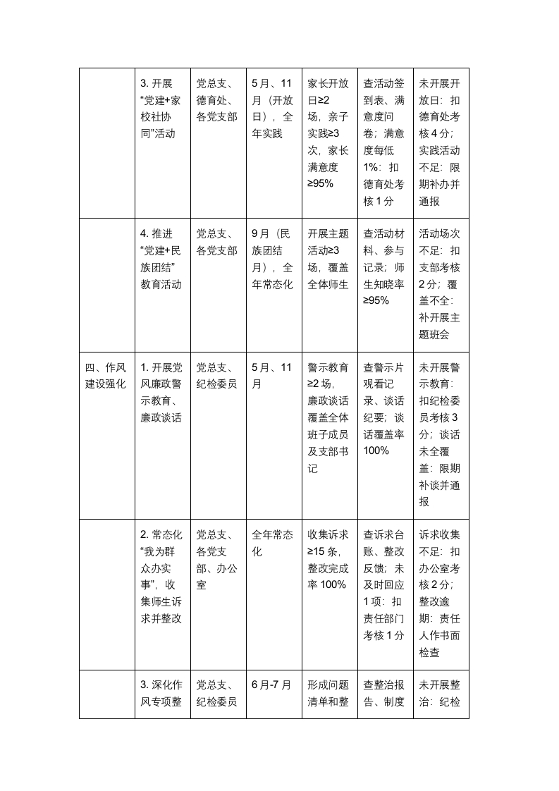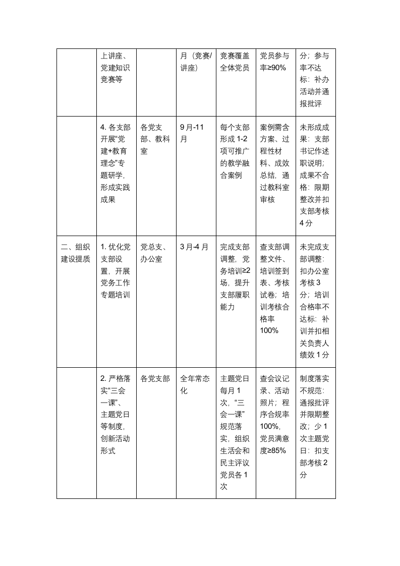 2026年学校党建工作重点任务分解表(含考核标准与责任追究细则)核心类别具体任务责任主体时间节点量化目标考核标准责任追究关键要求细则一、理论1.制定年党总支、2月中旬形成可落计划要素未按时完武装深化度理论学办公室前地的学习完整(主成:办公习计划清单,明题、内室主任作聚焦习近确每月学容、形书面检平新时代习主题式、责查:计划中国特色任),通不合格返社会主义过党总支工且扣部思想、党审议,2门绩效考的最新政月20日核2分策及教育前印发重要论述2.开展党总支、全年常态集中学习查学习记少1次集“四级联各党支部化不少于录、研讨中学习研学"活12次,纪要、笔讨:扣对动,每月专题研讨记;集中应责任支1次党总不少于4学习到会部考核3支集中学次,党员率分:党员习、每季自学笔记≥95%,笔记未达度1次专人均不少笔记完成标:限期题研讨于5000率100%补写并取字消当月评优资格3.创新学党总支、4月、10组织研学查活动方未按要求习载体,各党支部月(研2次,线案、照开展:扣开展红色学),6上讲座24片、参与责任部门研学、线月、12场,知识签到表:考核5