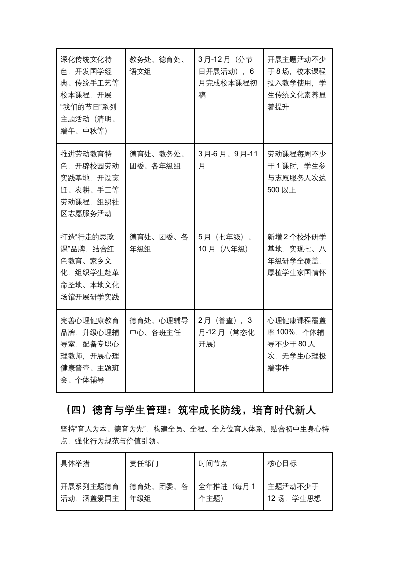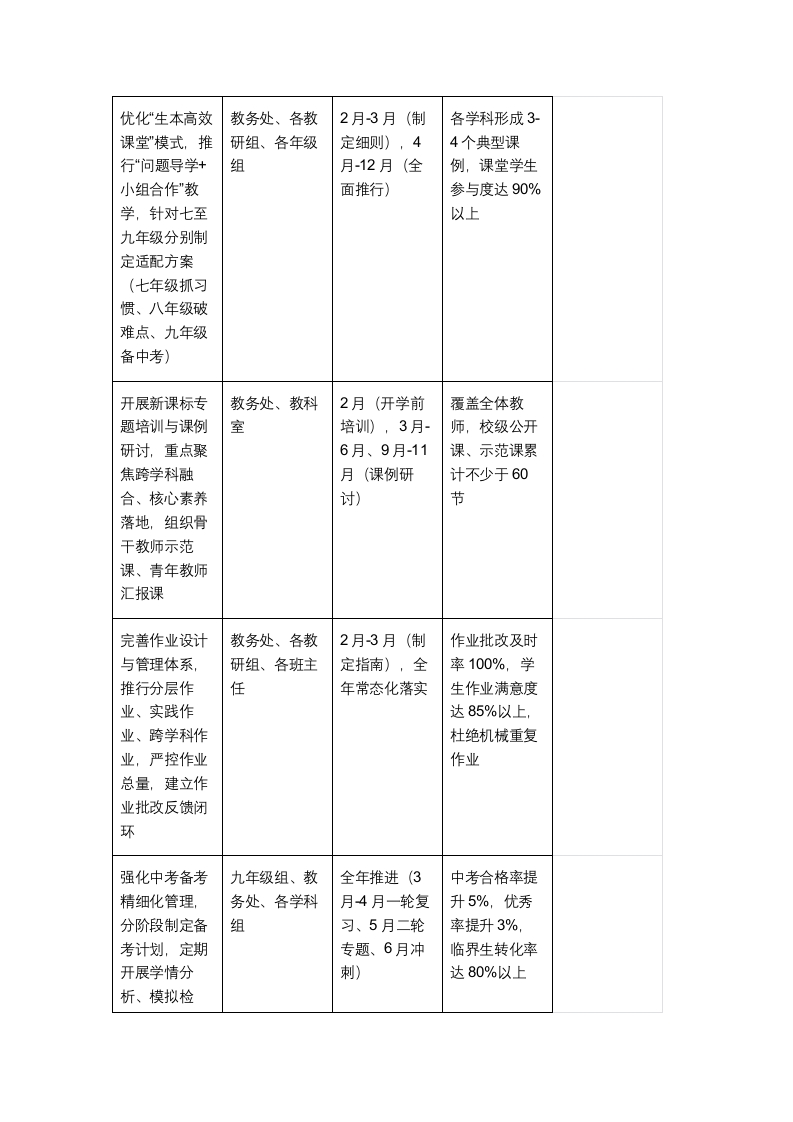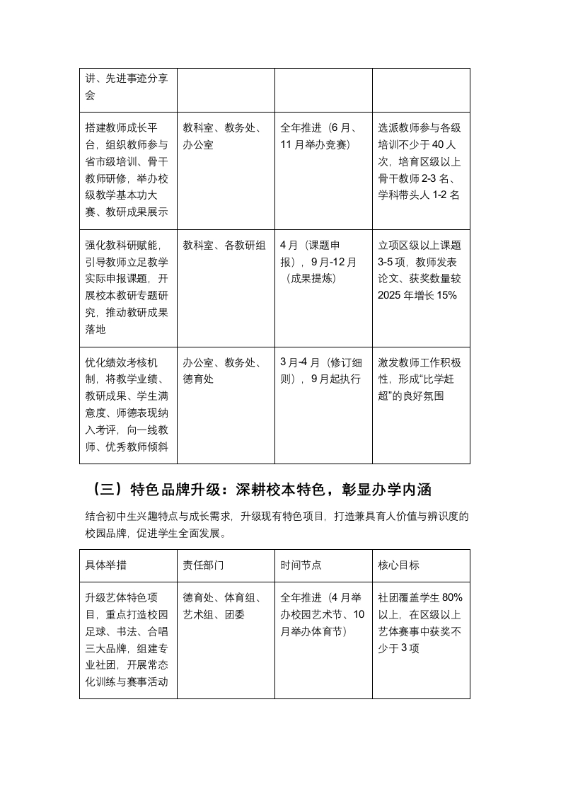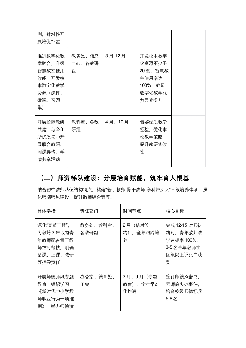初中2026年学校重点工作推进方案一、方案总则(一)核心目标紧扣初中教育教学规律与学生身心发展特点,以“提质增效、育人为本、特色赋能”为核心,深化课堂教学改革、建强分层师资梯队、升级校本特色品牌,夯实办学根基,促进学生全面发展、教师专业成长,推动学校办学品质稳步提升,打造有温度、有内涵的初中教育阵地。(二)适用范围全校各行政部门、各年级组、各学科教研组及全体教职工。(三)工作原则1.目标导向:聚焦核心任务,量化考核指标,确保每项工作有方向、有抓手、有成效。2.责任闭环:明确部门职责与个人分工,构建“校长统筹、分管领导牵头、责任部门落实、协同部门配合”的工作体系,形成全流程闭环管理。3.务实适配:贴合初中七至九年级学段差异,兼顾学业提升与素养培育,举措科学可行、贴合校情:4.动态优化:根据上级政策调整、工作推进实效,适时完善举措,保障方案的针对性与灵活性。二、核心任务与实施举措(一)教学改革深化:聚焦课堂提质,夯实学业根基立足初中课标要求与中考导向,优化课堂生态,落实“双减"政策,兼顾分层教学与全员提升,推动教学质量稳步攀升。具体举措责任部门时间节点核心目标