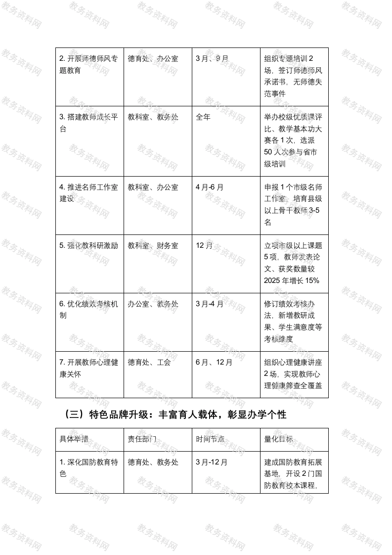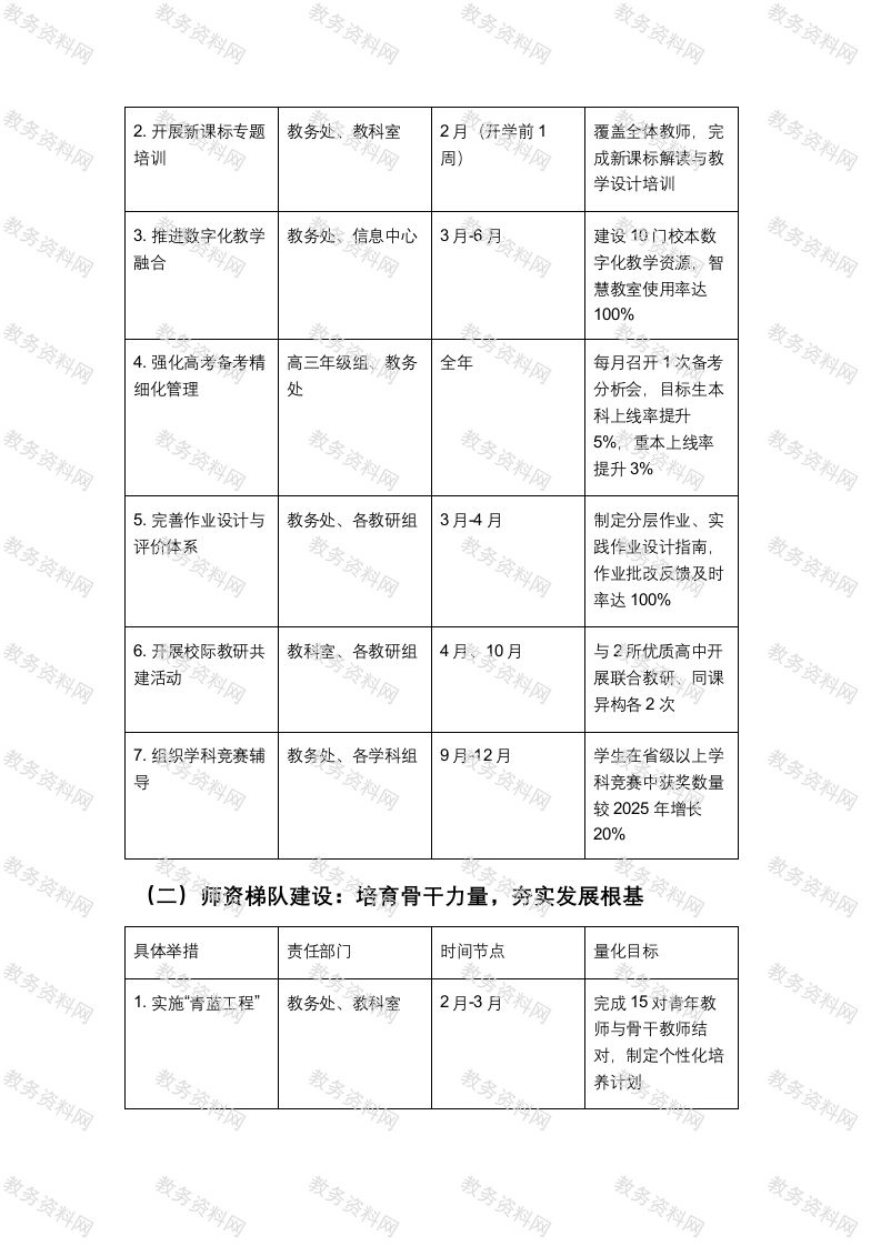 高中2026年学校重点工作推进方案一、方案总则(一)核心目标以“提质增效、特色赋能、内涵发展”为核心,深化教学改革、建强师资队伍、升级特色品牌,推动学校教育教学质量与办学品质再上新台阶,为学生全面发展和高考升学提供坚实支撑。(二)适用范围全校各部门、各年级组、各学科教研组及全体教职工。(三)工作原则1.目标导向:聚焦核心任务,明确量化指标,确保每项工作有方向、有抓手。2.责任到人:细化部门职责与个人分工,形成“一把手统筹、分管领导牵头、责任部门落实、相关部门协同”的工作格局。3.闭环管理:建立“计划一执行一督查一反馈一整改”全流程机制,确保工作落地见效。4.动态优化:根据实际推进情况与上级要求,适时调整工作举措,保障方案科学性与可行性。二、核心任务与实施举措(一)教学改革深化:打造高效课堂,提升升学质量具体举措责任部门时间节点量化目标1.优化课堂教学模教务处、各教研组2月3月制定“问题导向+分式层教学”实施细则,各学科形成23个典型课例