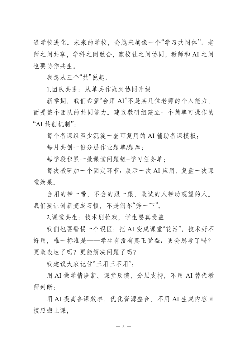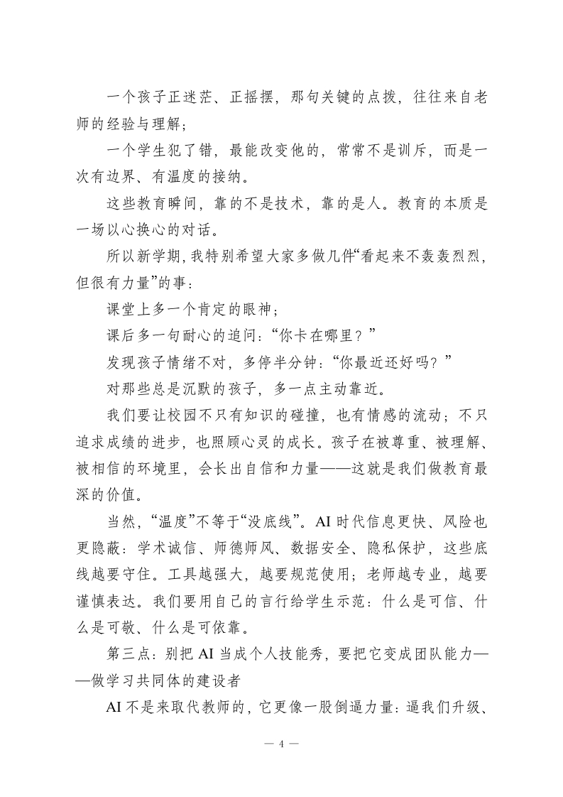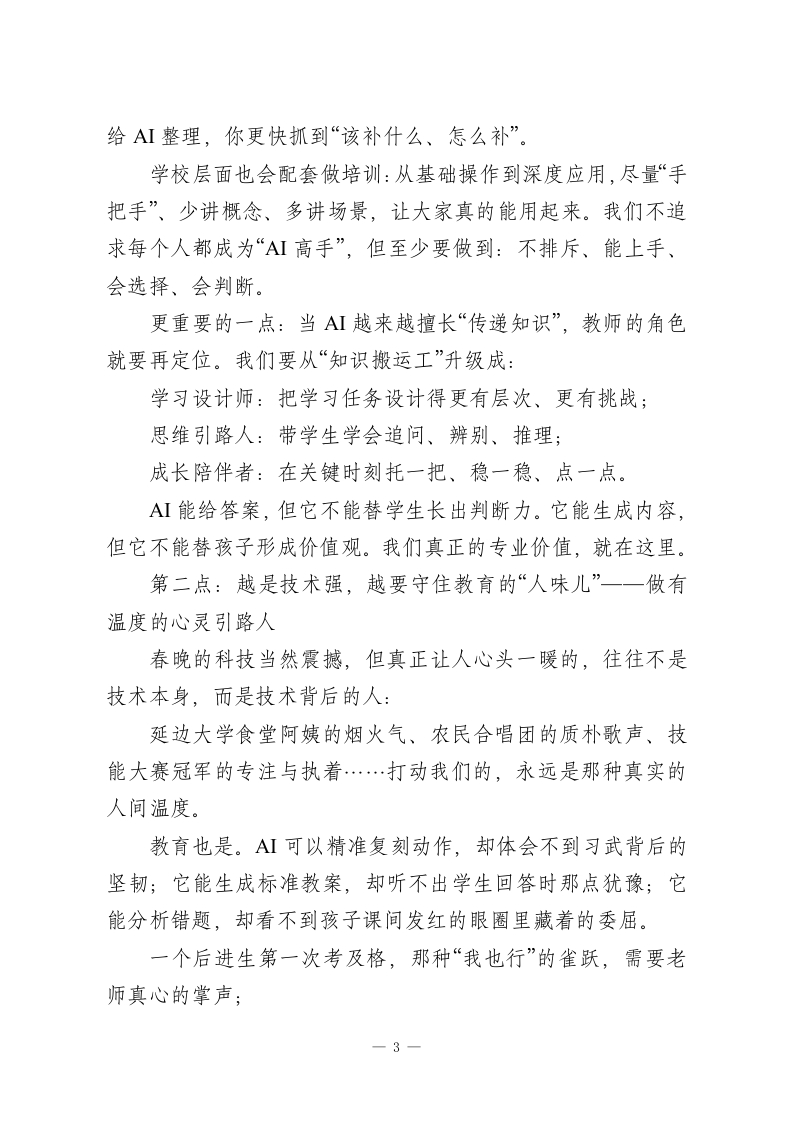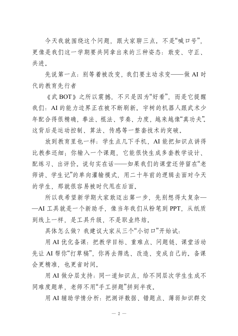 2026春季开学教师收心大会上,校长引用春晚《武BOT》讲话:机器人都会武术了,老师还能做什么?亲爱的老师们:大家上午好!春节的热乎劲儿还在,校园就已经开始“回到正轨”了。我们又在这儿见面,开启2026年春季学期。今天这场收心会,说到底就两层意思:一是把状态找回来,二是把节奏立起来。新学期不会等人,尤其开学头一周,谁先进入状态,谁就先占主动。今年是马年,马的特点大家都懂:跑起来快、冲劲足。但教育这件事,又不是一阵风的冲刺一一该快的时候要快,该稳的时候也得稳。我们一起把这股劲用对地方。我想从一个春节里的画面说起。马年春晚那个武术节目《武BOT》,大家应该都看到了:机器人和武术少年同台,一招一式、走位节奏都很“像回事”。还有春晚里各种AI工具的展示一一比如豆包的灵活应用一让人一下子明白:AI已经不是“未来的概念”,它就在我们眼前,渗到生活里、也正往教育里走。看到机器人挥剑那一刻,我相信很多老师的第一反应是惊叹;第二反应,可能就有点复杂:AI都能复刻招式、生成教案、讲知识点了,那我们老师的核心价值到底在哪?一1