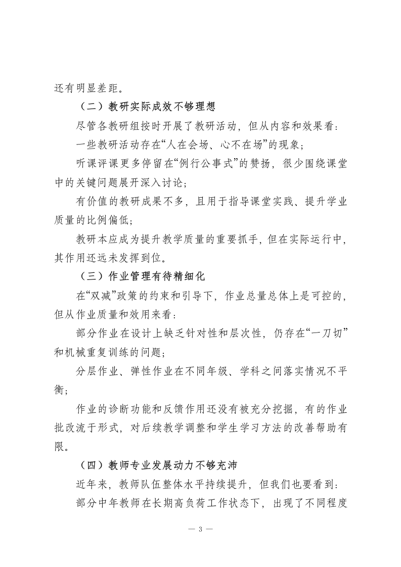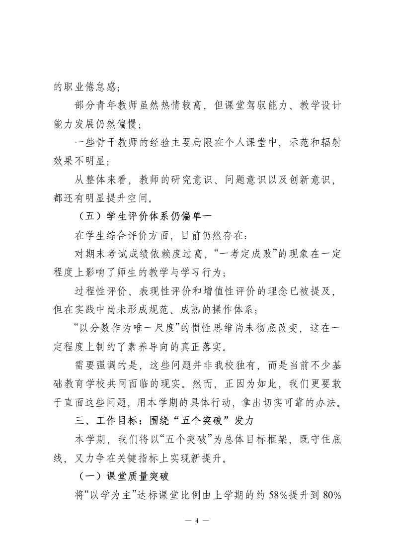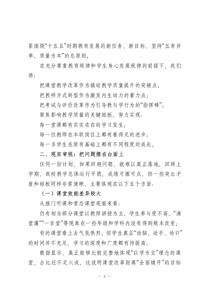 2026春季开学教职工大会校长讲话:五个突破、三条主线、四个抓手!各位老师、各位同事:2026年,对国家来说,是“十五五”规划正式落地的第一年;对教育系统来说,是“教育强国”从顶层设计走向学校教室的关键一年。在这样的时间节点上,新学期的教学工作不再只是“延续去年的节奏”,而是一次新的起跑。我们不能再用“稳稳地往前挪一挪”来安慰自己,而是要敢于直面问题,把功夫下到最能体现学校办学质量的地方一一每一节课、每一次教研、每一位教师的成长和每一个学生的变化。本学期,学校教学工作的总体定位是:坚持立德树人这一根本任务不动摇;把“提高课堂质量”作为主攻方向;把“促进教师专业发展”作为关键支撑;把“精细、务实的教学管理”作为基本保障;以“少说多做、做就做好”的工作作风,把所有理念与要求都落实到课表上、落实到课时中、落实到学生的具体成长上,让教学质量经得住数据分析、家长质询和时间检验。一、指导思想本学期教学工作,将以党的教育方针为统领,全面贯彻全国教育大会精神,认真落实新课程方案和课程标准的要求,紧1