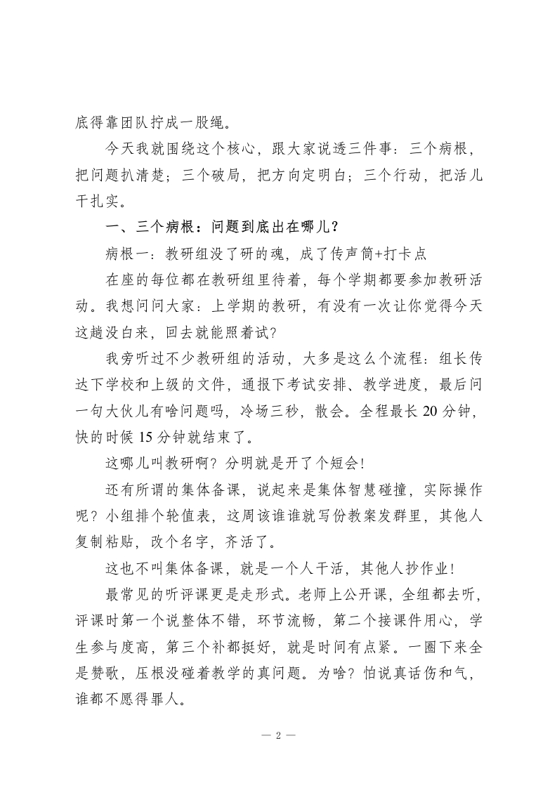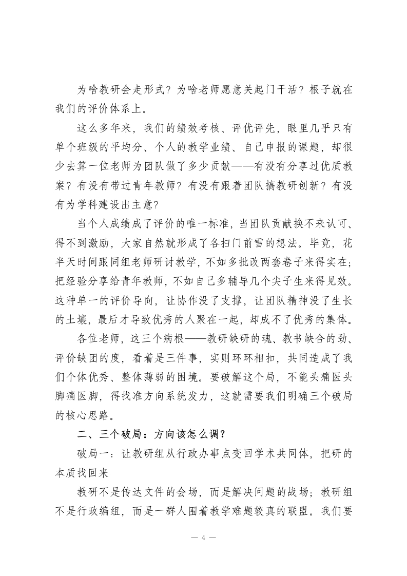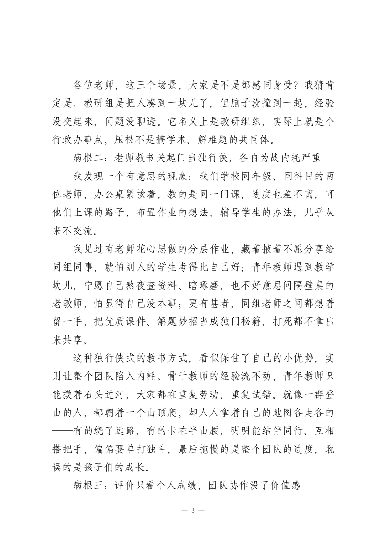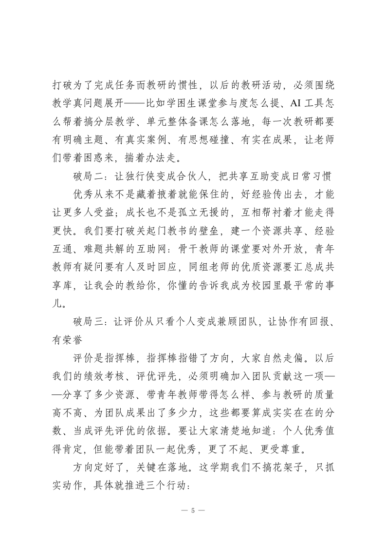 2026春季开学校长讲话:以团队之力破局,以实干之风致远各位老师:开学前跟大家聊工作,按惯例该说新学期计划,但今天我想先掏心窝子,跟大家聊聊一个藏在我心里好久、从没公开说过的困惑。我们学校的老师,单拎出来个个都不差一一有市区级的骨干教师、学科带头人,青年教师里也卧虎藏龙,大多数人干活认真、业务过硬。论个体素质,我们在全区绝对排得上号。可蹊跷的是,一旦把目光从个人拉到整体,味道就变了。年年搞教研,教学质量却像挤牙膏,进进退退没个准头,从来没有过系统性的突破;骨干教师不少,可他们的好经验、硬本事,就只在自己的课堂里发光,传不出去;青年教师成长不算慢,但大多是自己摸黑探索,走了太多本可以避免的弯路。说白了:我们不缺好老师,可就是没攒成一个顶呱呱的好团队。这话可能有点刺耳,但我摸着良心说,这是事实。这些年我观察下来,这不是我们一所学校的问题,是很多学校都有的通病。一群优秀的人凑在一起,为啥就成不了优秀的集体?这个问题不解决,后面说的课堂改革、A虹融合、评价创新,全都是空中楼阁。因为教育里没有哪件事是一个人能扛下来的,说到1