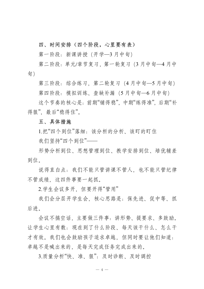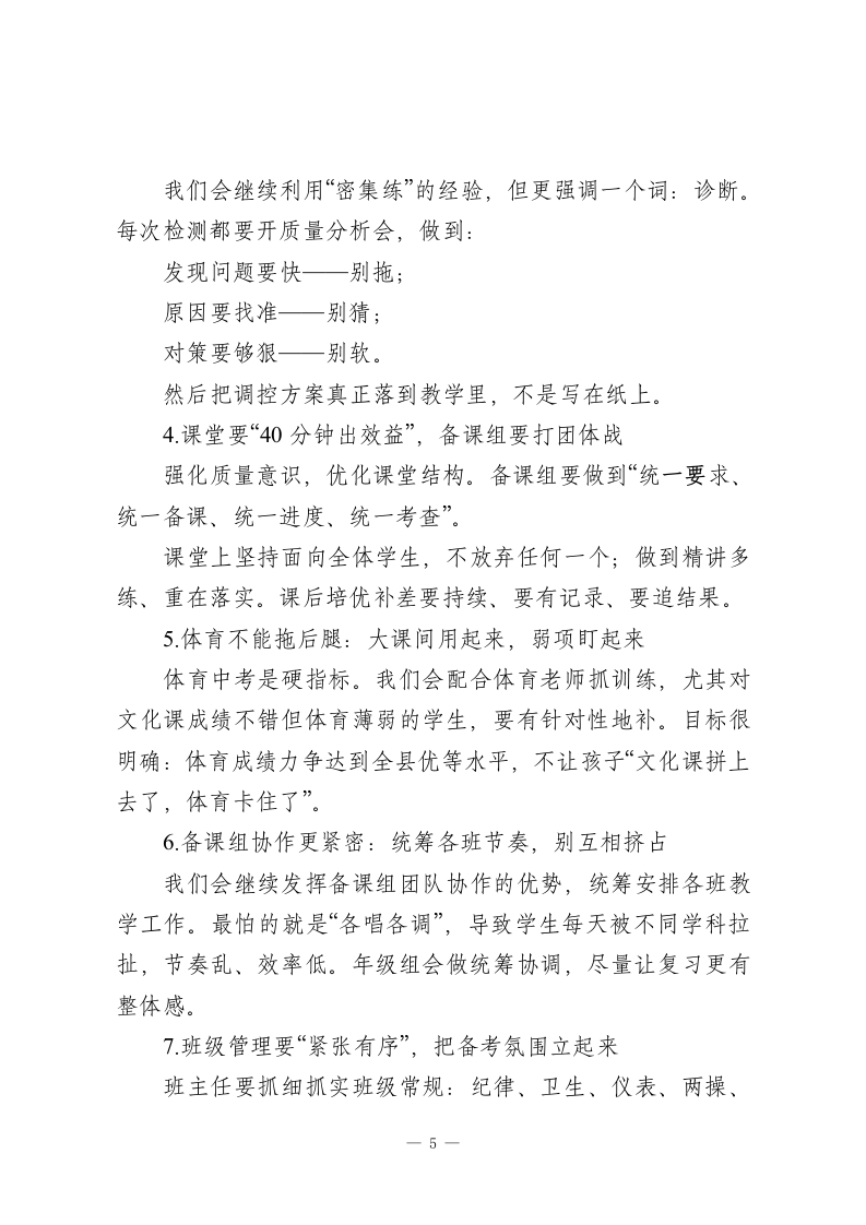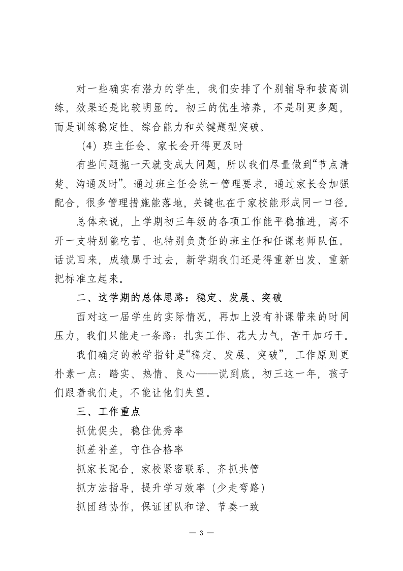 2026春季新学期,初三年级组长在九年级全体教师会上讲话:有压力才有动力各位领导、各位老师:大家下午好!新年伊始,能和大家在这里见面,我心里挺踏实,也挺感激。先允许我代表初三年级全体老师,真诚地跟一直关心我们、支持我们工作的各位领导、各位同事说一声:谢谢你们!很多事情,单靠我们年级组自己“硬扛”是扛不住的,正因为学校整体在撑着,我们才有底气往前冲。说实话,进入初三以后,我明显感觉到压力上来了。六月中考这件事,不是“远处的目标”,而是每天都在逼近的倒计时。我们这一届孩子情况大家也都清楚:基础差异大、参差不齐,再加上没有补课,时间更紧、难度更高。压力在,但我们不躲。今天我想把上学期的工作做个梳理,也把这学期的安排和想法向大家汇报一下,请大家多提建议、也请多指导。一、上学期我们主要做了几件事1先把团队拧成一股绳:热情、敬业、能协作初三最大的特点就是“事多、节奏快、问题密集”。我们很清楚,靠单打独斗不可能赢,所以年级组会开得比较勤一一不是为了开会而开会,而是为了把每一阶段的教学情况、学生状态、纪律问题、家校矛盾这些都摆到桌面上说清楚。大家做得特别好的一点是:有成绩大家愿意分享、有困难-1